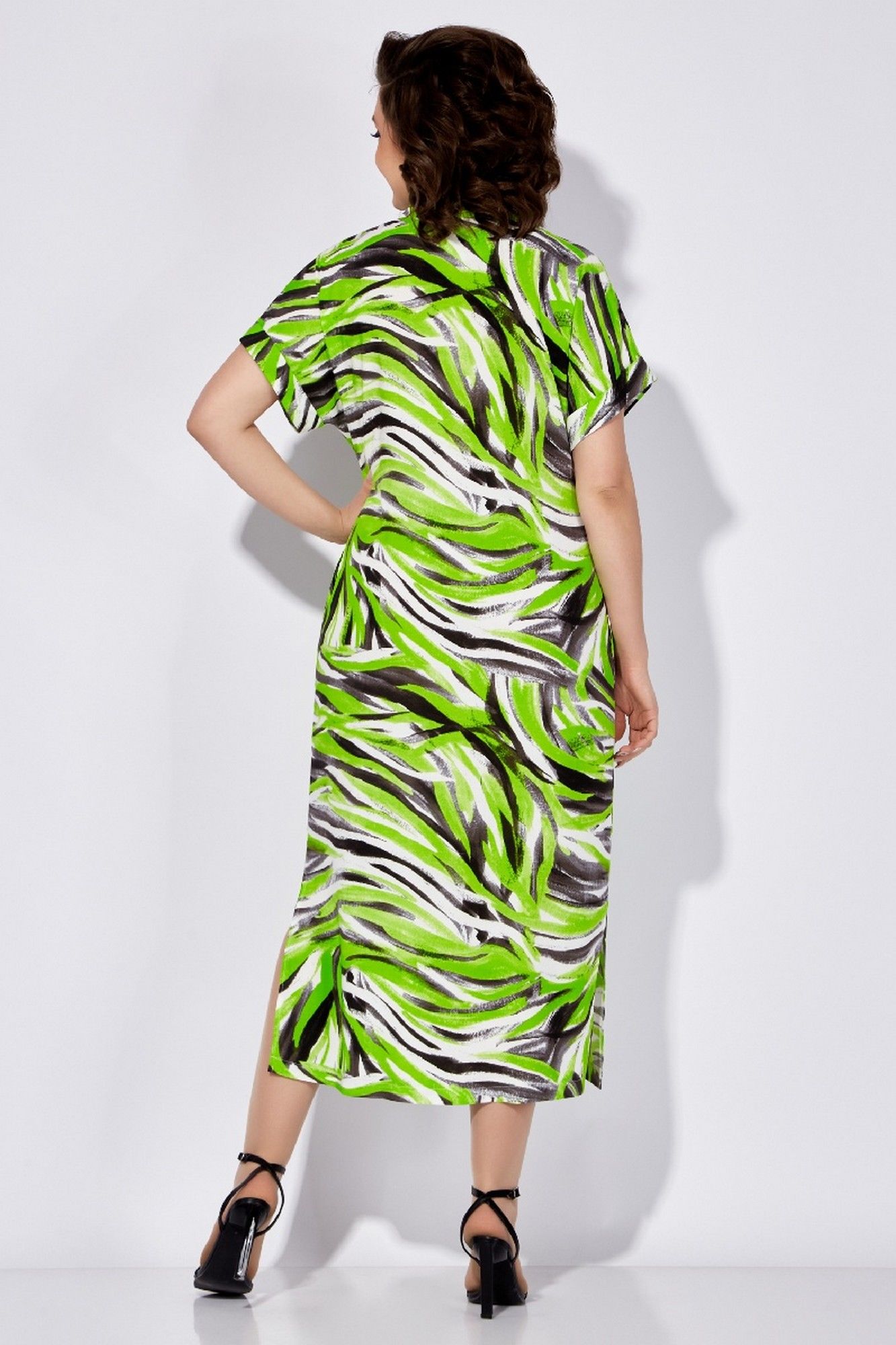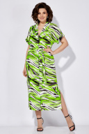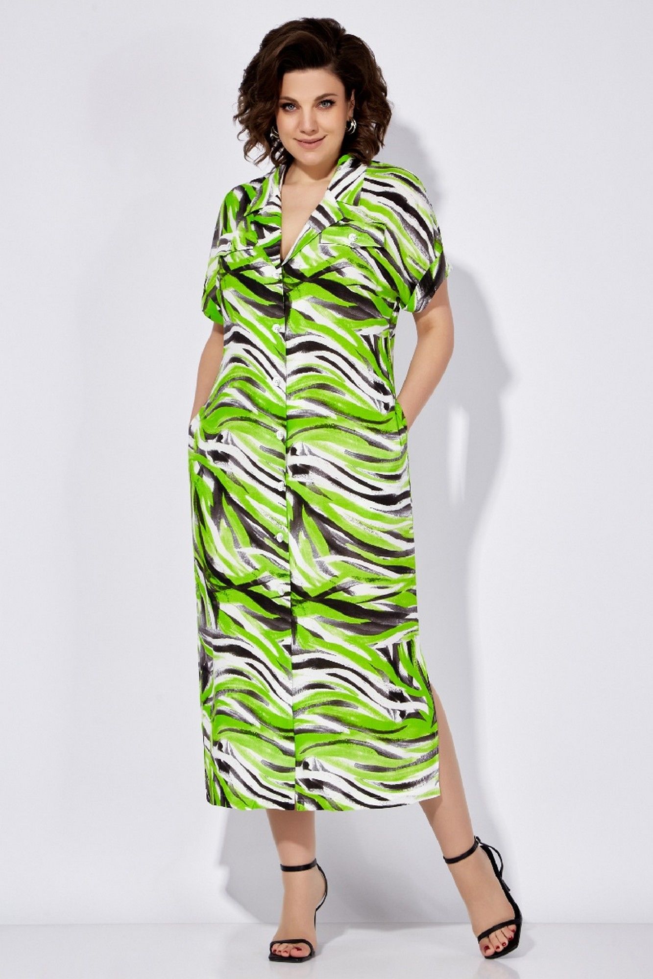 Платье женское полуприлегающего силуэта, выполнено из штапельной ткани с актуальным ярким принтом. Застёжка центральная однобортная на 7 петель и пуговиц, по горловине обработан стояче-отложной воротник с небольшими лацканами. Рукава цельнокроеные короткие с притачной отложной манжетой. По переду настрочены декоративные клапаны с пришитыми на них пуговицами. В боковых швах обработаны функциональные потайные карманы. В комплекте идёт съёмный пояс. Дл. платья-127 см , дл. рукава- 21 см .