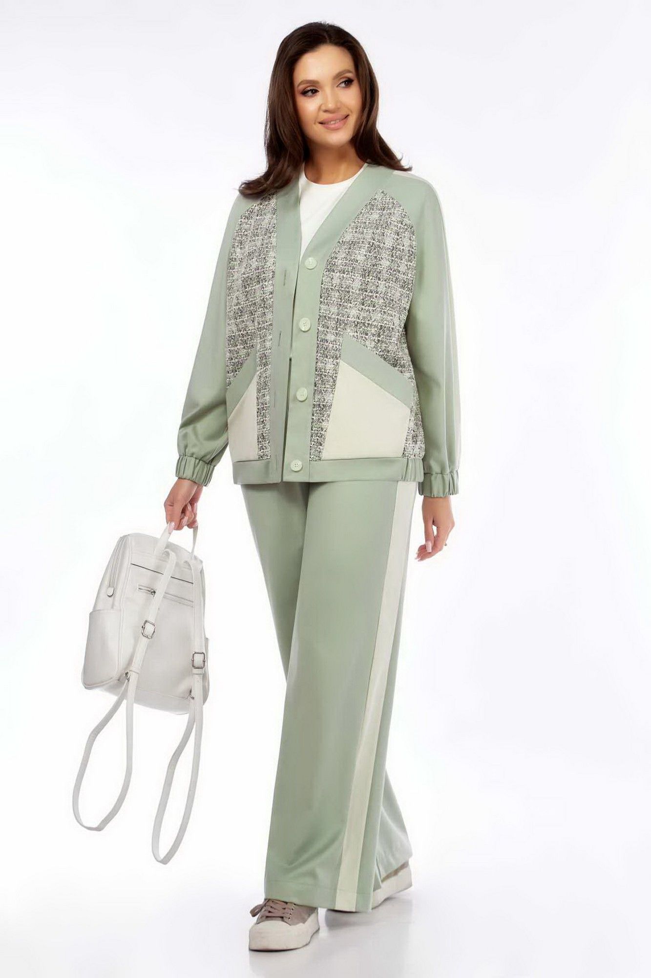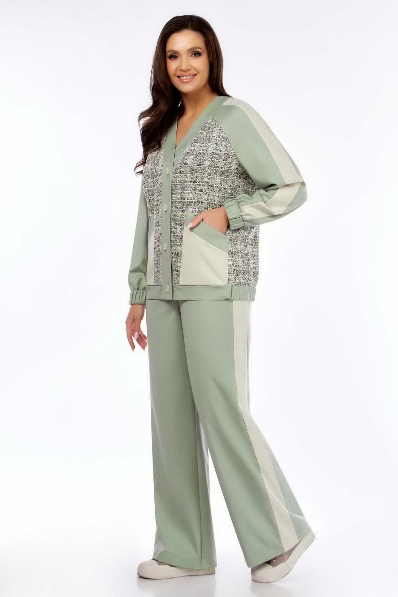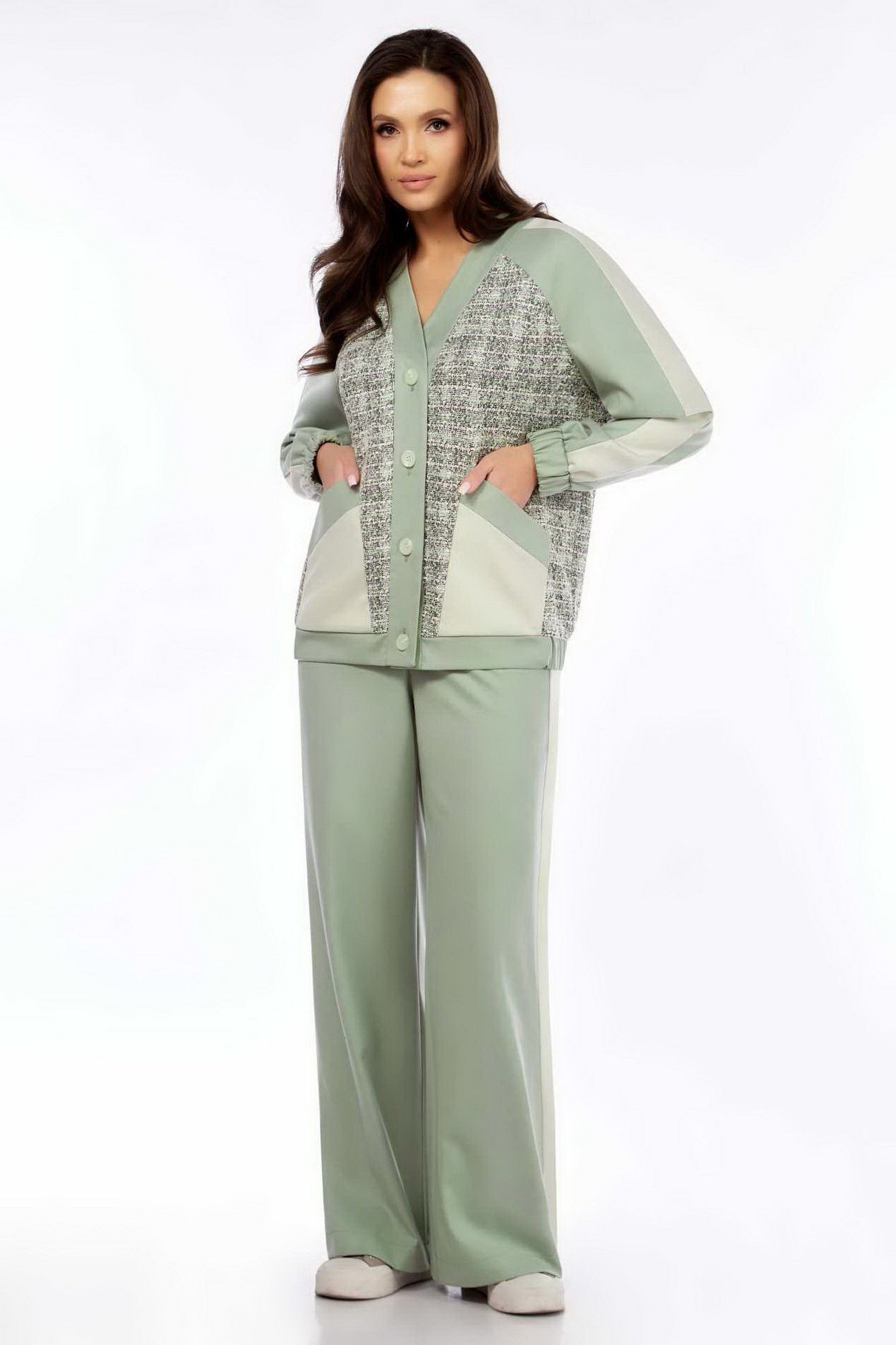 Костюм брючный в стиле "Спортшик", выполнен из нескольких видов ткани. Джемпер свободного кроя, удлинённый. Горловина V-образной формы . Рукава покроя "Реглан", длинные, с декоративной лампасой и притачной манжетой на резинке. Застёжка центральная на четыре петли и пуговицы с притачной планкой. По переду в области талии обработаны функциональные накладные карманы. По низу изделия притачная манжета, сзади на резинке.Брюки прямые , по бокам с лампасами. По талии обработан притачной пояс, по бокам и сзади на резинке. Дл. джемпера - 65 см., дл. рукава - 62 см.