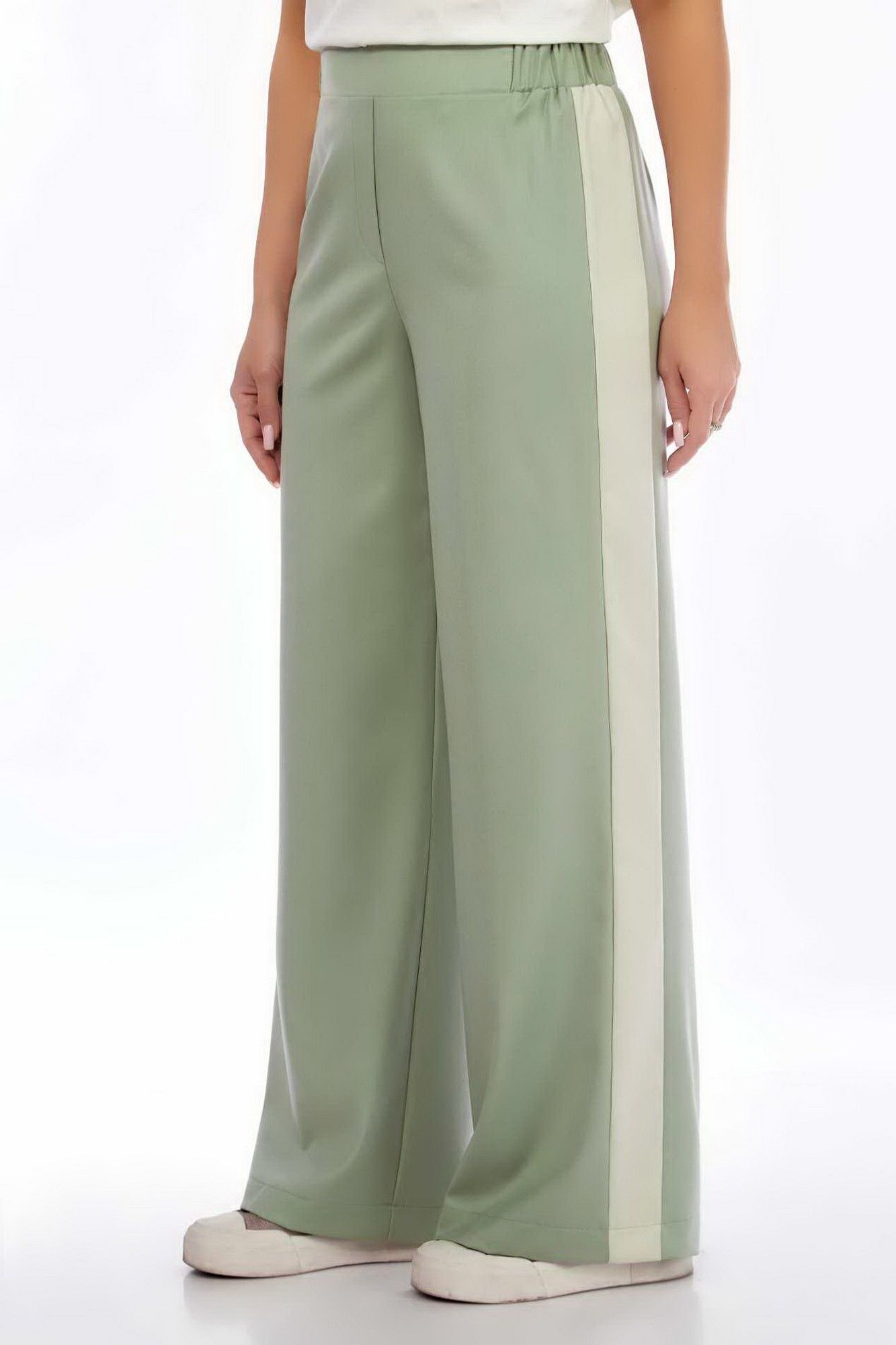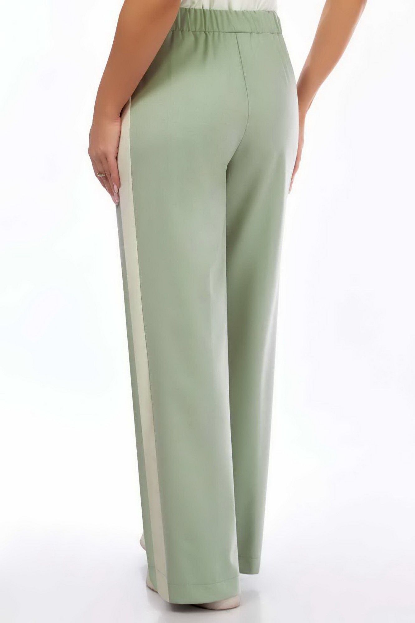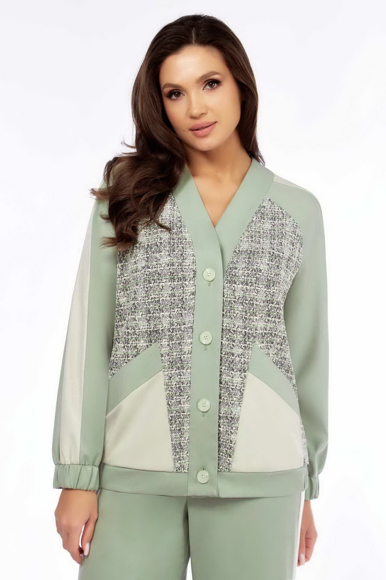 Костюм брючный в стиле "Спортшик", выполнен из нескольких видов ткани. Джемпер свободного кроя, удлинённый. Горловина V-образной формы . Рукава покроя "Реглан", длинные, с декоративной лампасой и притачной манжетой на резинке. Застёжка центральная на четыре петли и пуговицы с притачной планкой. По переду в области талии обработаны функциональные накладные карманы. По низу изделия притачная манжета, сзади на резинке.Брюки прямые , по бокам с лампасами. По талии обработан притачной пояс, по бокам и сзади на резинке. Дл. джемпера - 65 см., дл. рукава - 62 см.
