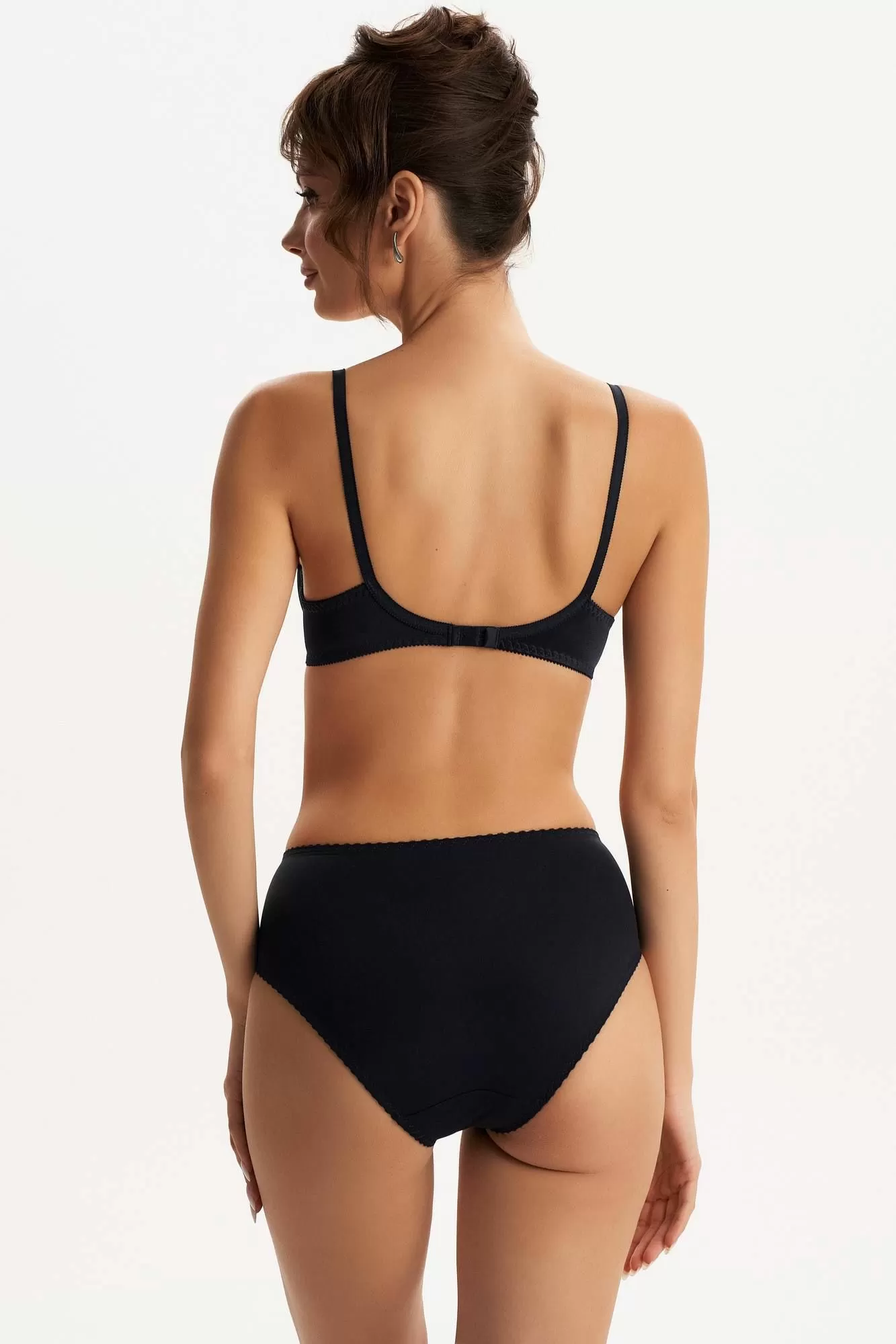 Бюстгальтер с мягкой чашкой, выполненный из эластичного трикотажного полотна и декорированный вышивкой. Есть боковая поддерживающая деталь, обеспечивающая дополнительное приподнимание груди. В модели присутствуют каркасы ("косточки"). Бретели регулируются по длине. Ширина бретелей увеличивается пропорционально увеличению размера (1,0 см, 1,5 см, 2,0 см, 2,5 см).