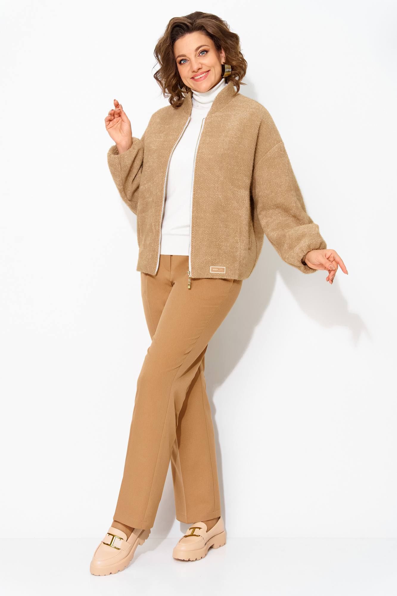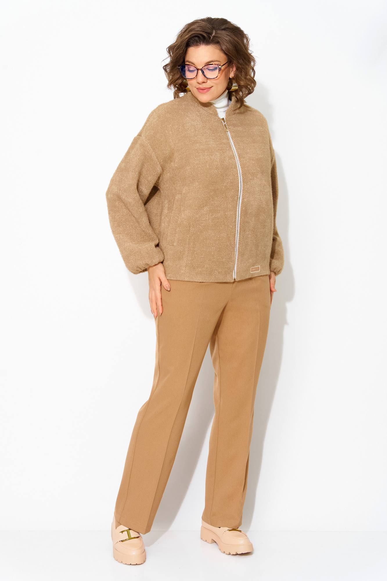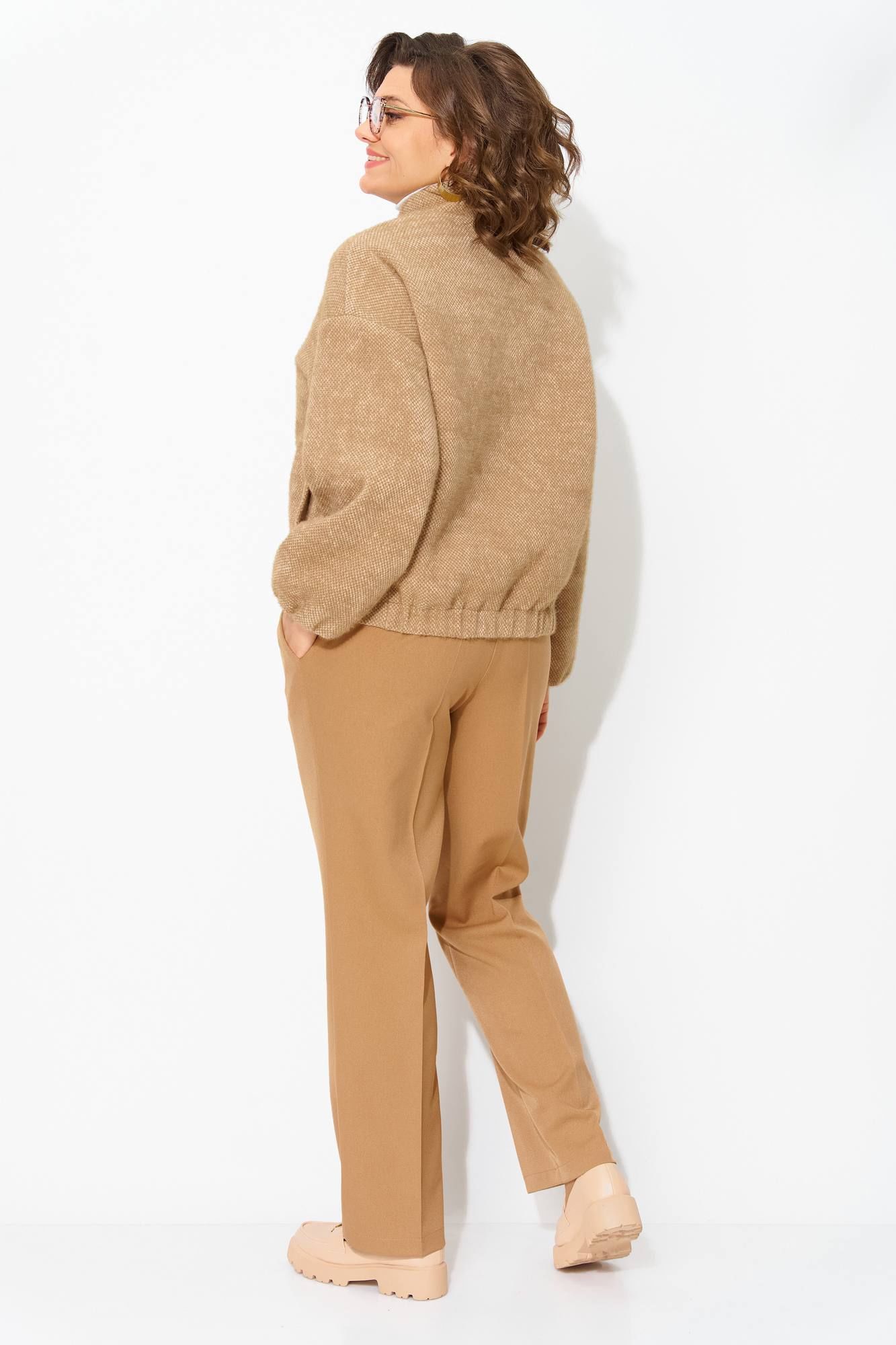 Утепленный буклированный жакет, по типу бомбера – стильная женская одежда на каждый день, которая станет отличным дополнением повседневного гардероба. Модель свободного силуэта, со спущенной линией плеча. Застежка центральная на молнию. Низ рукава присборен на резинку. По спинке также предусмотрена резинка для комфортного прилегания. Жакет поставлен на подкладку, имеются прорезные карманы! Свободная оверсайз модель подходит практически под любую фигуру. Классические женские брюки, со средней посадкой, прямого покроя от бедра. Застежка – брючная тесьма-молния с обработанным гульфиком. Карманы боковые. Пояс притачной, в боковых участках вставлена резинка на свободу. По переду заутюжены канты. Спинка с Талиевыми выточками. Подгибка брюк –– 4 см. Длина брюк – 104 см. Длина по спинке – 68-65 ми, рукав – 62 см.