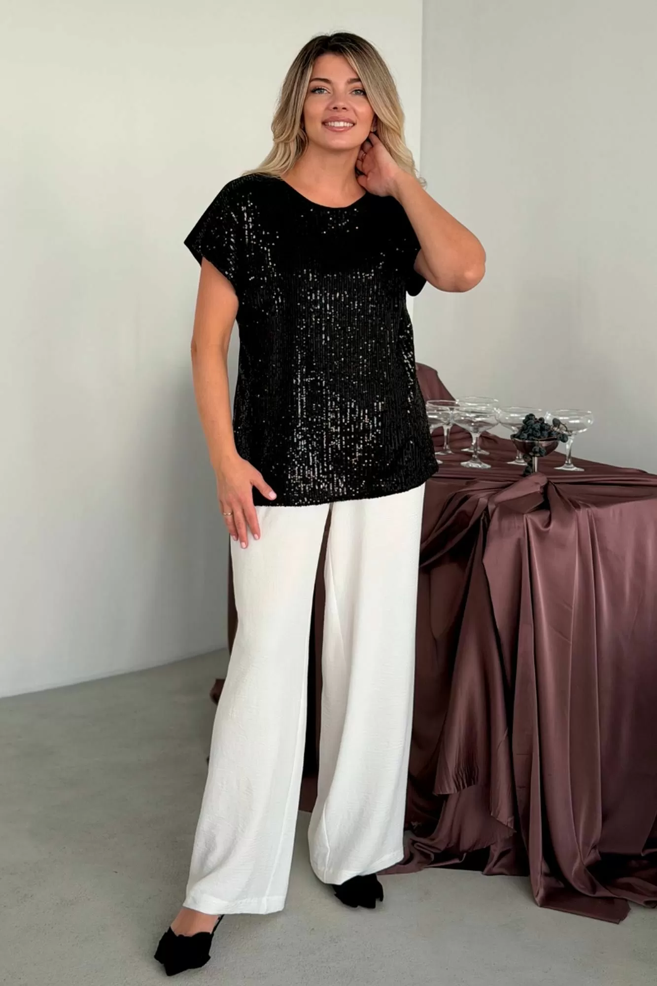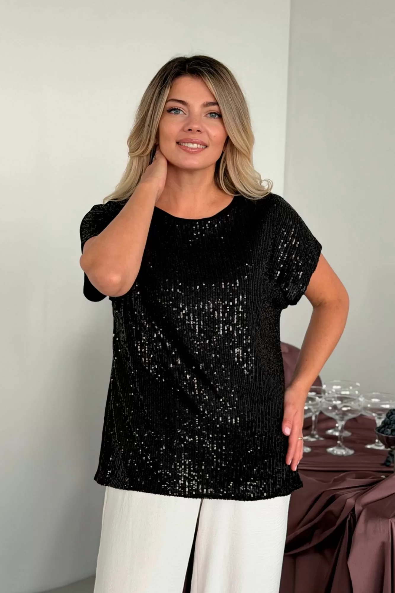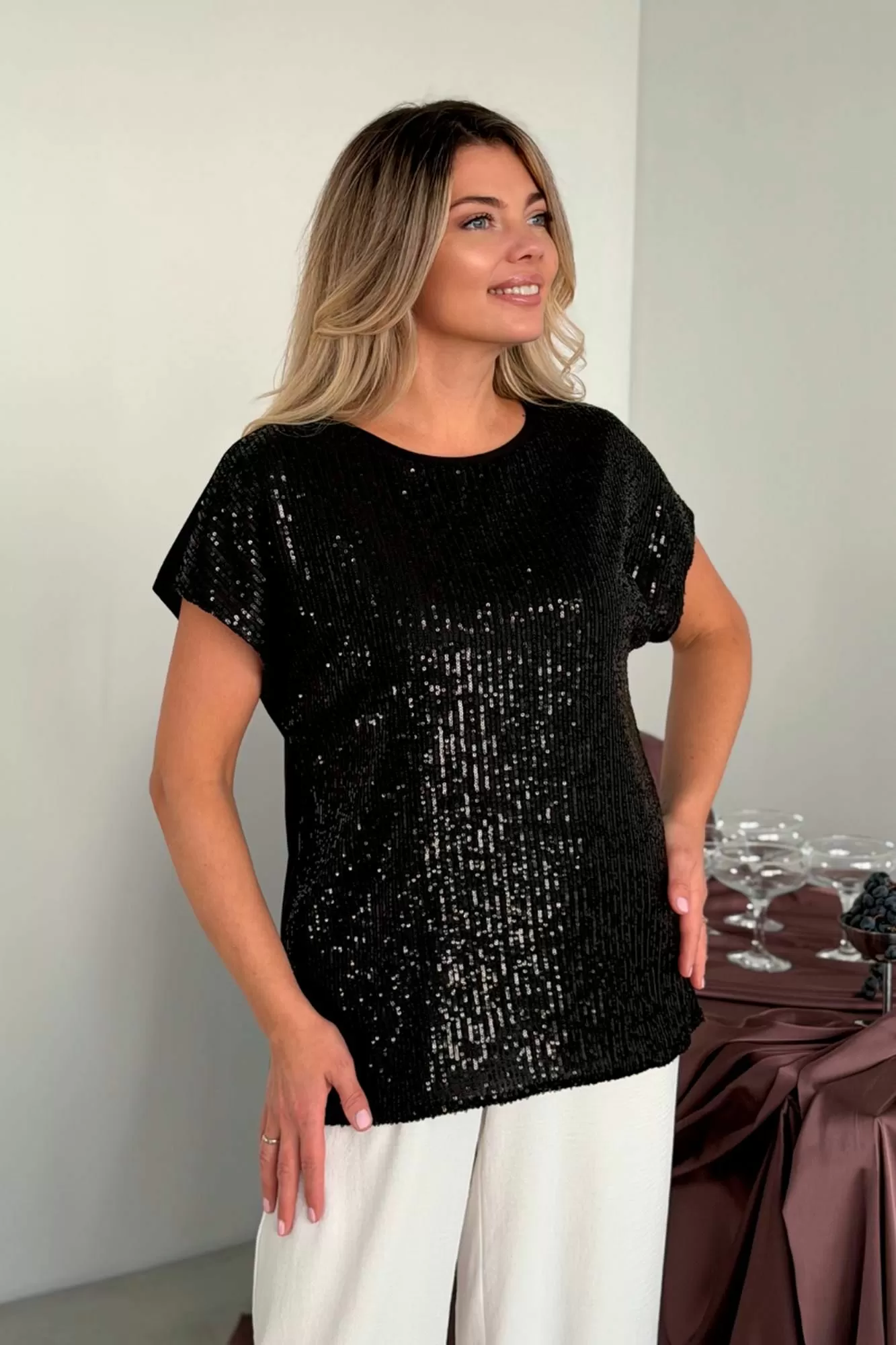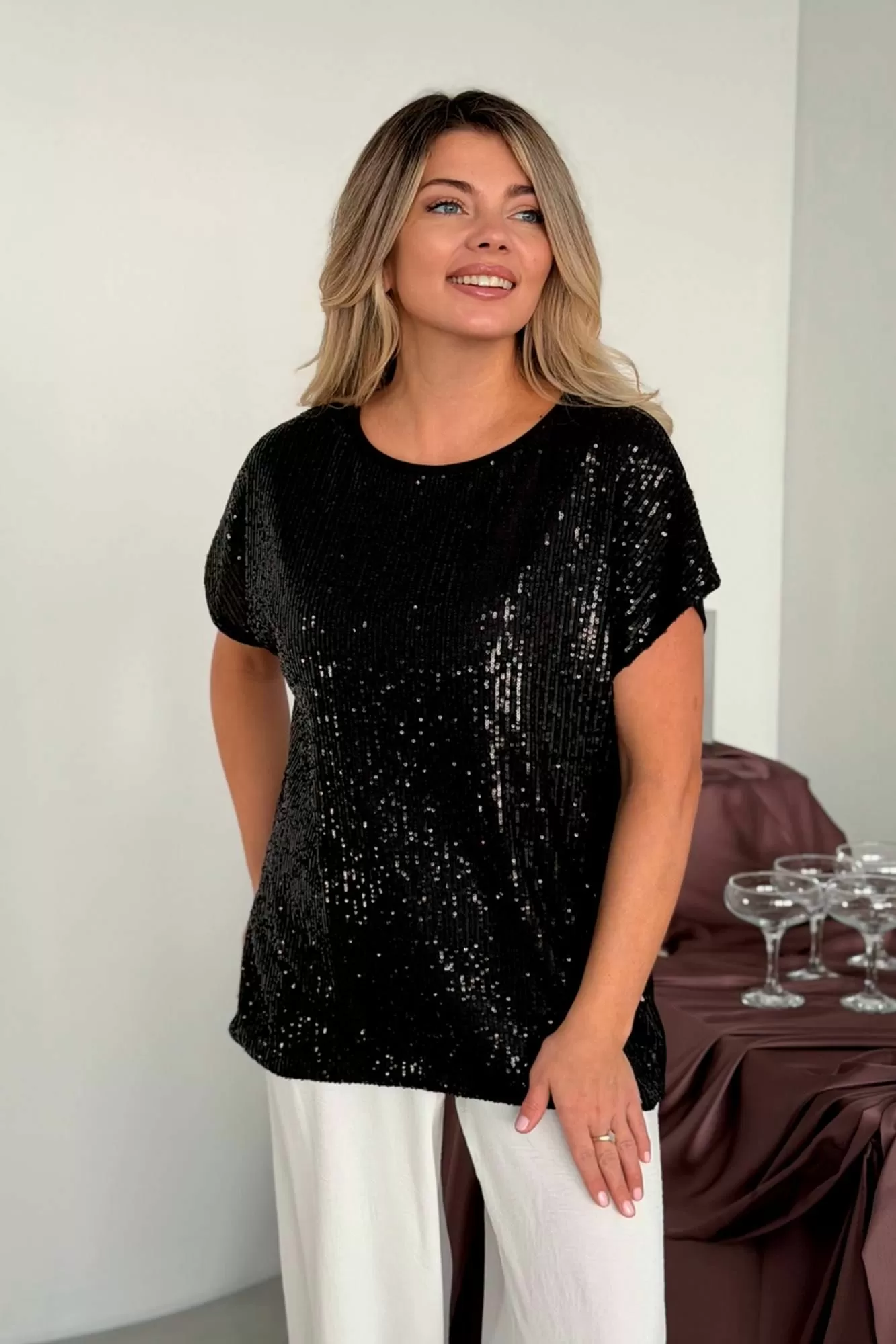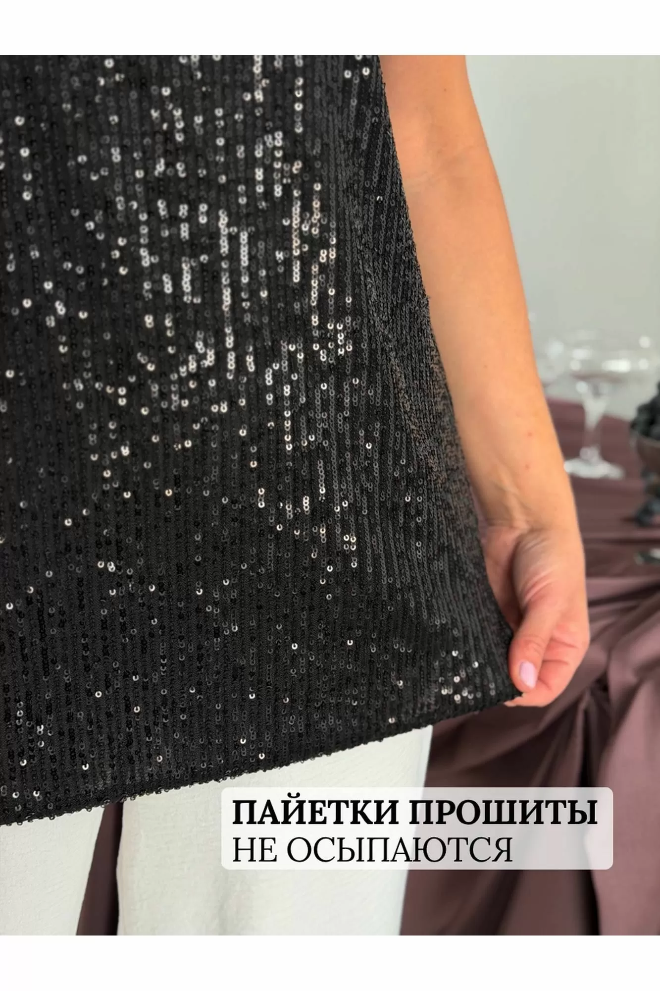 Сверкающий топ футболка блузка майка с пайетками с узором с гипюром решает проблему нарядного вечернего образа: на выход на выпускной, на танцы, дискотеку на пляжную вечеринку, на корпоратив, на свидание, в ресторан на тусовку на день рождения на свадьбу на новый год. Нарядные топики выполнены из тянущейся немнущейся ткани, деталь переда выполнена из пайеток, спинка из однотонного масла-трикотаж. что делает эту вещь максимально комфортной и универсальной. Сочетай с джинсами и юбками, с классическими брюками с завышенной талией, с туфлями на каблуке и со спортивным стилем, топ под пиджак. Топ с блестками как вечерний наряд, как коктейльный наряд, праздничный образ, как повседневный Casual стиль.