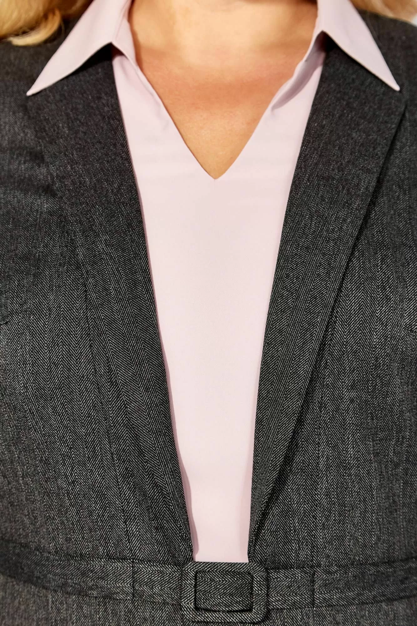 Повседневное текстильное дресс-код платье полуприлегающего силуэта на рост 164 см. Рукав втачной длинный. Вырез горловины V-образный, воротник рубашечный с отрезной стойкой. Перед платья с бочками и нагрудными вытачками. Спинка со средним швом и шлицей. По талии спереди вшит пояс с обтяжной пряжкой.