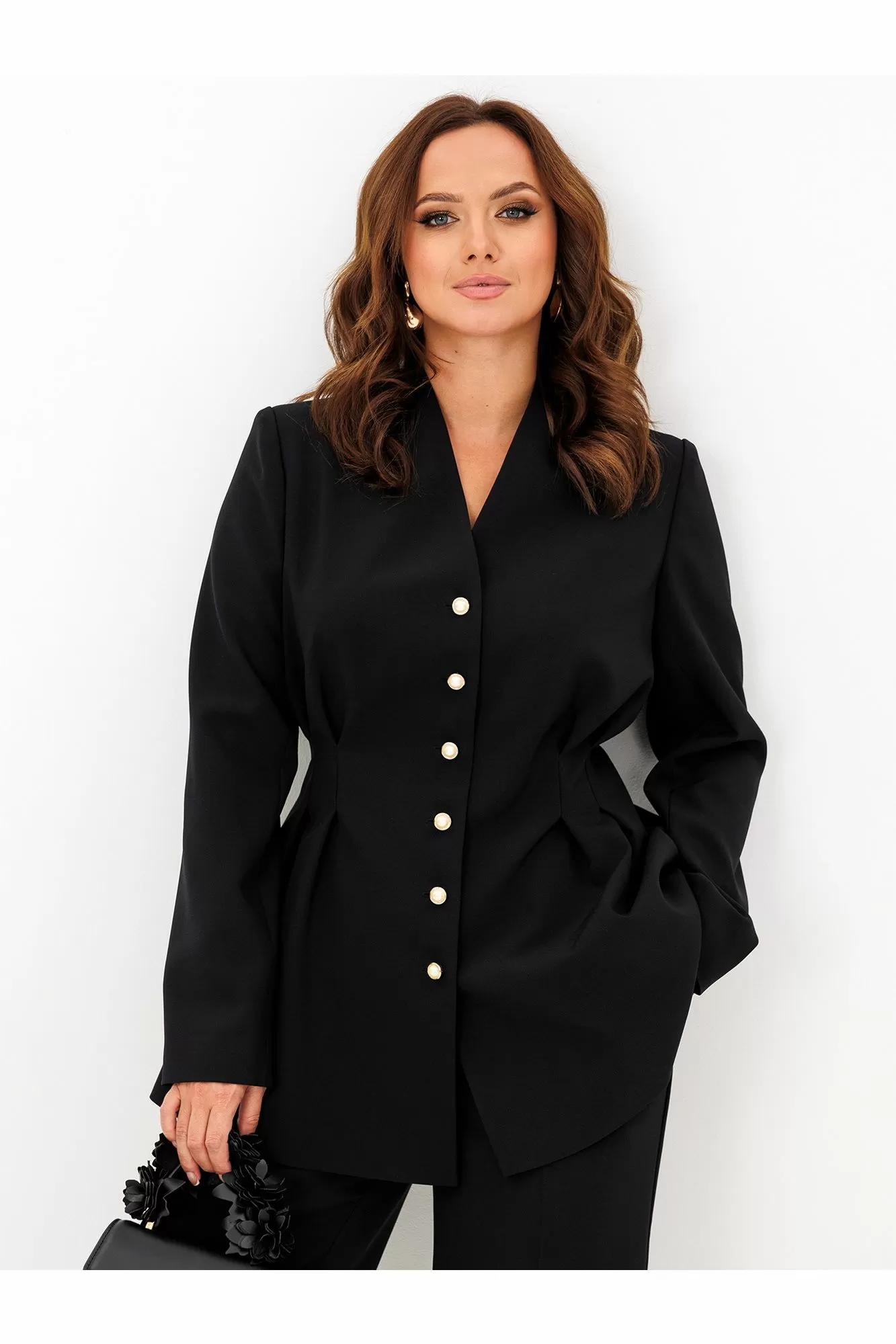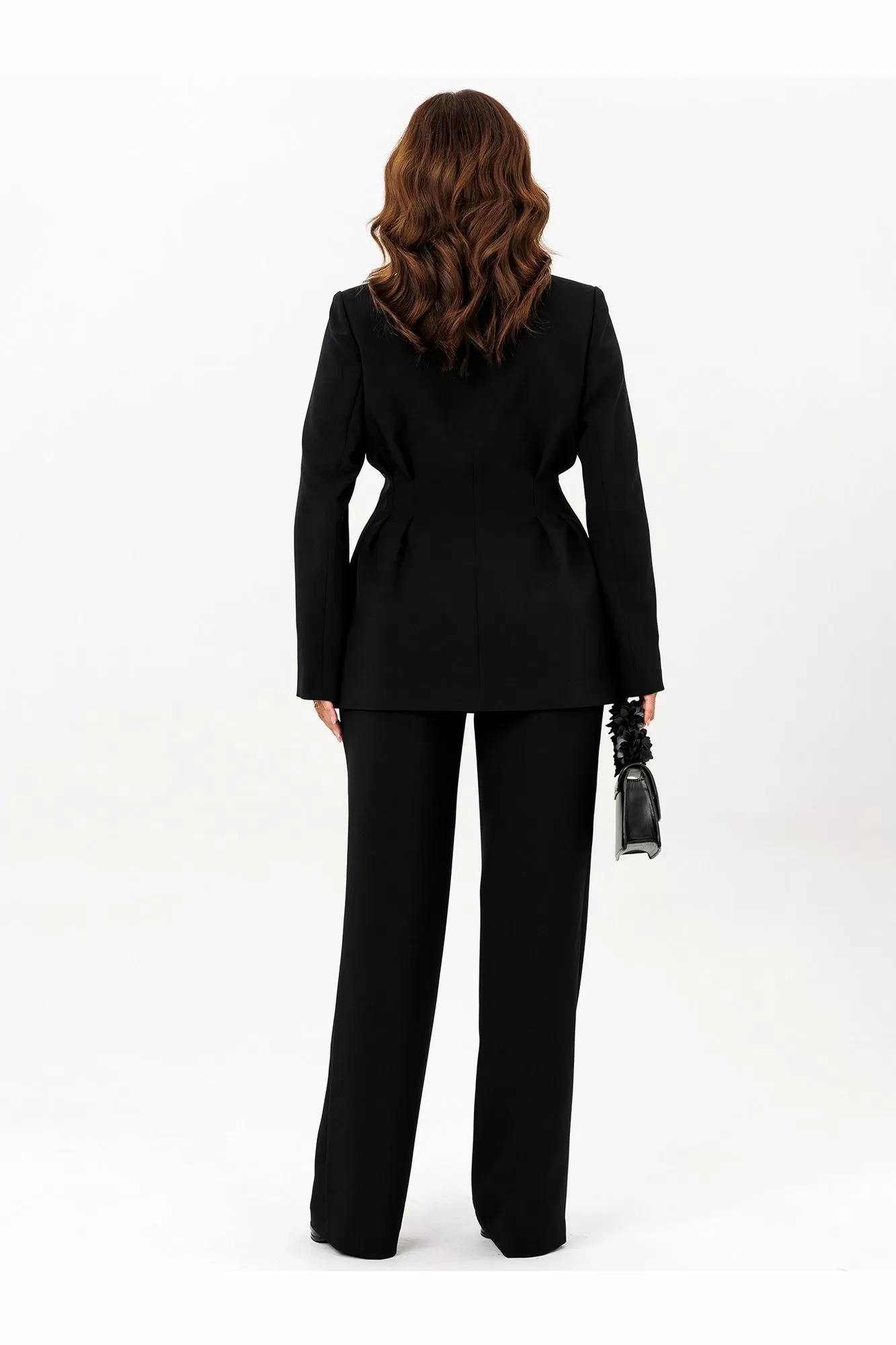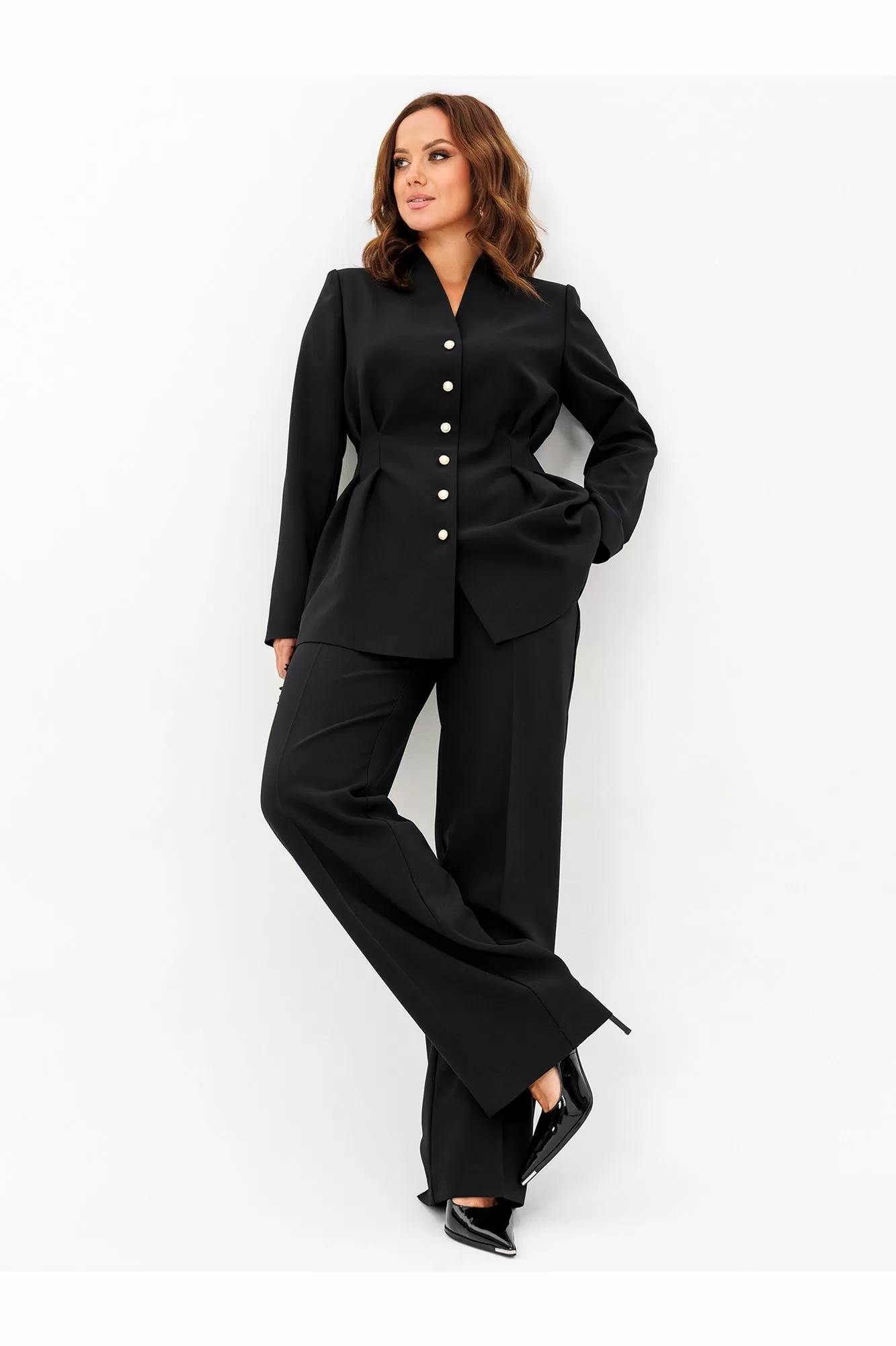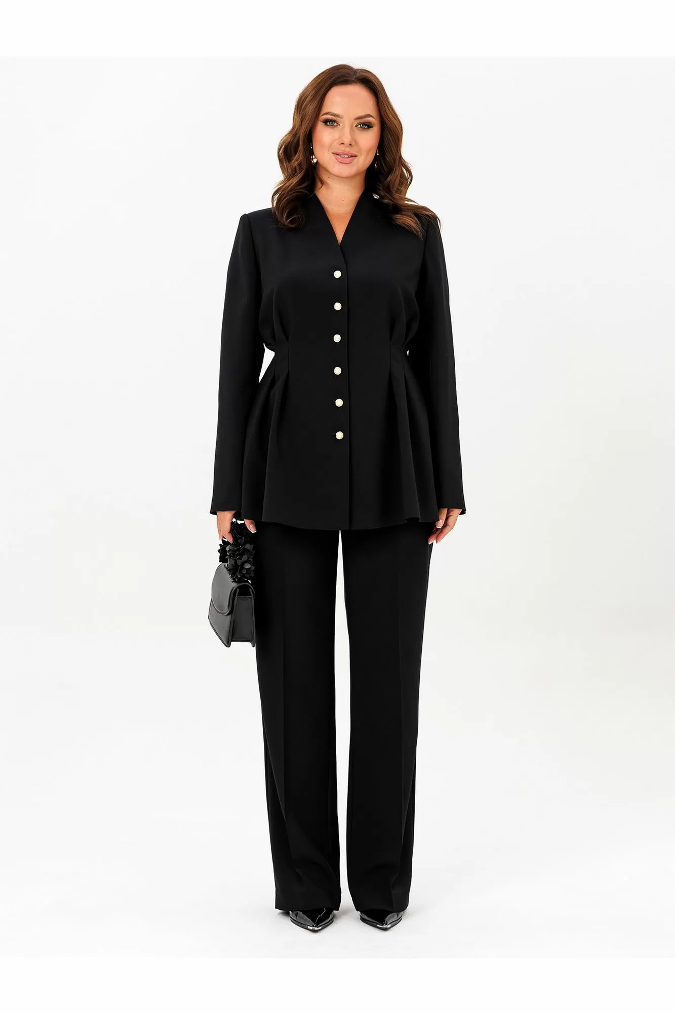 Жакет выполнен из костюмной ткани. Жакет Х-образного силуэта, длиной чуть ниже линии бёдер. Спереди центральная застежка на петли и пуговицы. По переду и спинке в области талии заложены складки. Спинка со средним швом. Воротник - цельнокроеная стойка. Рукав втачной двух шовный. Жакет на подкладке. Брюки прямого кроя. На передних половинках небольшая складка, переходящая в стрелку. Верхний срез брюк обработан притачным поясом, по бокам вставлена резинка, имеются шлёвки под ремень. Застёжка брюк по типу «гульфик». В боковых швах карманы «хулиганы». На задних половинках брюк вытачки.