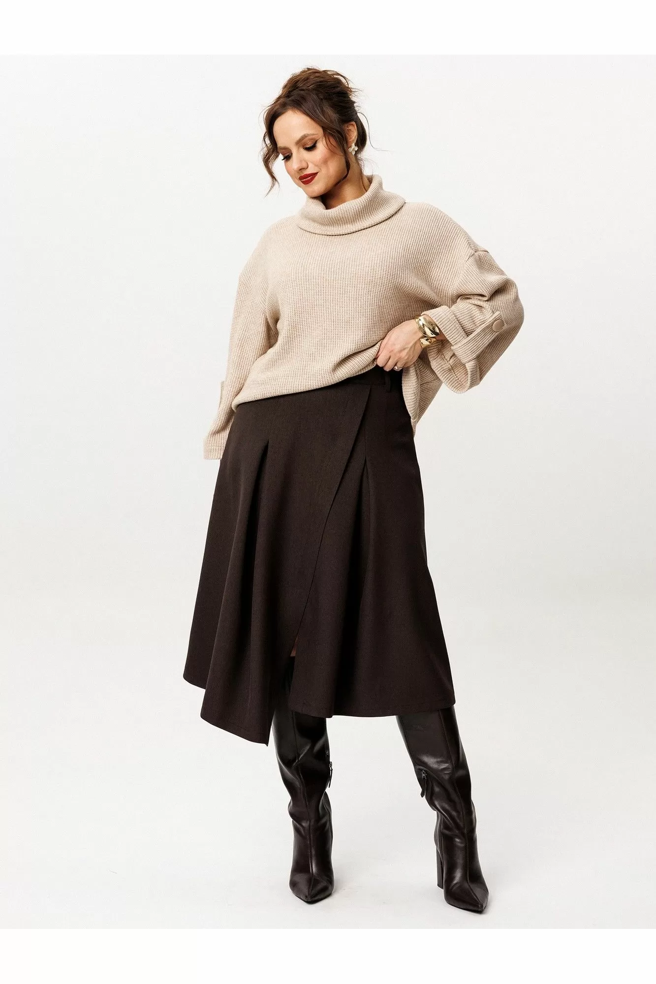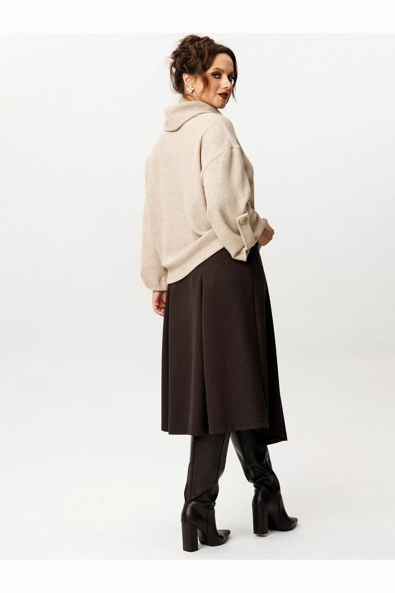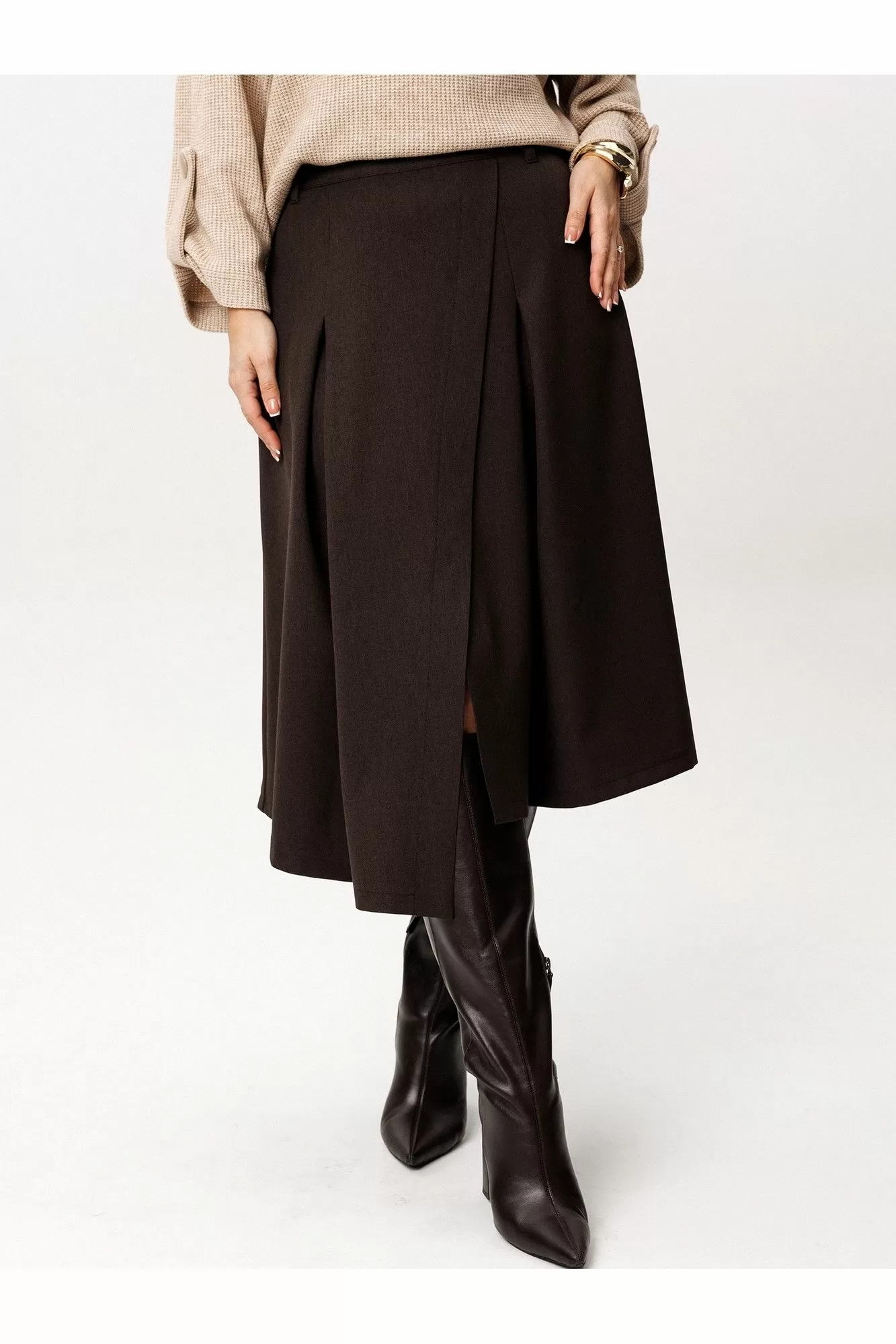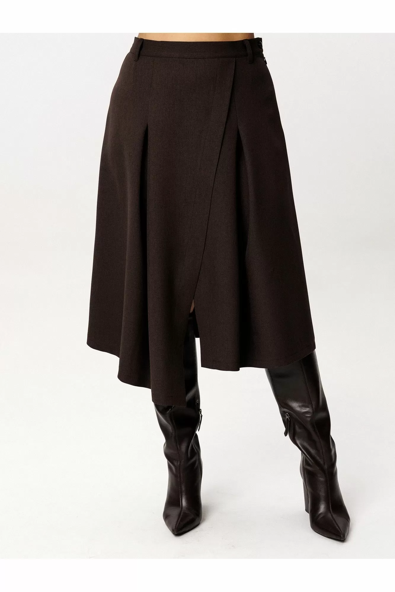 Юбка А-силуэта. По переду и по задней половинке встречные складки. Перед юбки ассиметричный. В боковой шов вставлена потайная молния. Верх юбки обработан притачным поясом со шлёвками, который застёгивается на петлю и пуговицу.