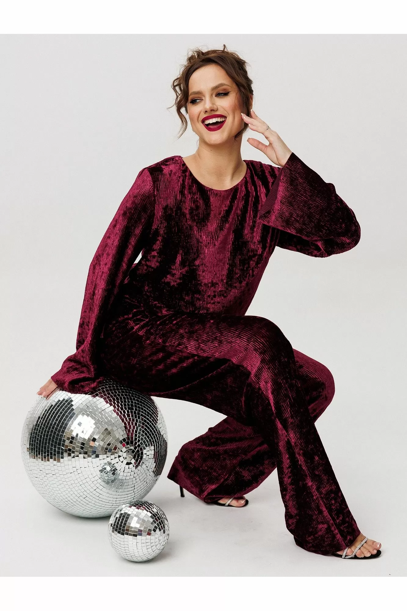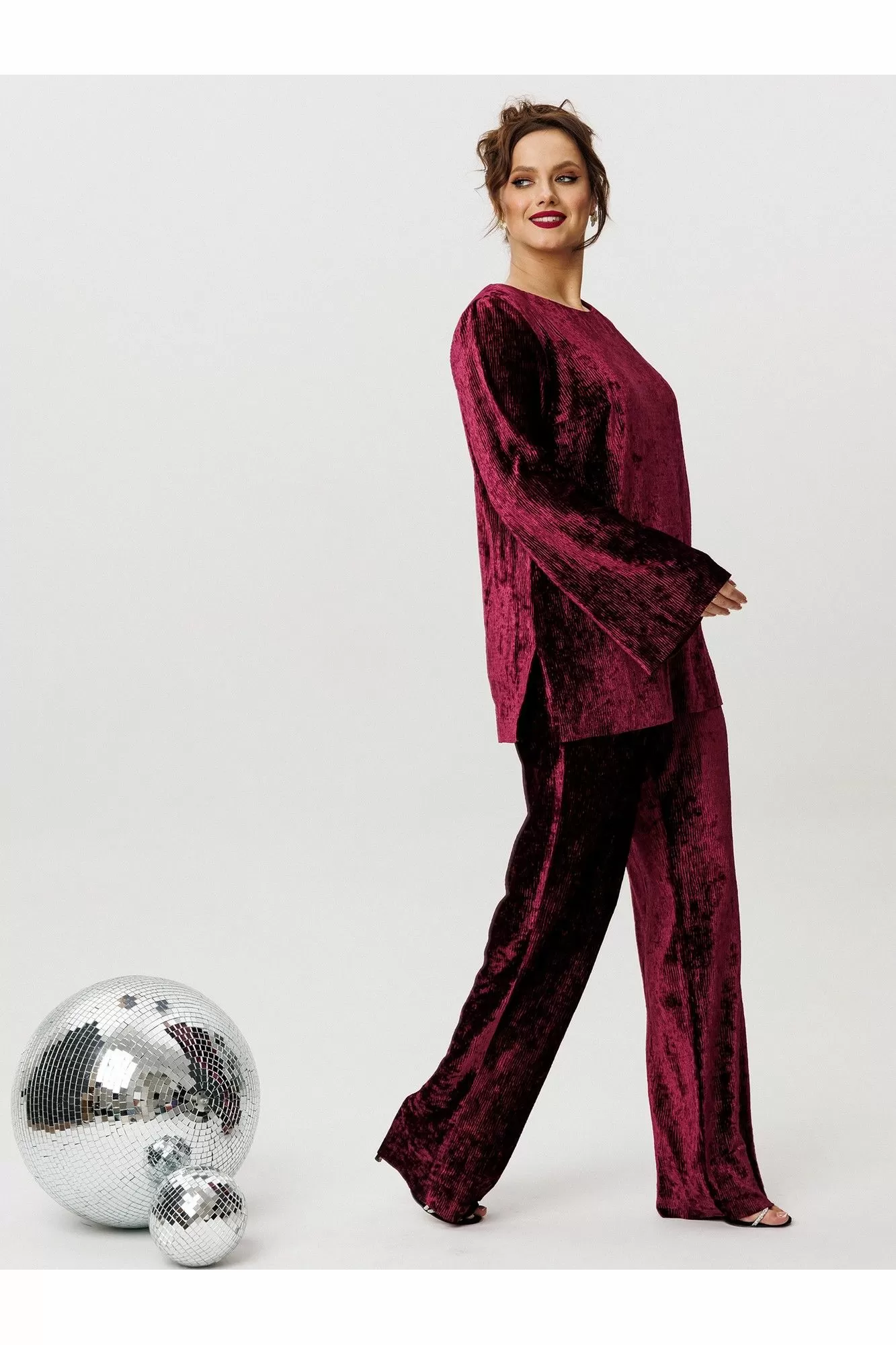 Костюм выполнен из крэш бархата. Блуза свободного силуэта. Горловина округлой формы обработана обтачкой. Рукав втачной, расклешённый к низу. По переду блузы нагрудные выточки, по боковым швам разрезы. Брюки прямого силуэта. Верх брюк на притачном поясе с эластичной тесьмой. В боковых швах карманы с наклонным входом.
