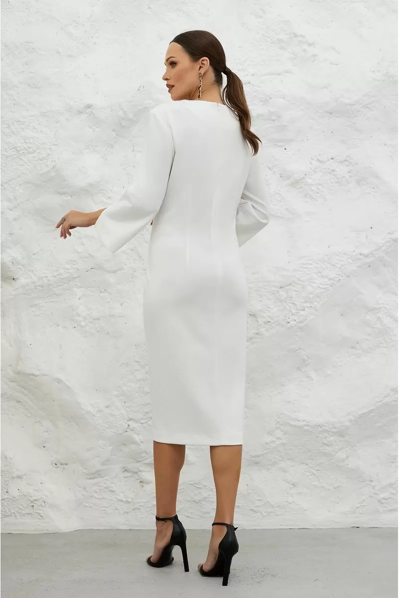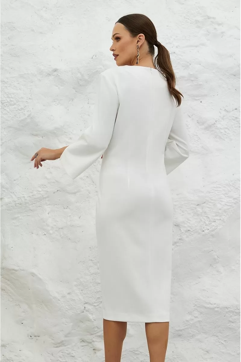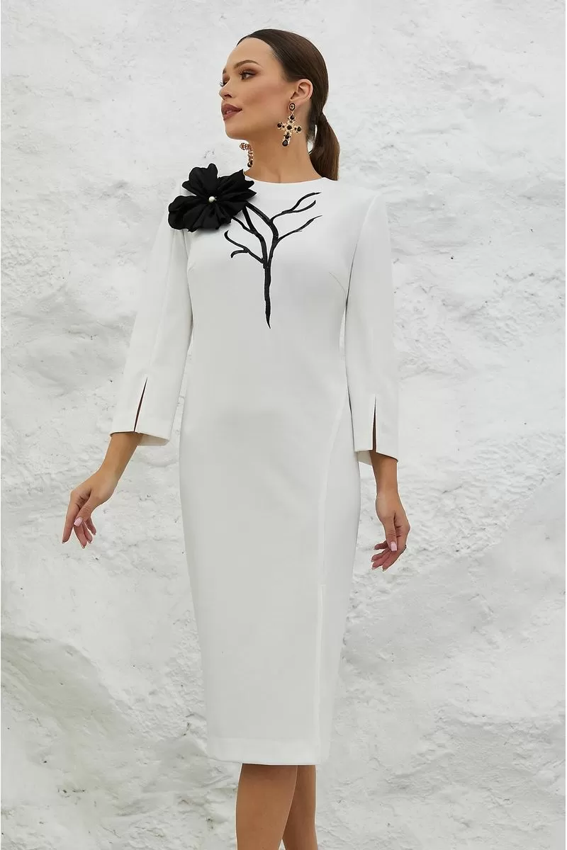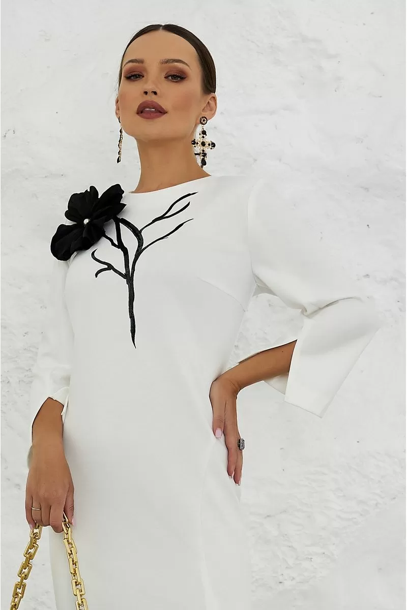 Эффектное дизайнерское платье с разрезом по переду украшено авторской вышивкой и съемным декором ручной работы отлично подойдет на все случаи жизни. Брошь цветок выполнена вручную из нежного шелк атласа с матовым блеском. Платье полуприлегающего силуэта с округлым вырезом выполнено из мягкого трикотажа, ткань отлично тянется и очень приятная к телу. Перед оформлен нагрудными вытачками и отрезной деталью по боку с разрезом, спинка со средним швом и талиевыми вытачками. Застежка на короткую потайную молнию в среднем шве спинки. Рукав втачной с разами по переду.