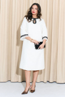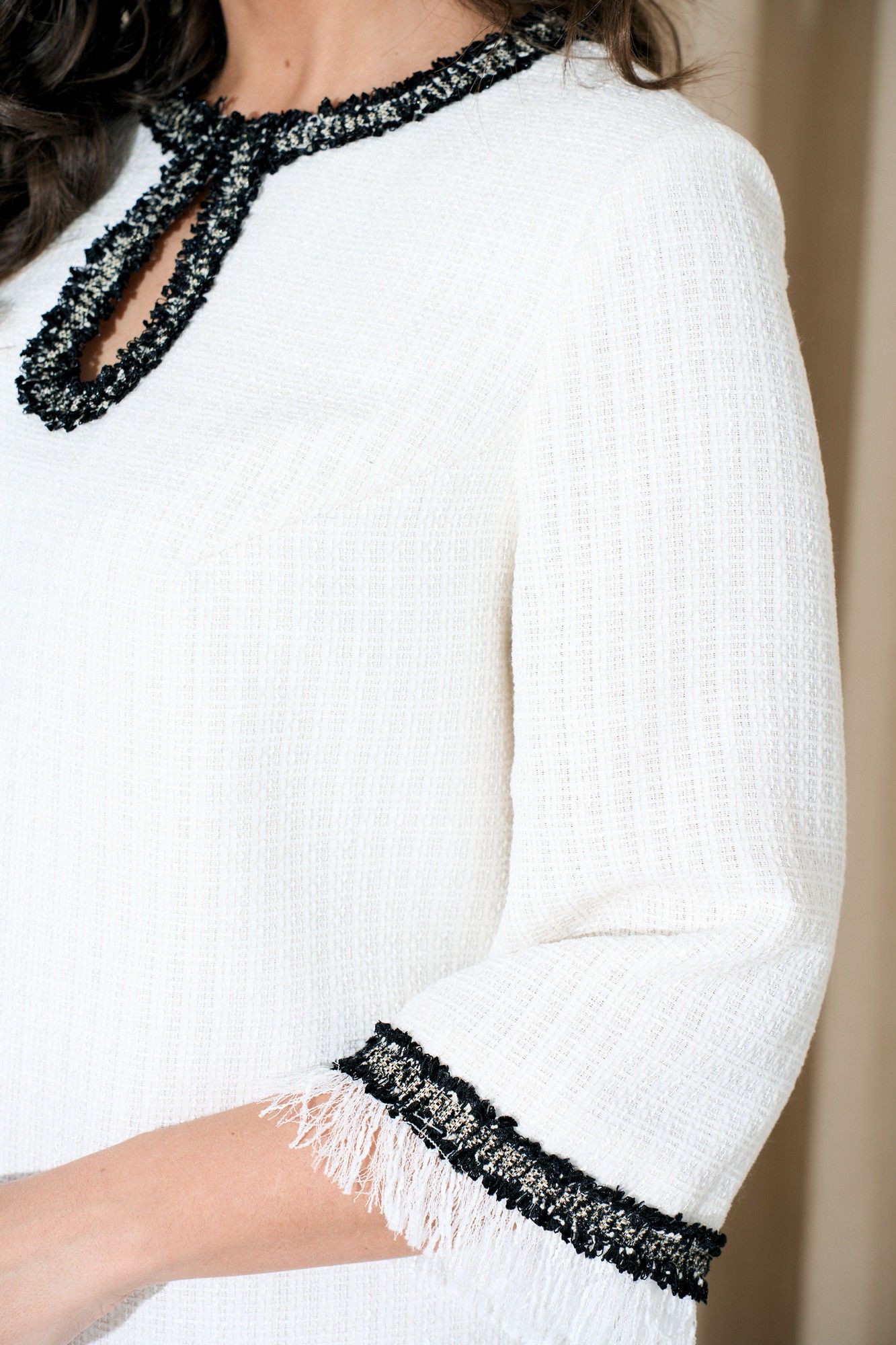 Платье с декоративным вырезом горловины. Спинка с талиевыми вытачками и потайной молнией в среднем шве. Рукава втачные, с бахромой по низу. Изделие с декоративной тесьмой по горловине и низу рукавов. Платье на подкладке по переду и спинке. ВОЗМОЖНА ЗАМЕНА ФУРНИТУРЫ НА АНАЛОГИЧНУЮ ТАКОГО ЖЕ КАЧЕСТВА.
