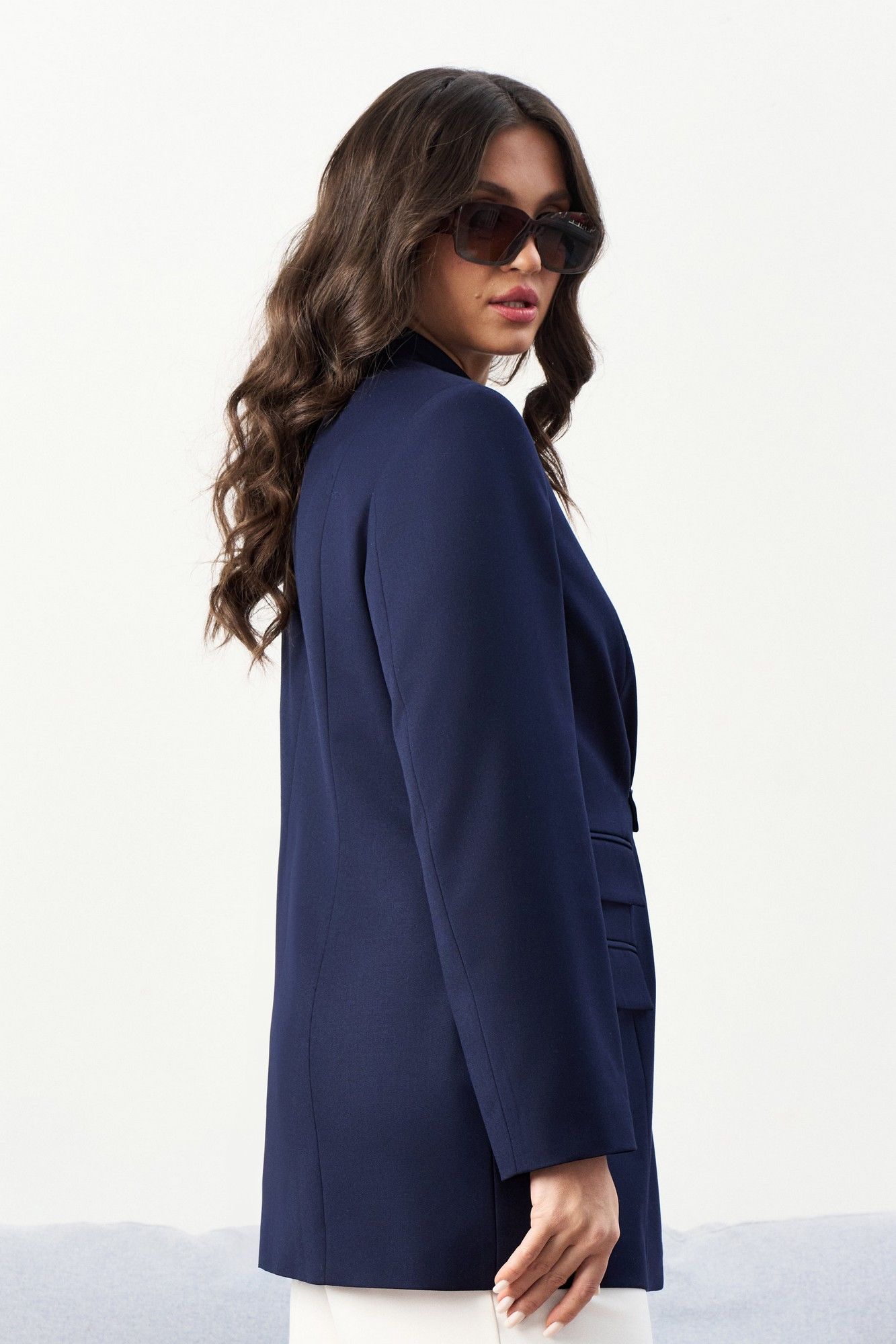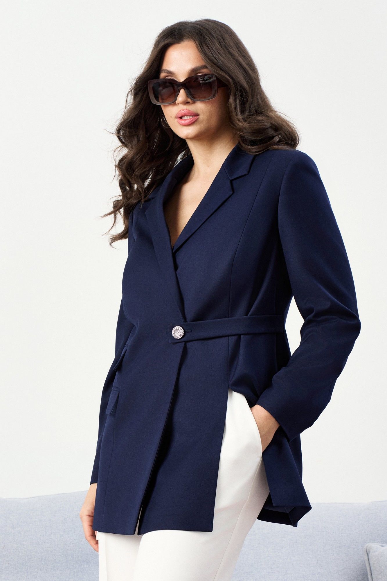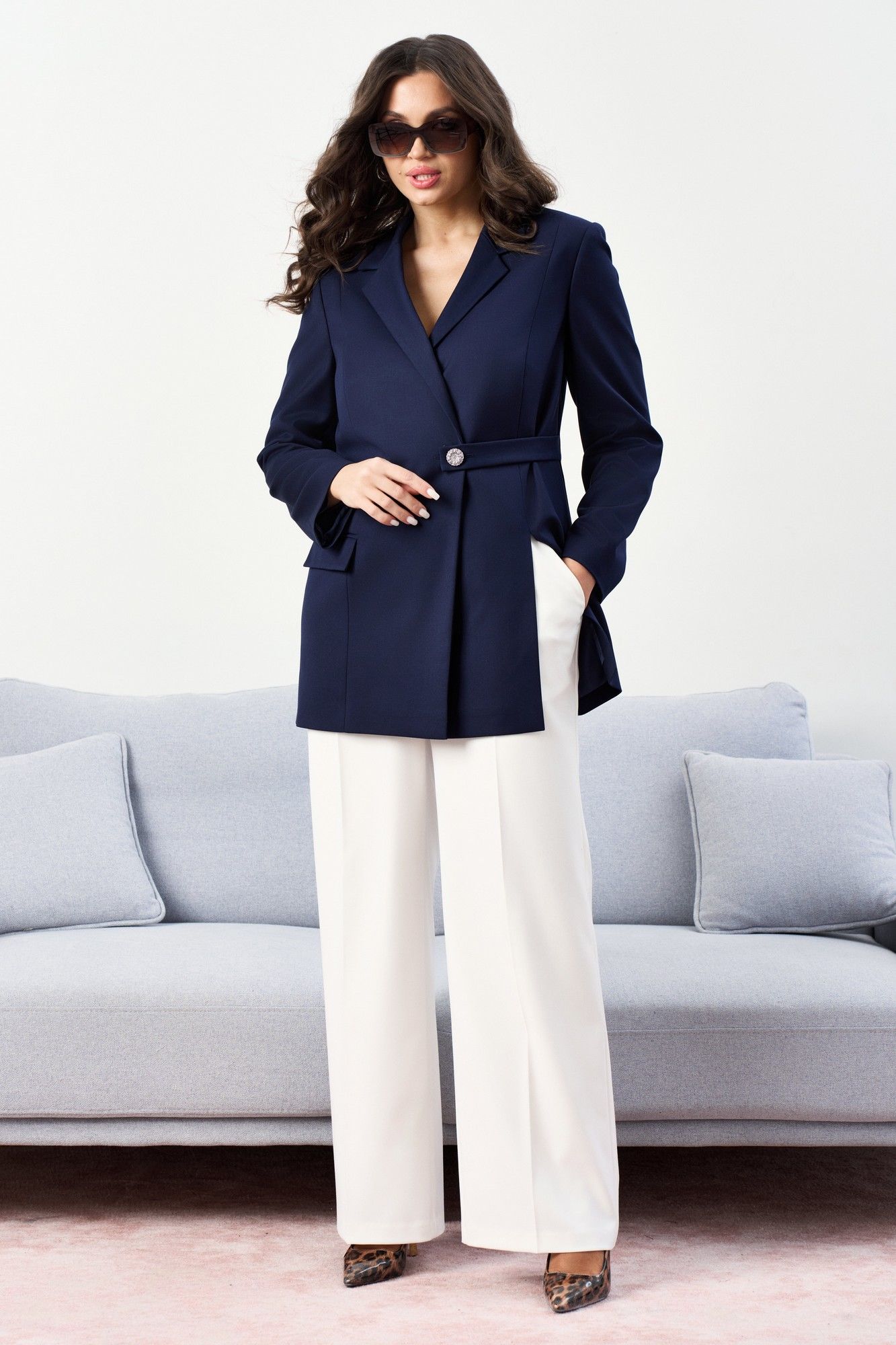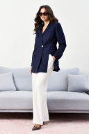 Костюм брючный. Жакет со стояче-отложным воротником пиджачного типа и смещённой застёжкой на пуговицу, в которую застёгивается и декоративная пата. Перед с карманом с клапаном в нижней части и декоративным клапаном. По переду идут два рельефа, один рельеф с разрезом в нижней части. Спинка со средним швом и двумя рельефами. Рукава втачные. Изделие на подкладке. Брюки на поясе с резинкой. Передние половинки с наклонными карманами к боковым швам. ВОЗМОЖНА ЗАМЕНА ФУРНИТУРЫ НА АНАЛОГИЧНУЮ ТАКОГО ЖЕ КАЧЕСТВА.