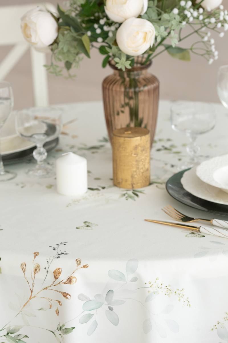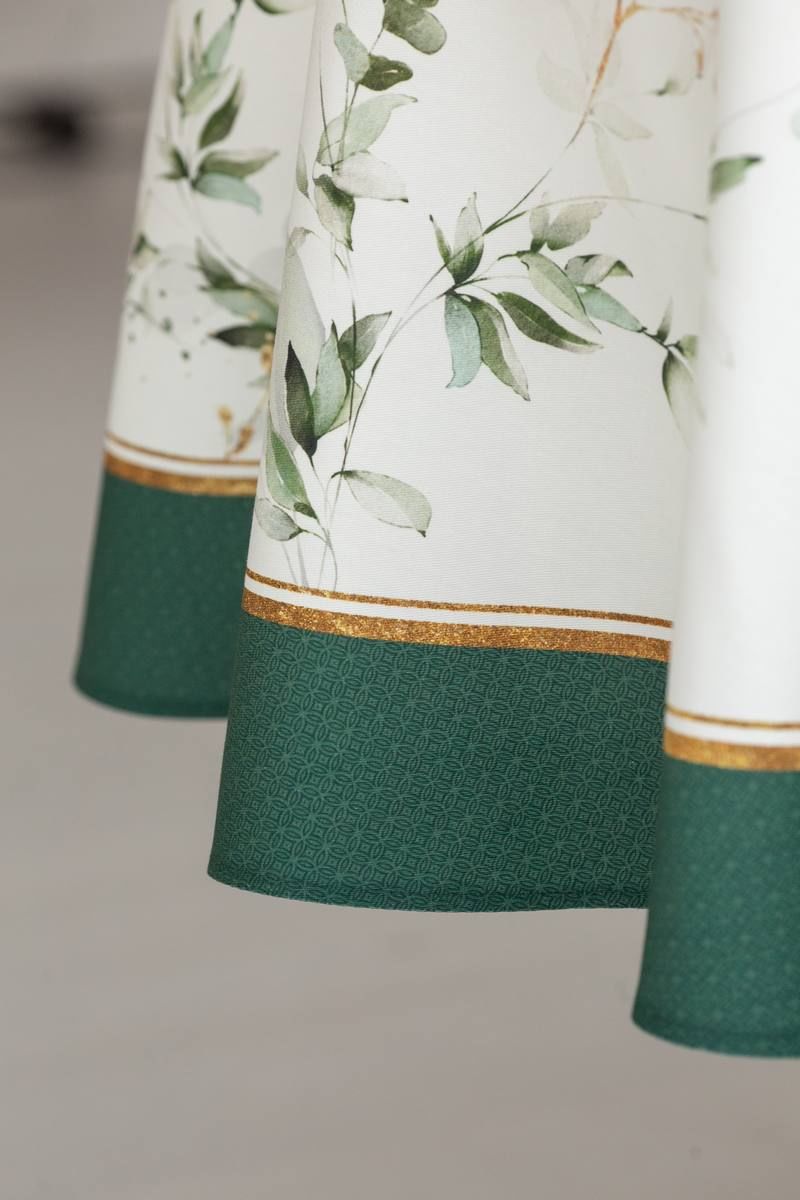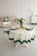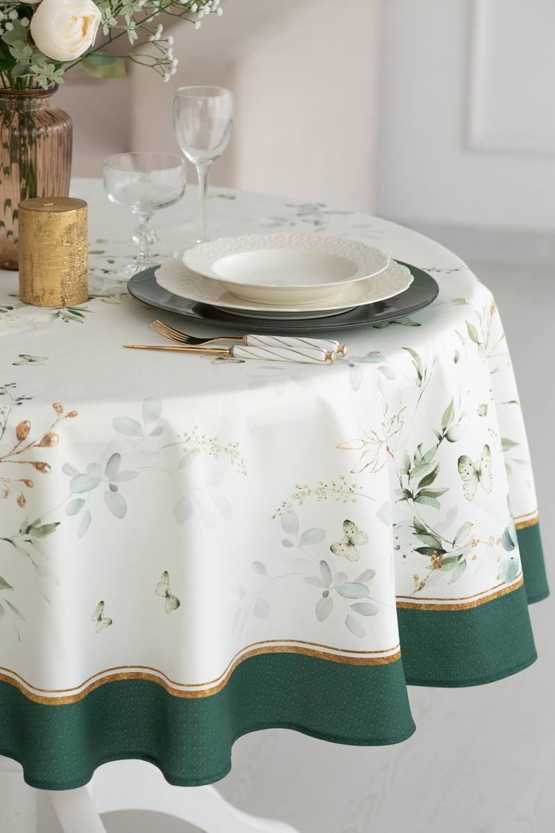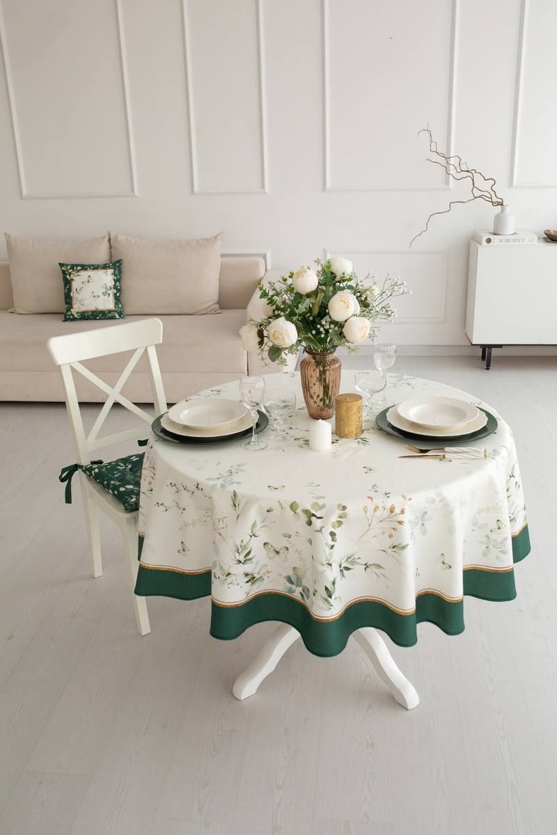 Все скатерти коллекции «ЭВЕЛИНА» имеют специальную пропитку (влаго-, масло- и грязеотталкивающую обработку). Принт на ткани нанесен методом цифровой печати с использованием высококачественных красителей, благодаря чему изделия не линяют и не меняют свой цвет после многократных стирок. Рисунок по ткани виден только на лицевой стороне. ЭКСКЛЮЗИВНЫЙ ДИЗАЙН: Если изумрудный цвет вас завораживает, тогда новая коллекция «ЭВЕЛИНА» будет у вас дома! Это идеальное сочетание белого с изумрудным, подчеркнутое золотыми элементами в рисунке, мы увидели и прочувствовали уже на фотосессии. Скатерть коллекции «ЭВЕЛИНА» размером D-170см круглая. Скатерть D-170см подходит для круглого стола диаметром 100…110…120см. Изысканная белоснежная скатерть украшена по краю изумрудной каймой с позолоченным кантиком. Легкие воздушные зеленые веточки и порхающие мотыльки добавляют скатерти свою романтичность и смягчают строгий стиль белого цвета.