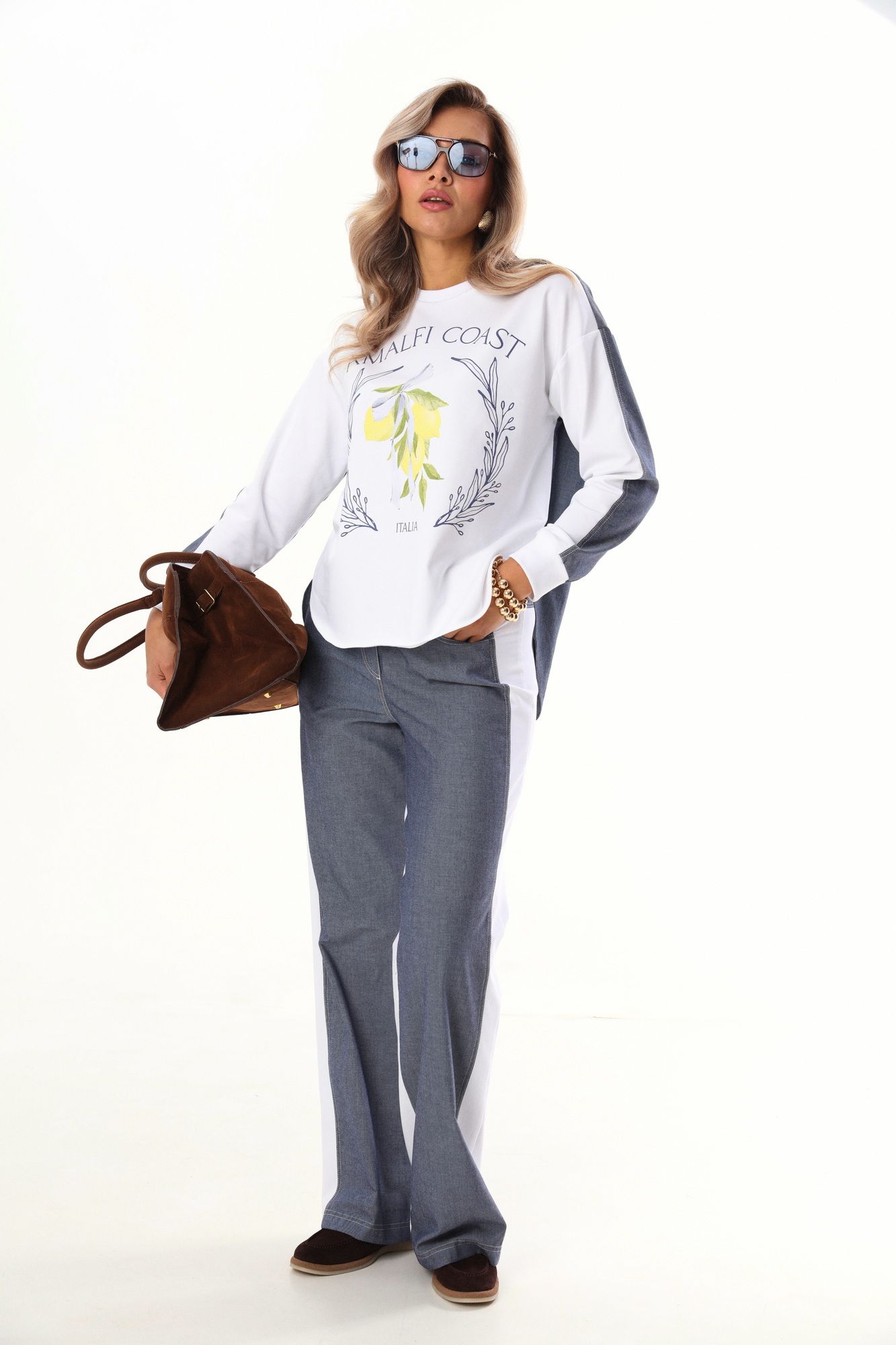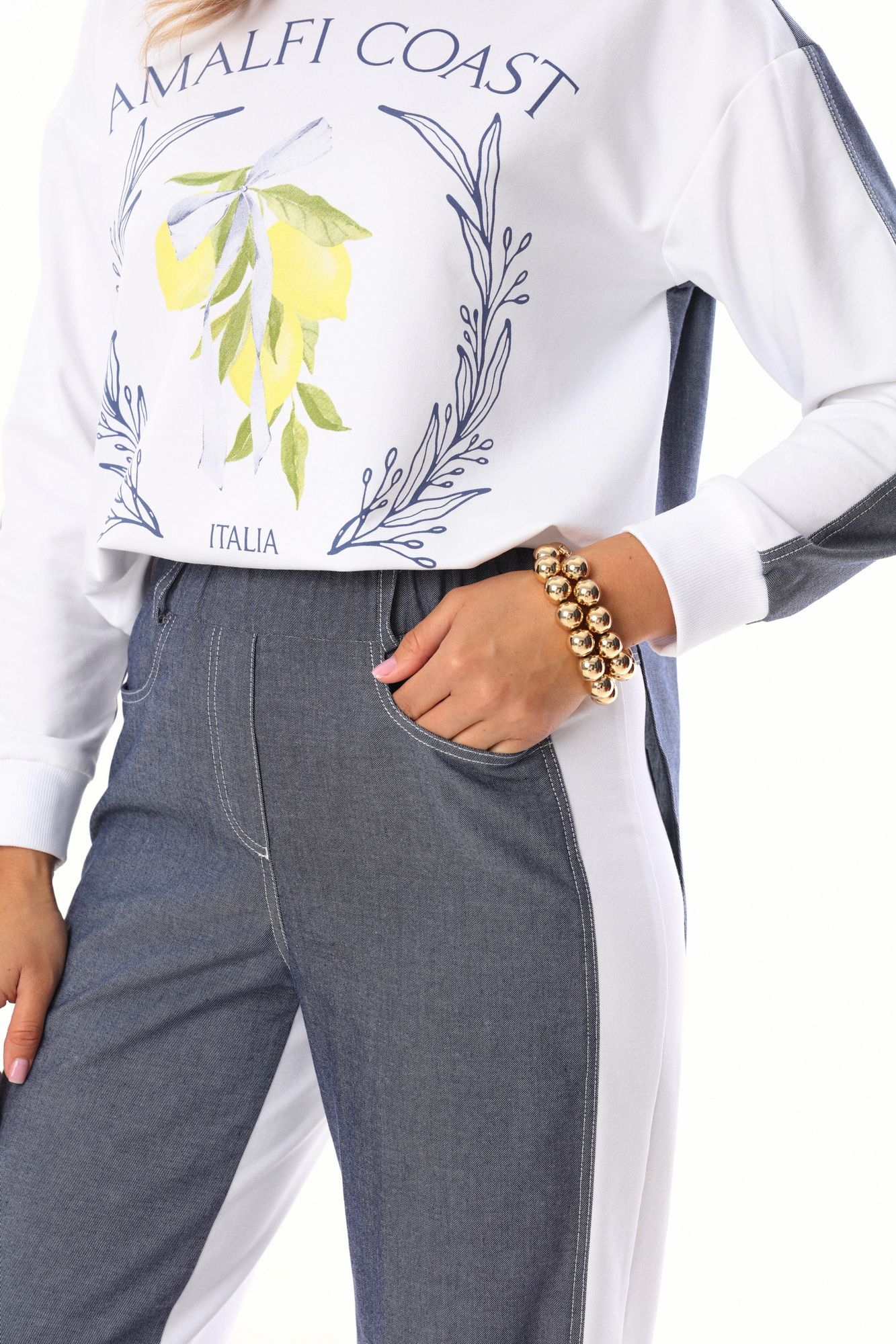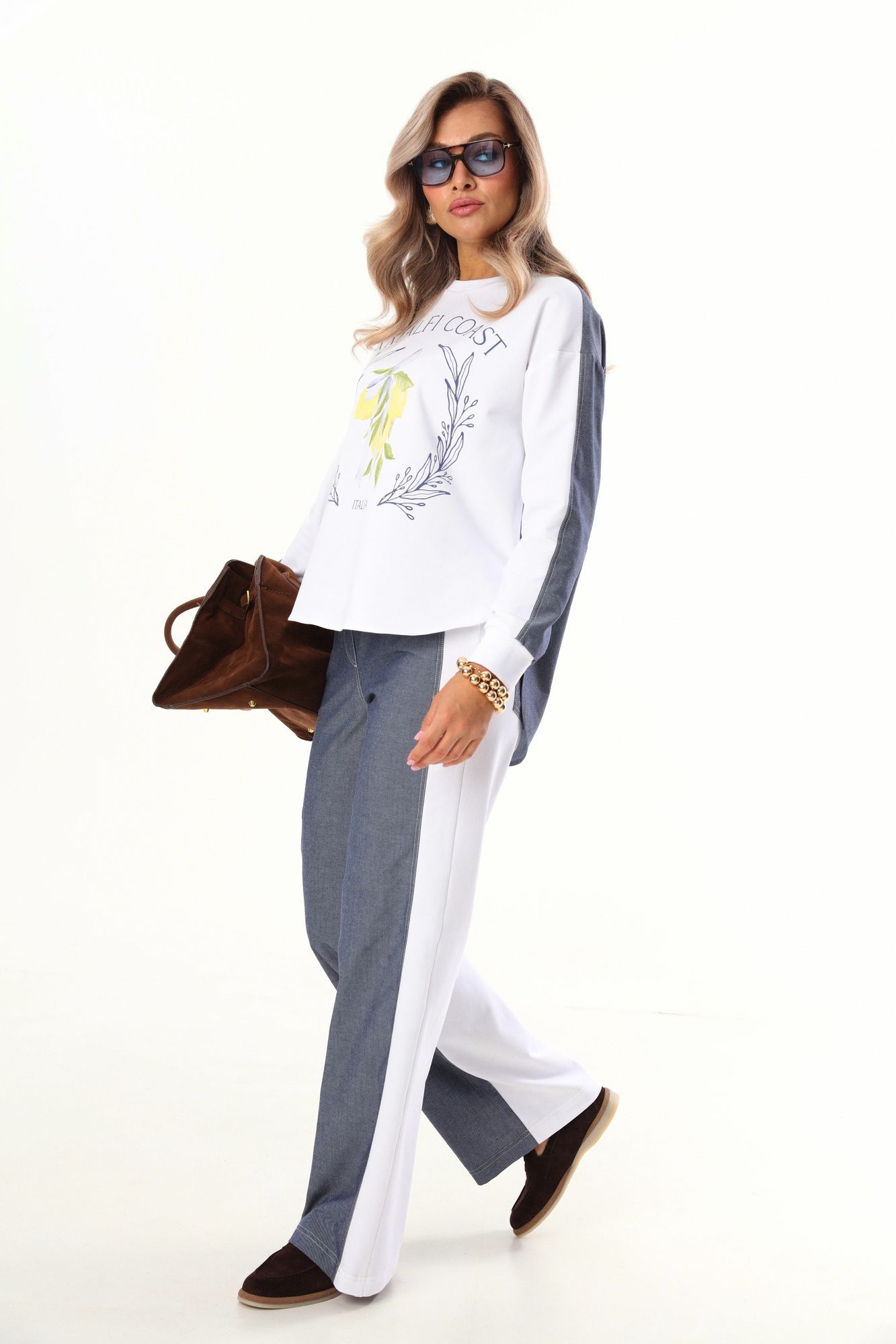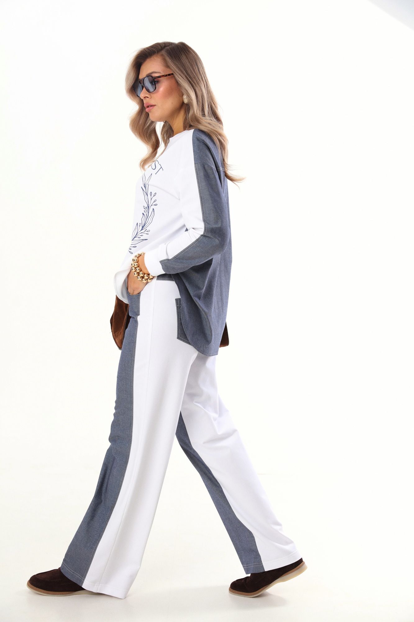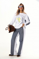 Комплект 2ка, состоящий из джемпера и брюк. Комплект выполнен из ткани двух видов. Джемпер объёмного кроя с принтом по переду. Спинка удлинённая, выполнена по принципу рубашки с кокеткой, по низу рукавов манжеты из довязов. Брюки свободного кроя от бедра. Талия брюк на резинке, по переду и сзади расположены карманы. Длина брюк 112 см , длина свитшота по спинке 75 см.