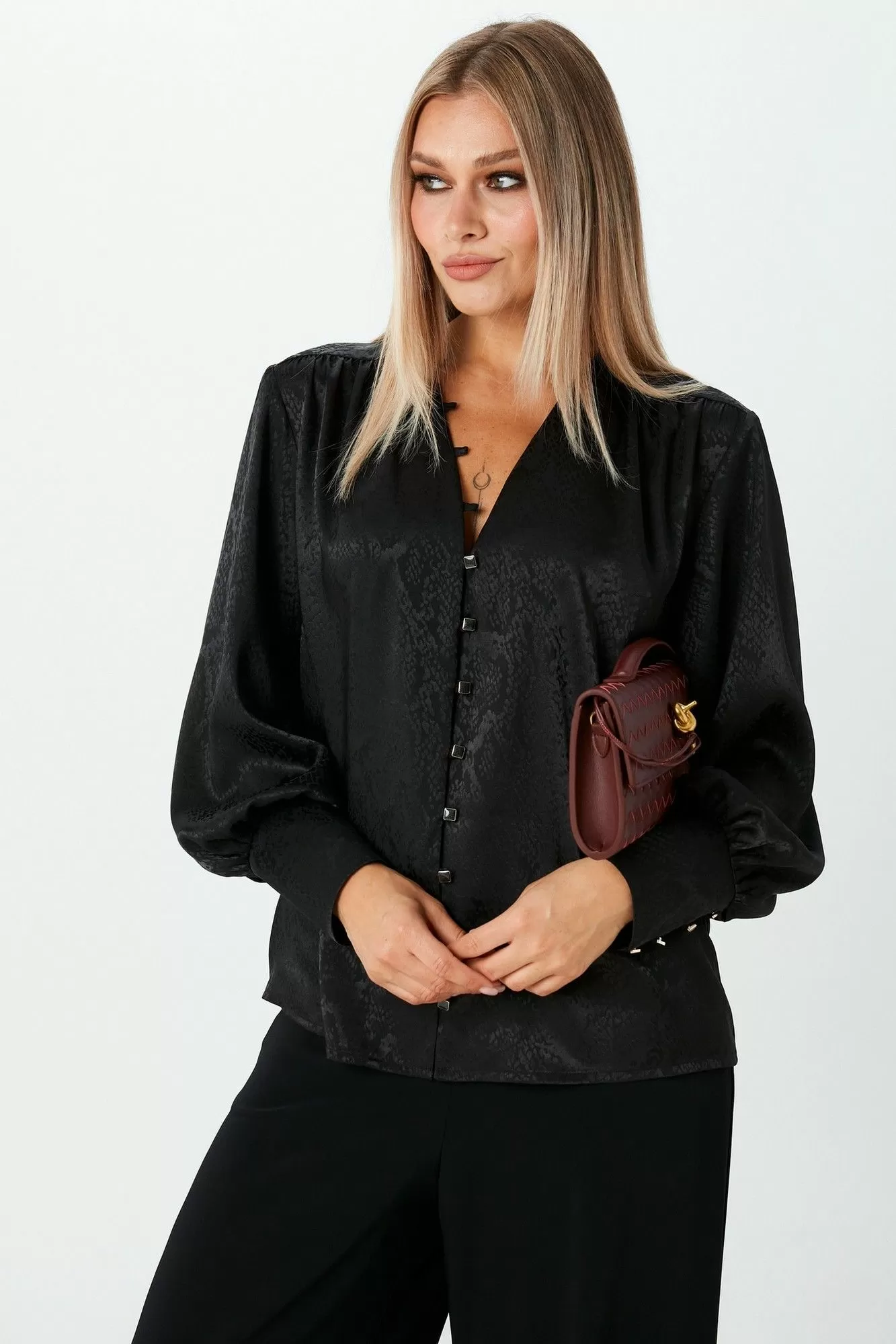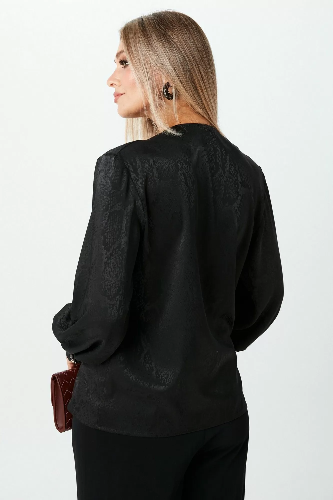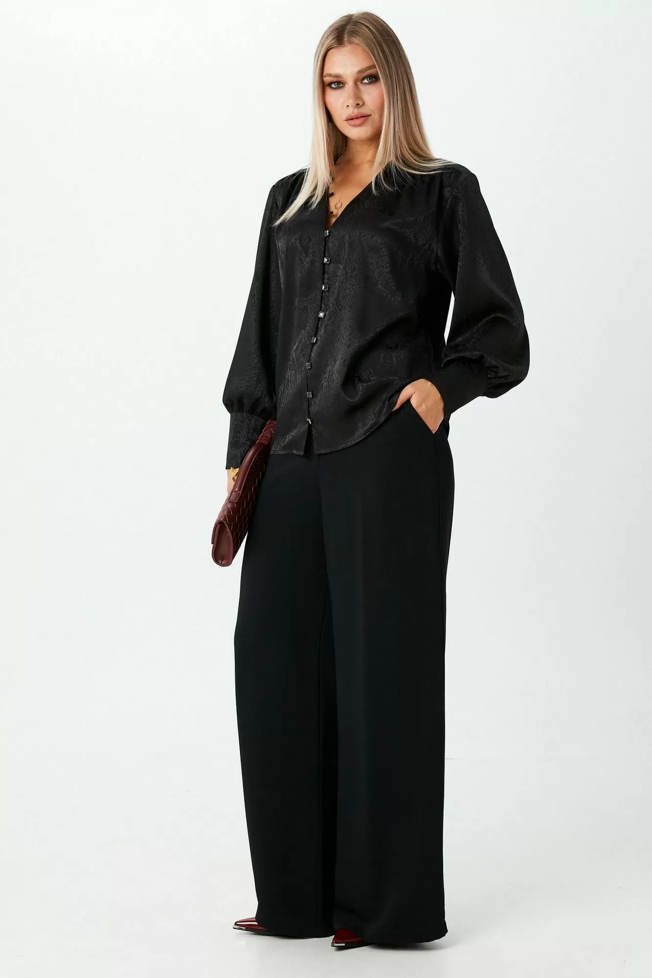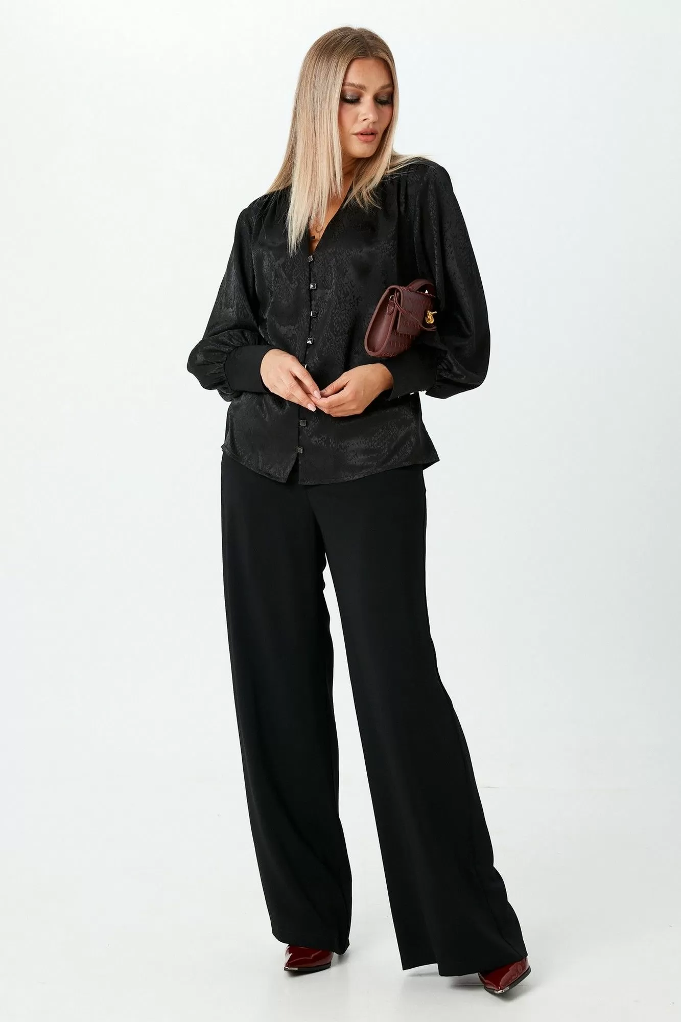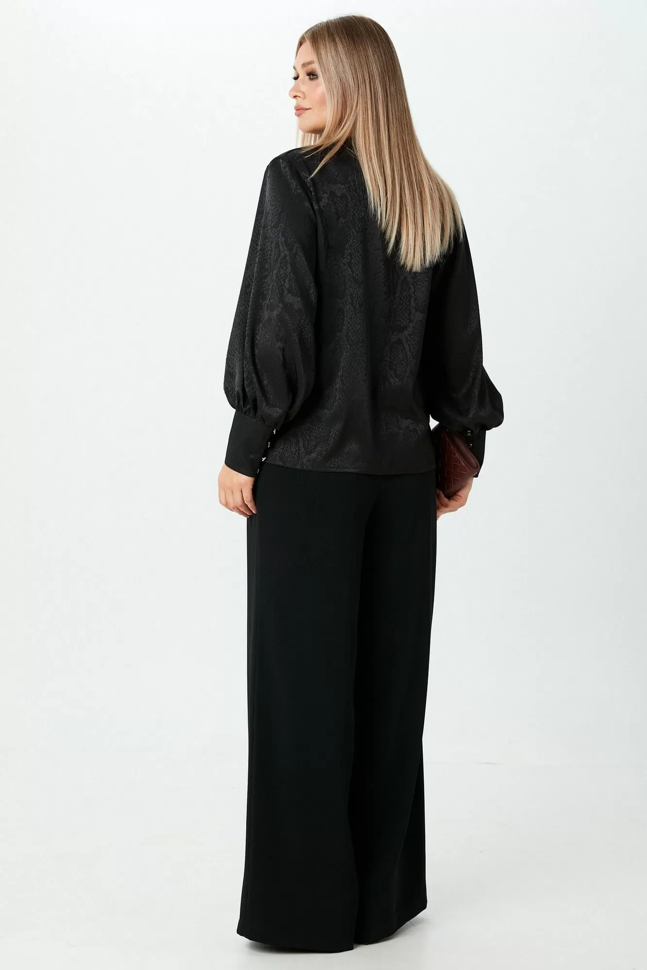 Комплект 2ка, состоящий из блузки и брюк. Блуза из тонкой ткани с атласным эффектом, свободного силуэта с V-образным вырезом. Это довольно глубокий вырез, который прекрасно подчёркивает декольте и линию шеи. Застежка на навесные петли и пуговицы. Рукава длинные объёмные втачные заканчиваются широкой манжетой с застёжкой на навесные петли с пуговицами. Брюки широкого объема, прямого силуэта. В боковых швах расположены карманы. Застежка-гульфик. Пояс отрезной, притачной. В задней части пояса вставлена эластичная тесьма (резинка). Пояс застегивается на петлю и крючок.