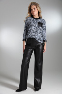 Трикотажный джемпер свободного кроя с укороченными рукавами. По переду расположен карман из мягкой эко-кожи кожи. Горловина и манжеты низа рукавов декорированы эко-кожей. По переду нагрудные вытачки. Застёжка на потайную молнию по спинке. Прямые брюки из мягкой эко-кожи с «замшевой» изнанкой, очень приятной к телу. По переду и сзади расположены карманы по принципу джинсовых брюк. Застёжка на молнию и пуговицу. Фурнитура и материалы отделки могут незначительно отличаться от тех, что на фотографии Рост фотомодели 169 см. Размер у фотомодели – 44.