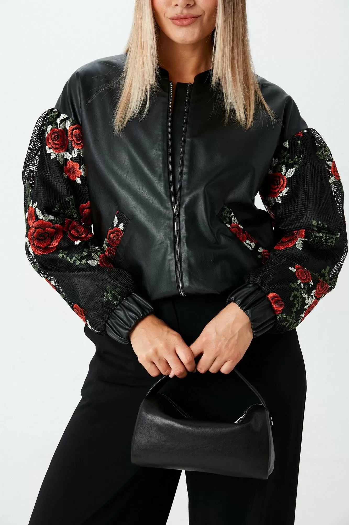Бомбер из экокожи с объёмными рукавами и застёжкой на молнию. Манжеты и низ бомбера на резинке. Карманы и рукава бомбера декорированы сеткой с цветочной вышивкой.
