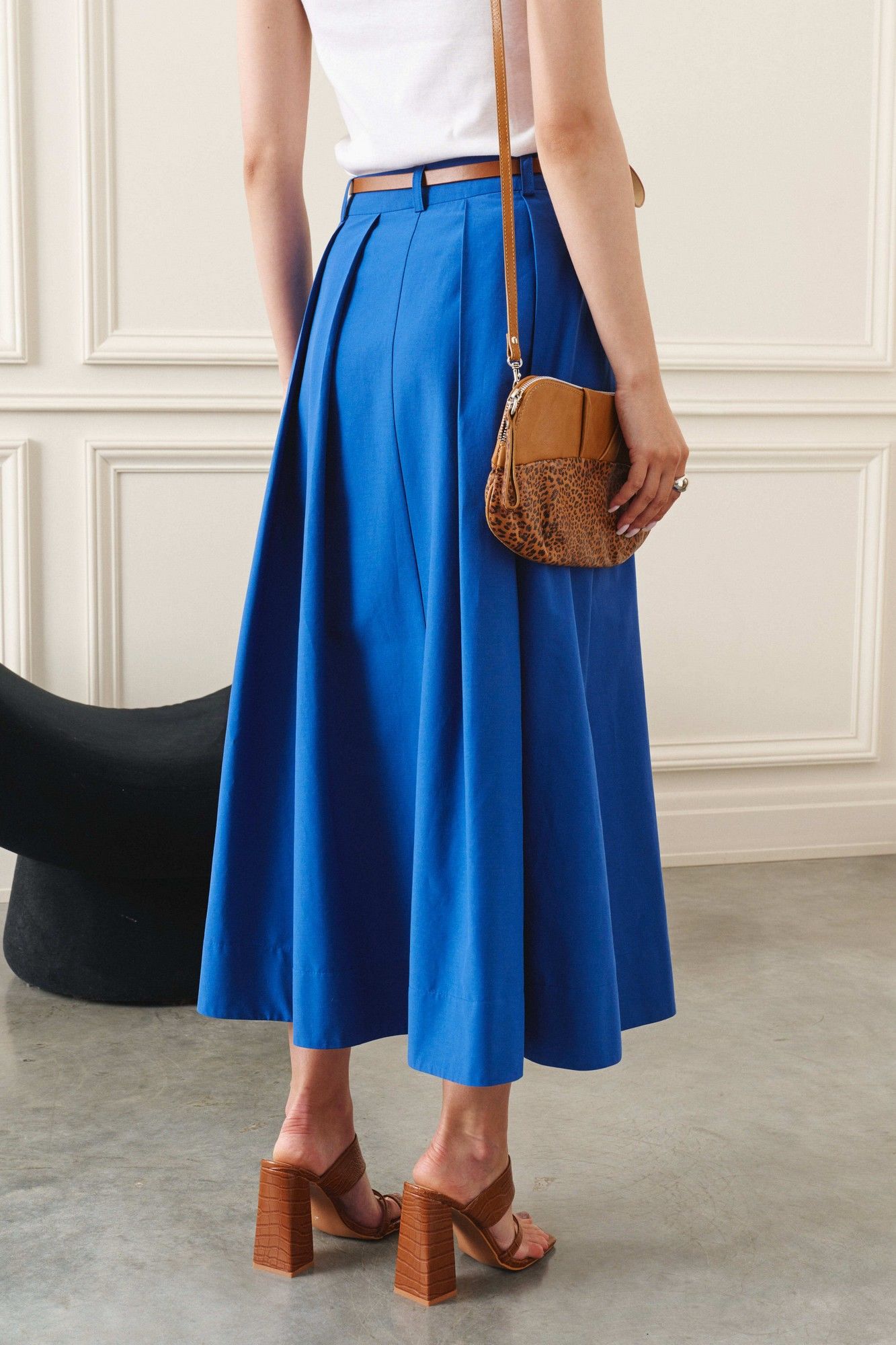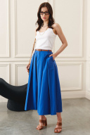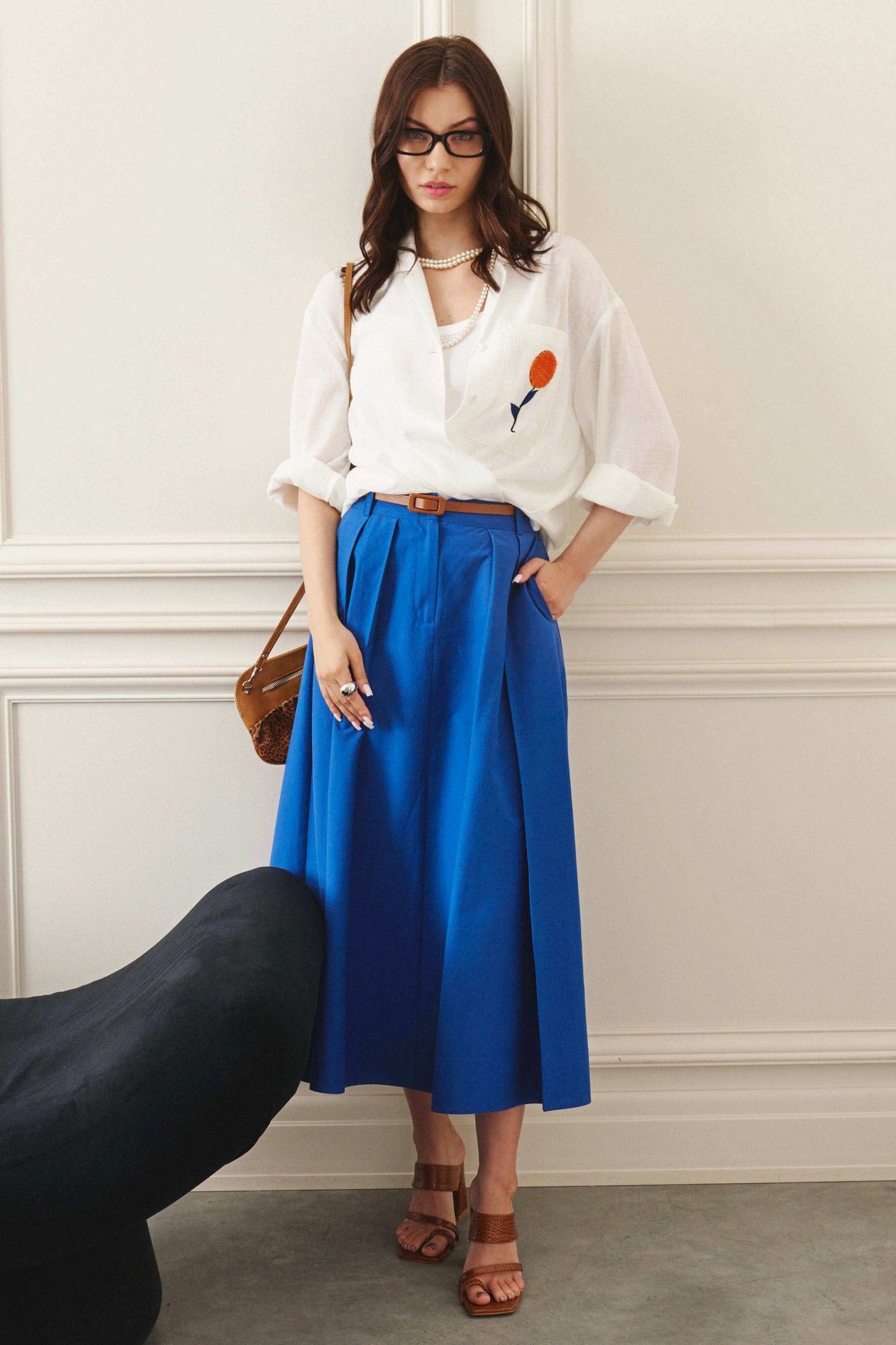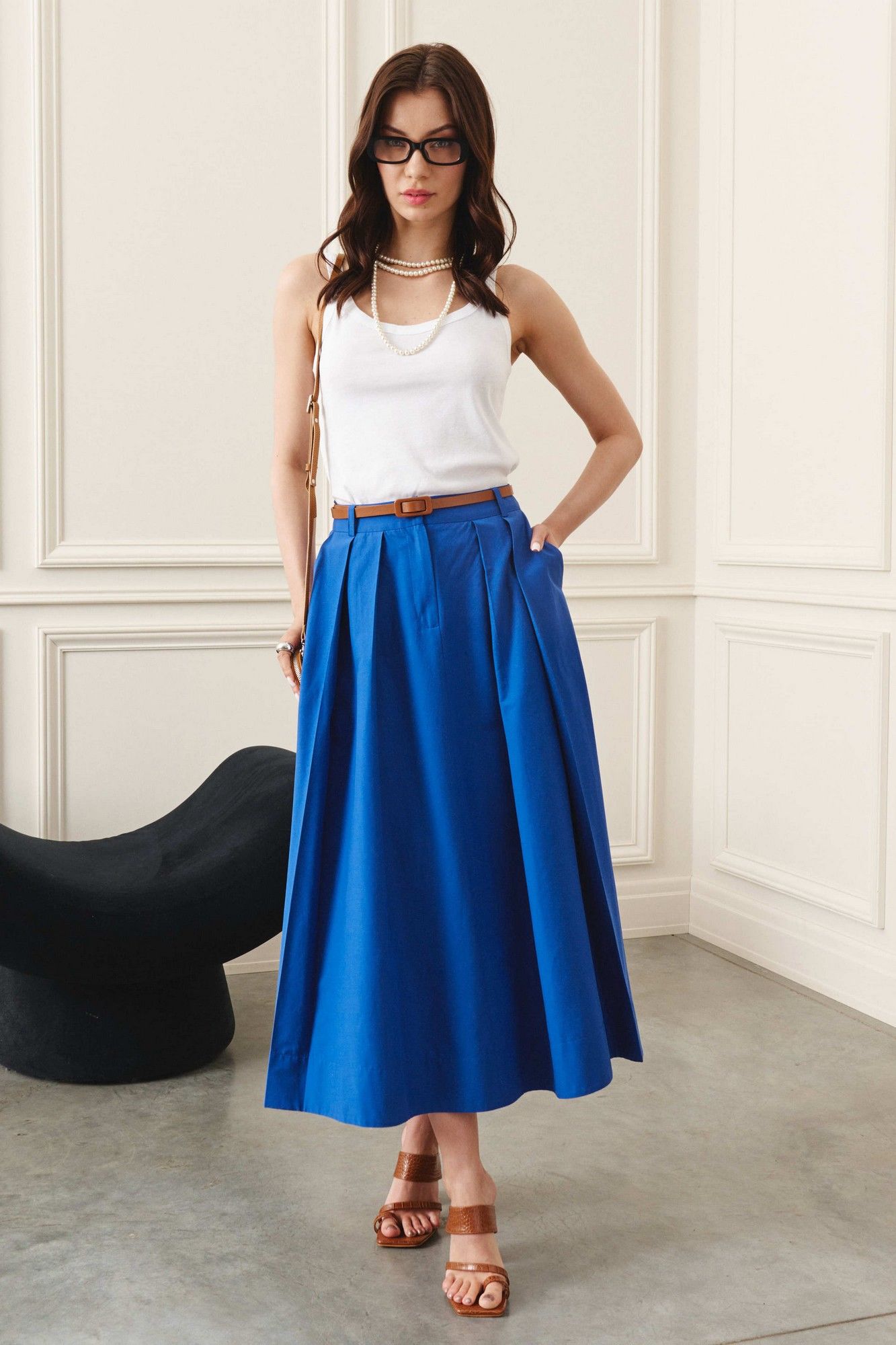 Юбка А-силуэта на притачном поясе, по поясу шлевки, по переду средний шов, переходящий в застёжку-гульфик. От шва притачивания пояса глубокие, заутюженные складки, в боковых швах карманы. По спинке средний шов и глубокие складки. Пояс из экокожи входит в комплектацию. Юбка: Длина: 88 см ОТ: 67-71-75-79-83 (размер 42-44-46-48)