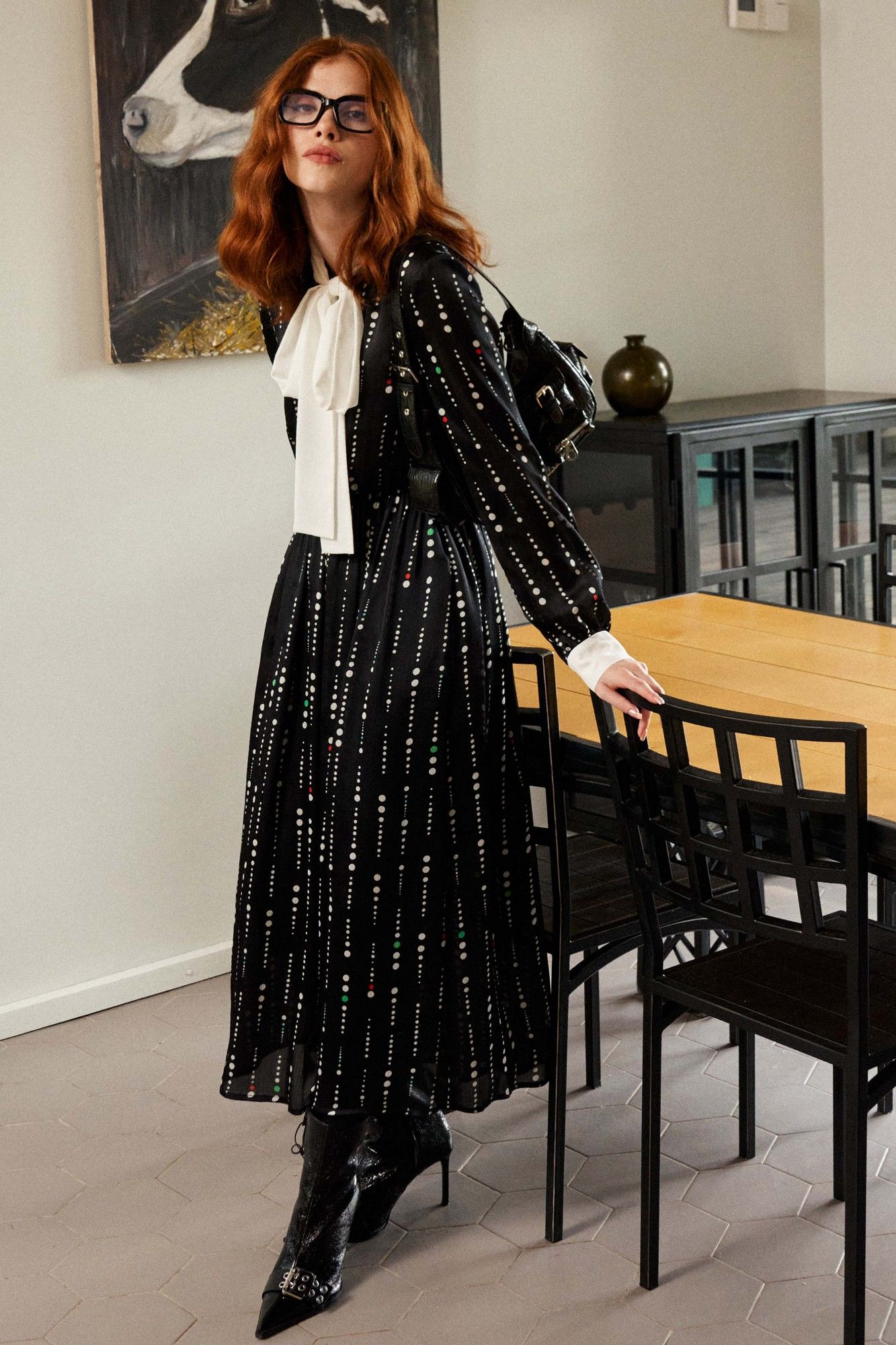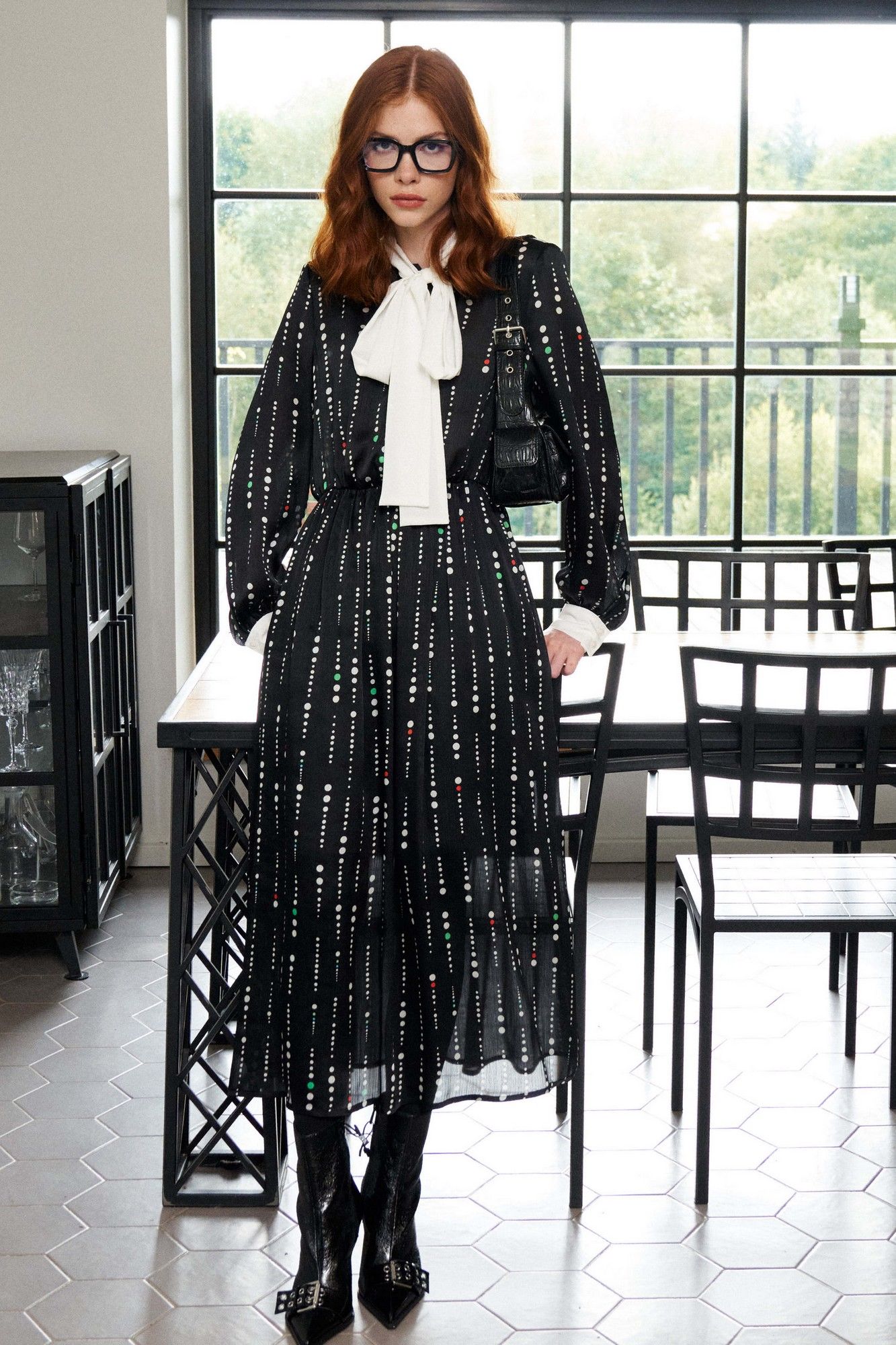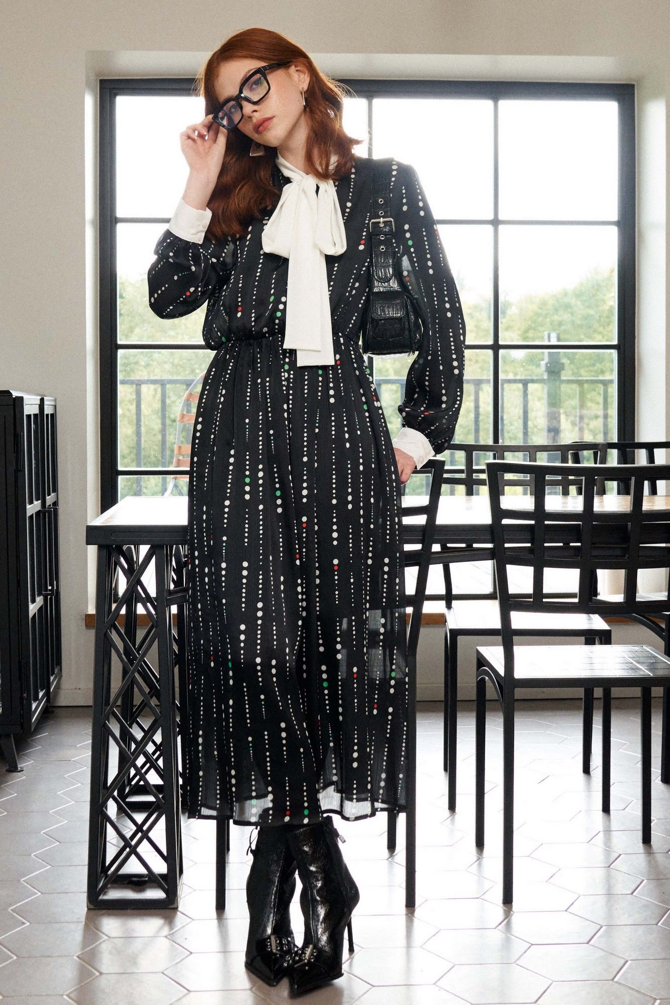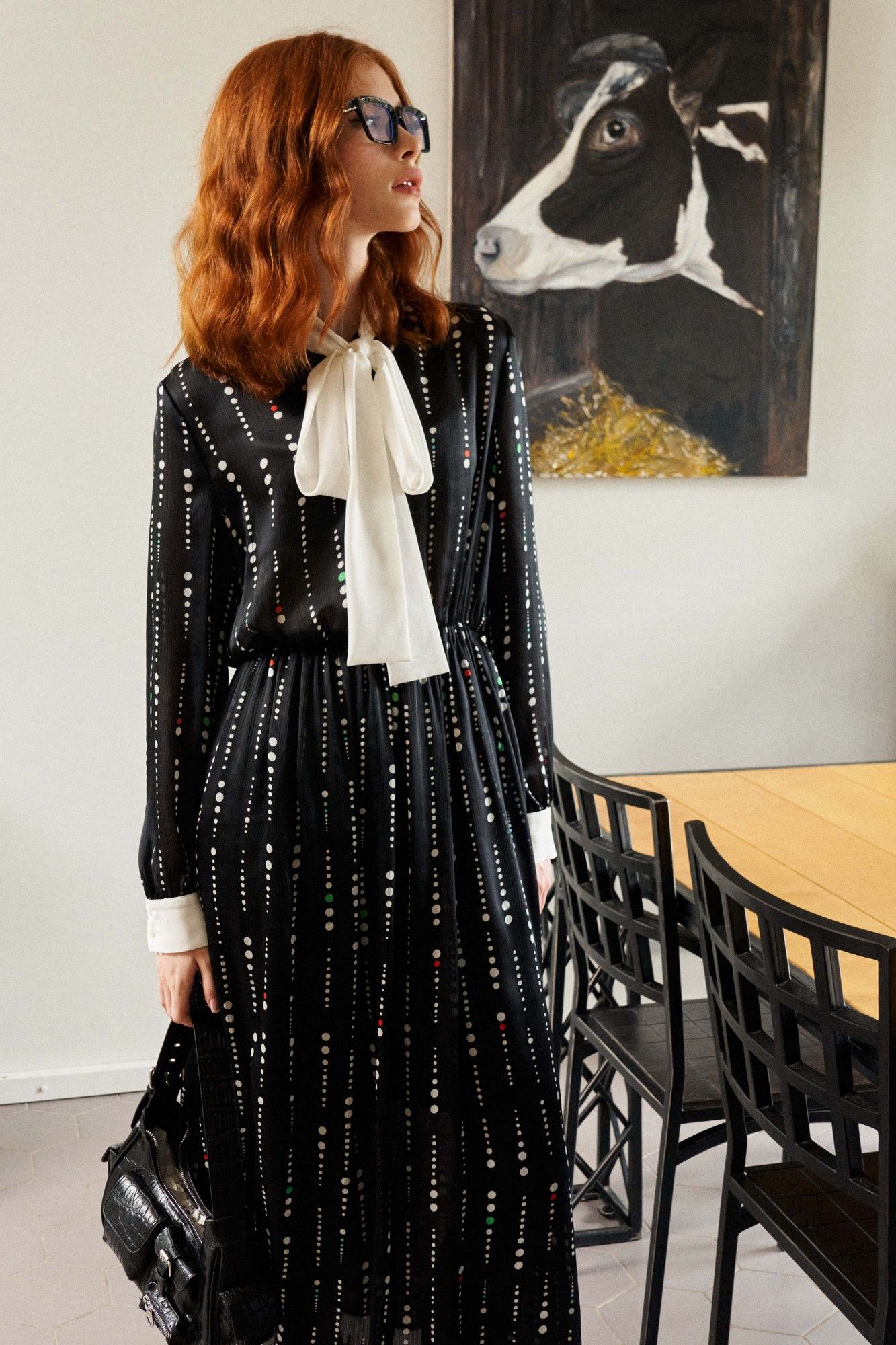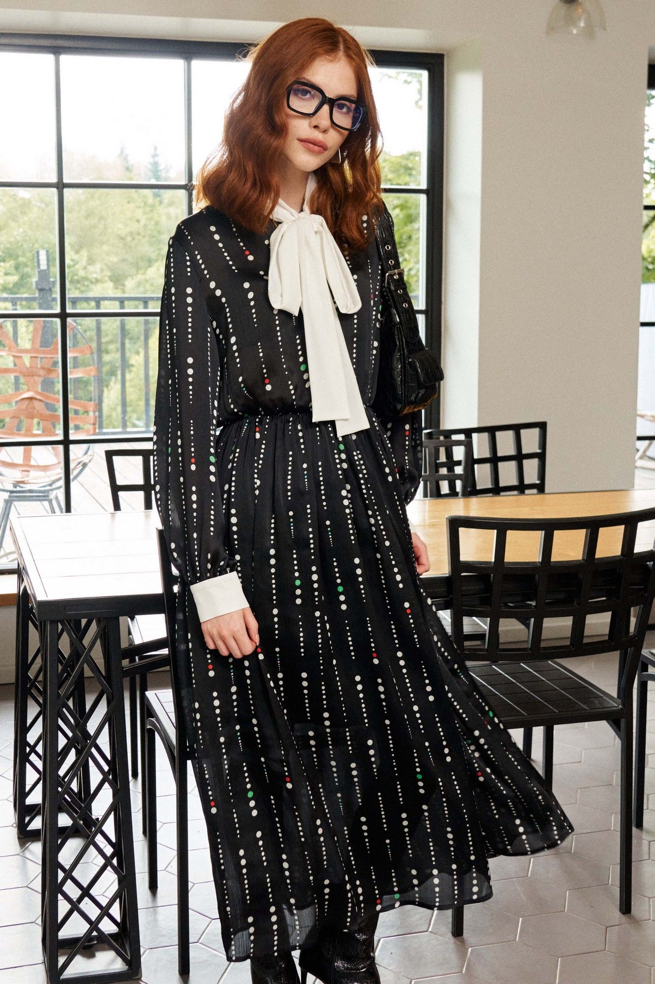 Платье свободного кроя выполнено из плательной ткани на трикотажной подкладке. Рукав втачной, по низу рукава притачная манжета с застёжкой на петлю и пуговицу. По горловине воротник-шарф выполнен из отделочной ткани. Застёжка центральная на петли и пуговицы. Линия талии отрезная, собрана на резинку. Длина платья по спинке от высшей точки горловины: 129 см, от горловины до резинки: 42 см, от резинки до низа платья: 87 см Длина рукава: 61,5 см ОГ: 100-104-108-112 см (размер 42-44-46-48) ОТ: 54-58-62-66 см Рост: 164 см (размер 42-44-46-48), в растяжении: 88-92-96-100 см (размер 42-44-46-48)