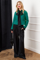 Комплект состоит из жакета и брюк. Жакет свободного кроя, выполнен из жаккардовой ткани с легким мерцанием на подкладке, что дает максимум комфорта в носке. Рукав длинный, линия плеча спущена, округлый вырез горловины, застежка центральная на петли пуговицы, по переду карман листочка. Воротник и манжет съемный. Брюки свободного кроя, прямые. По линии талии притачной пояс частично на резинке. На передней половинке брюк от талии глубокие складки на запах. В боковых швах карманы. Жакет: Длина по спинке от высшей точки горловины: 54 см; Длина рукава от горловины: 56 см, с манжетой 63 см ОГ: 106-110-114-118 см (размер 42-44-46-48); Брюки: ОТ (резинка, мин/макс): 66/80 -70/84-74/88-78/92 см (размер 42-44-46-48) ОБ: 110-114-118-122 см (размер 42-44-46-48) Длина: 114 см