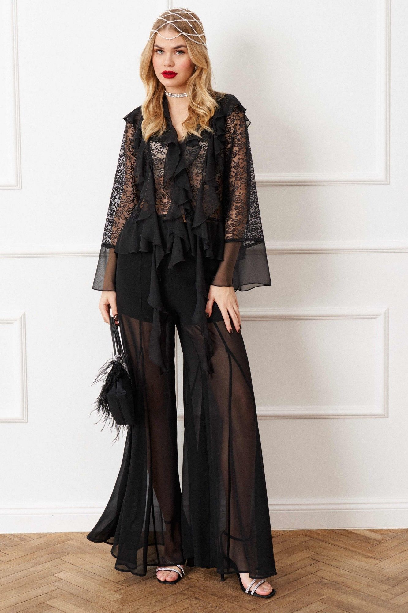 Блуза выполнена из двух видов ткани, гипюра и шифона. Рукав втачной по низу рукава притачной волан. У- образный вырез горловины, застёжка в стык на навесные петли и пуговицы. По горловине спинки и переда вшит волан. По переду и спинке вертикальные рельефы от плеча до низа блузы в которые вшиты воланы. Длина по спинке: 57 см Длина рукава: 60 см ОГ: 96-100-104-108 см (размер 42-44-46-48)