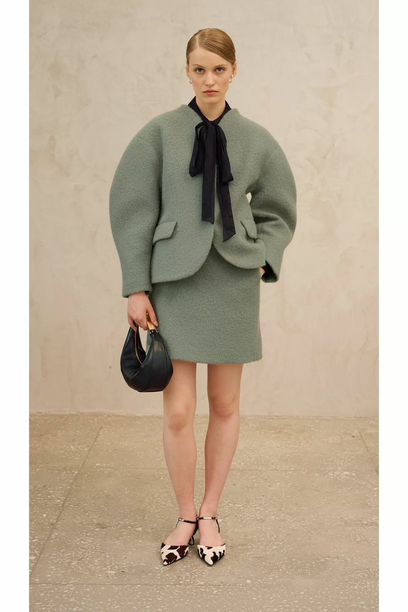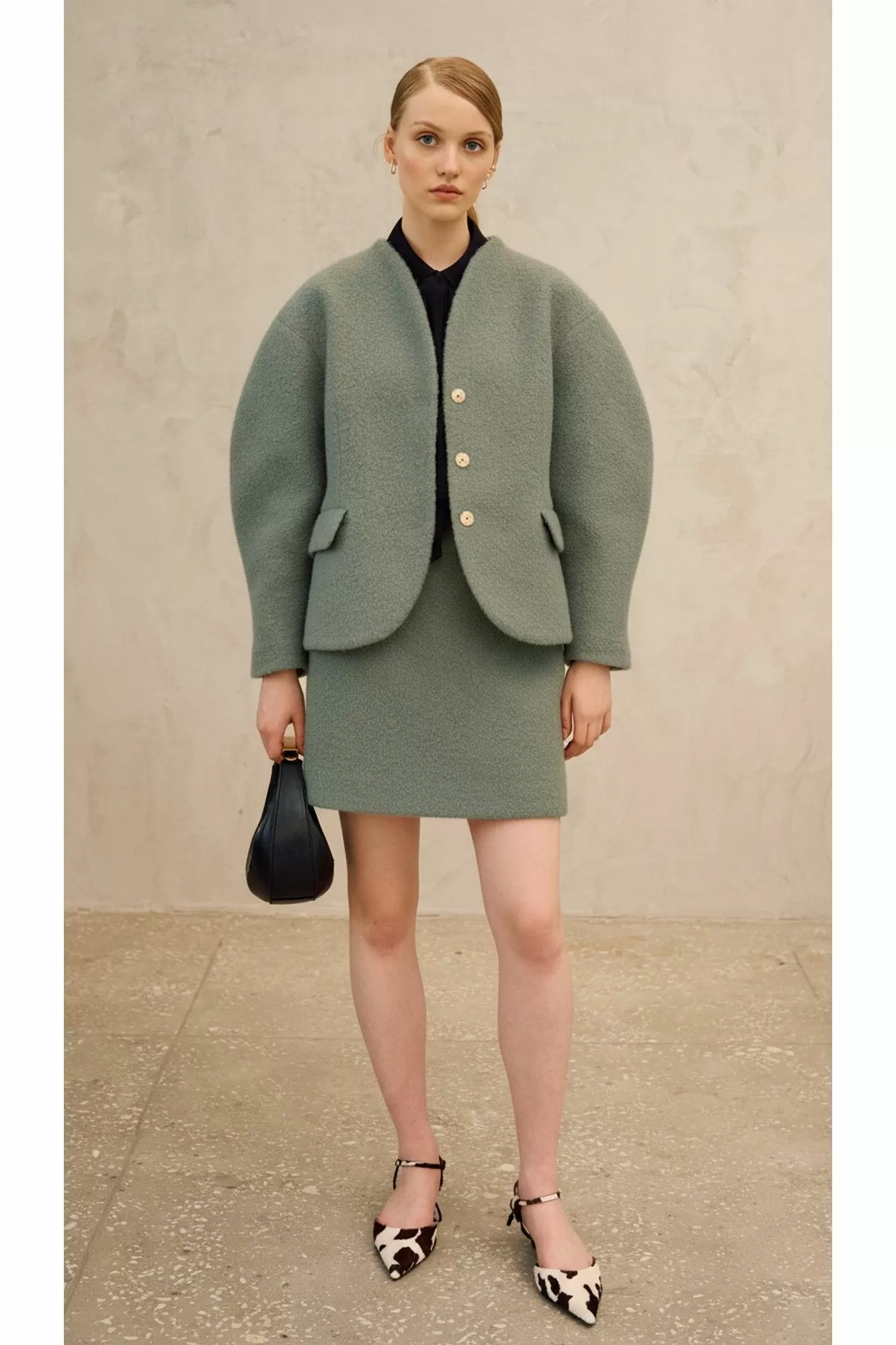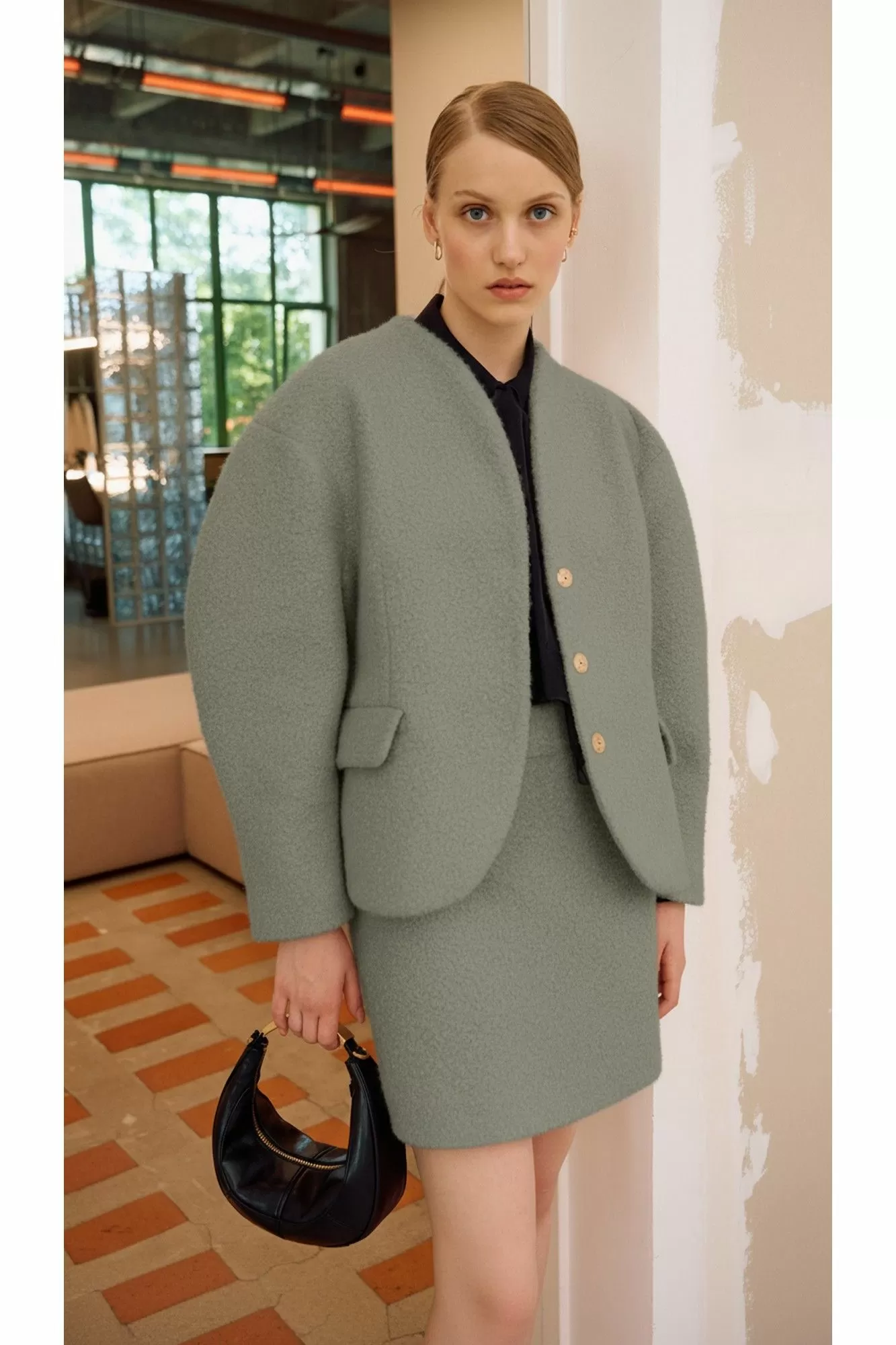 Комплект состоит из полупальто и юбки. Полупальто полуприлегающего силуэта на подкладке. Линия плеча спущена, рукав фигурной формы. Цельнокроеный воротник, переходящий в центральную застежку на потайные кнопки. По переду прорезные карманы с отлетными клапанами. По спинке средний шов и рельефы. Юбка в длине мини, прямого силуэта, на обтачке. По бокам прорезные карманы. По спинке средний шов, переходящий в потайную молнию.