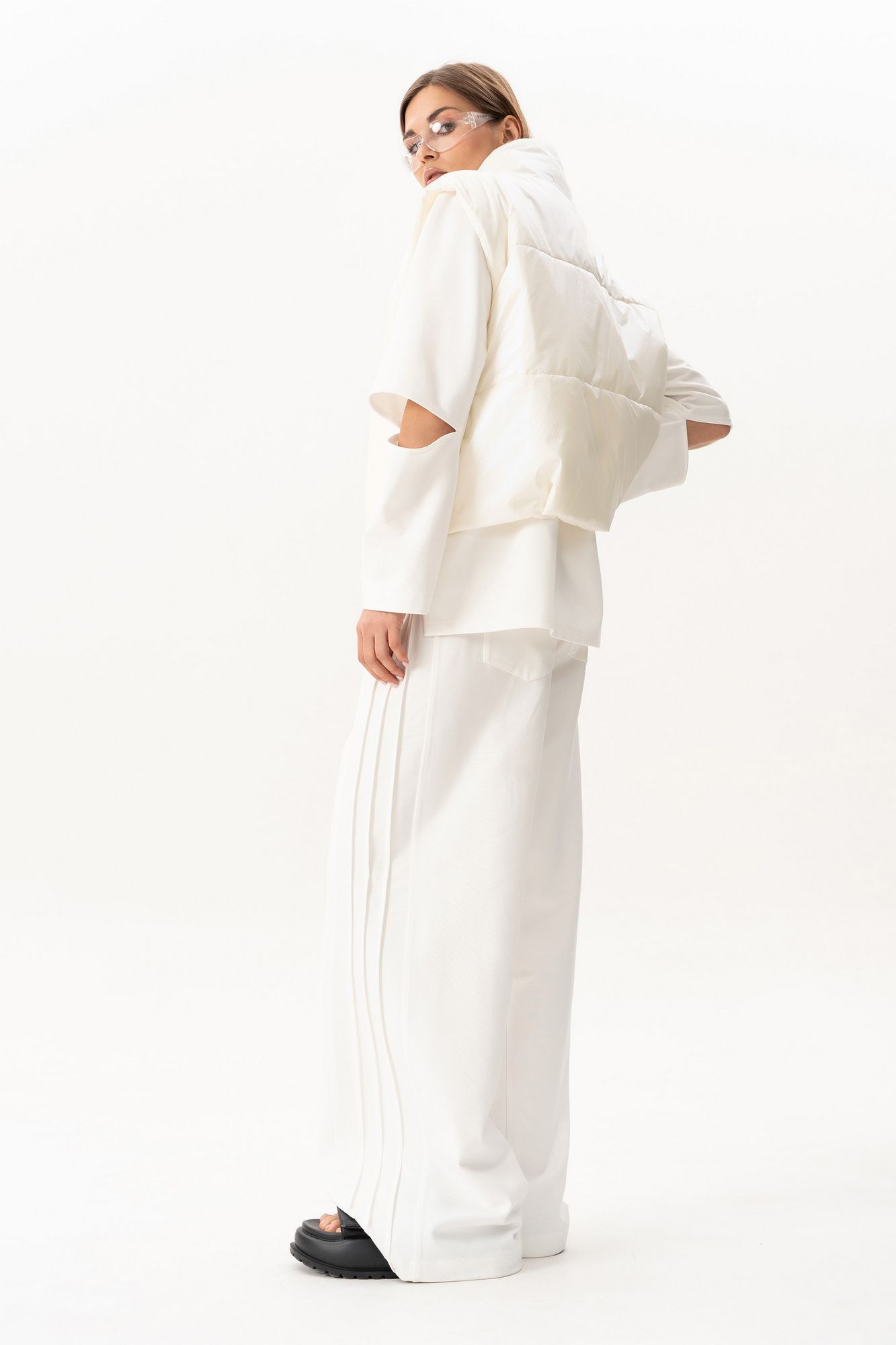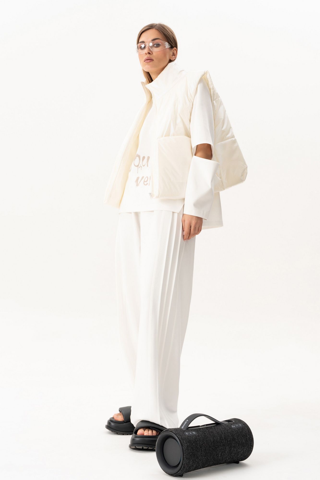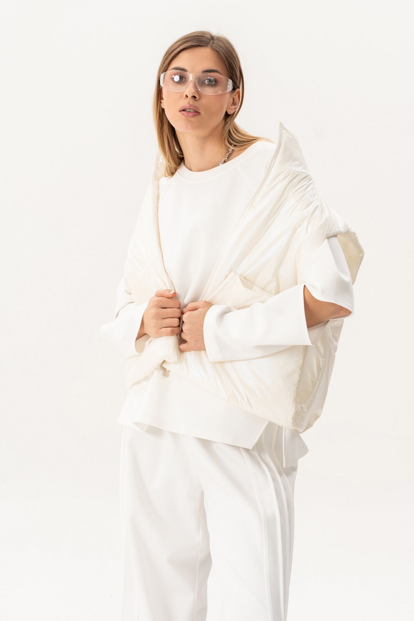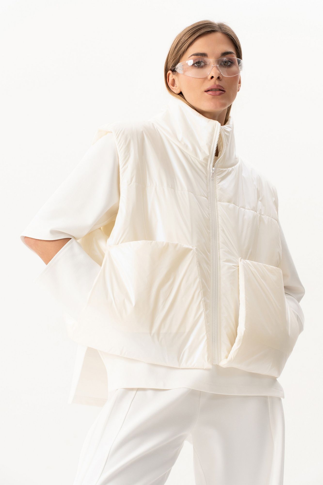 Комплект(жилет,костюм).Жилет женский на синтепоне на подкладке с центральной застёжкой на тесьту-молнию,воротником-стойкой,накладными-отложными карманами.Свитшот прямого силуэта актуального свободного кроя с округлым вырезом горловины,в боковых швах-разрезы,по переду-печать,рукав реглан с разрезами по локтевому сгибу.Брюки высокой посадки на поясе на резинке с декоративной вставкой с защипами, карманами по спинке. длина брюк по боковому шву с поясом -98 см,длина жакета-78см