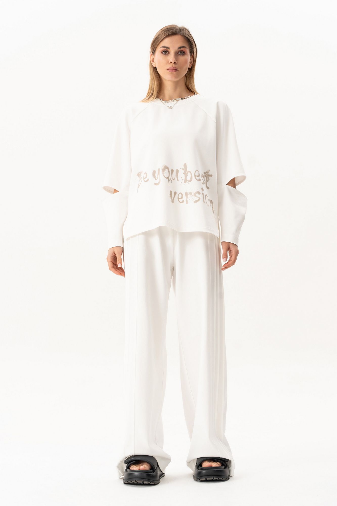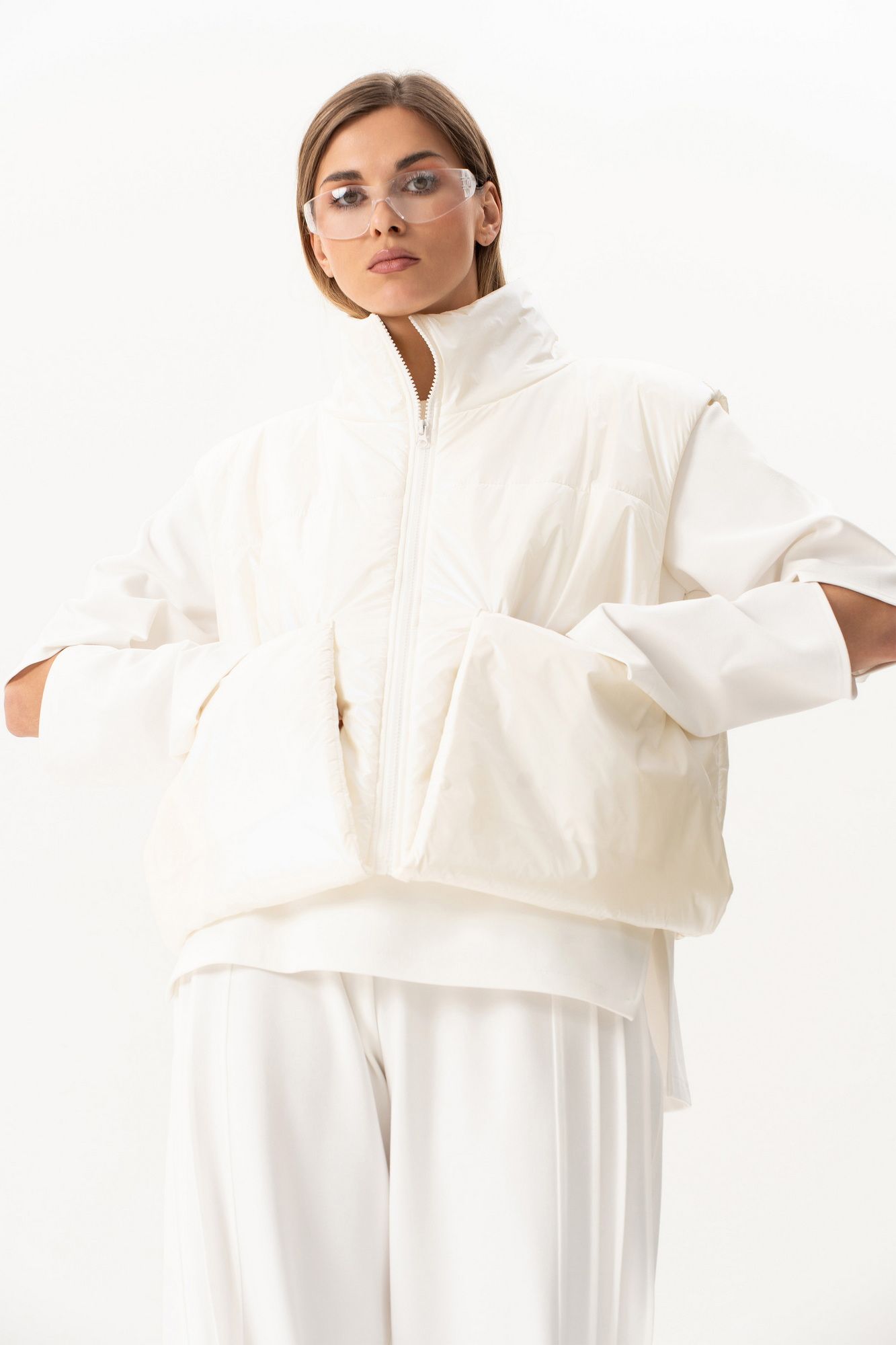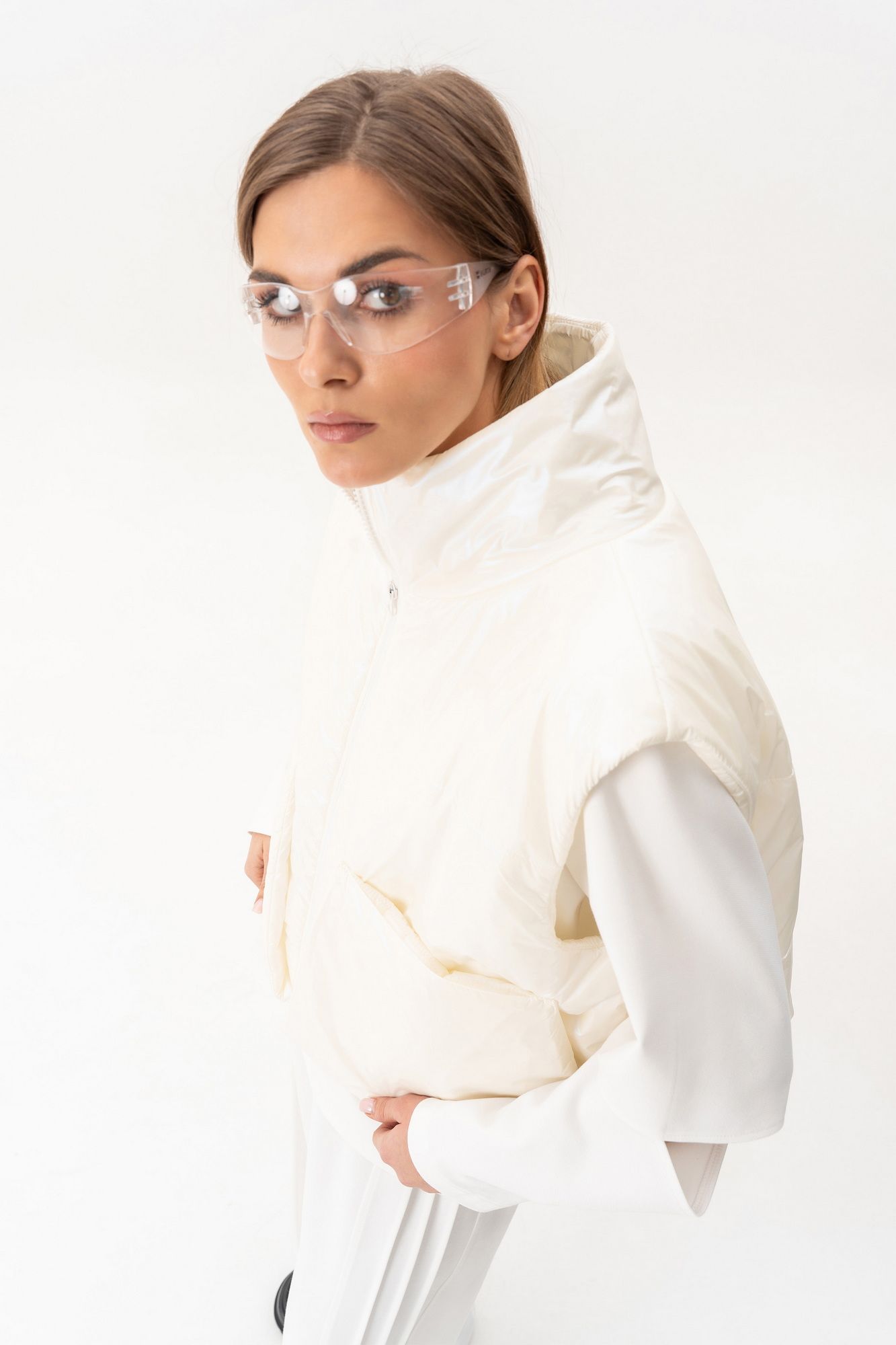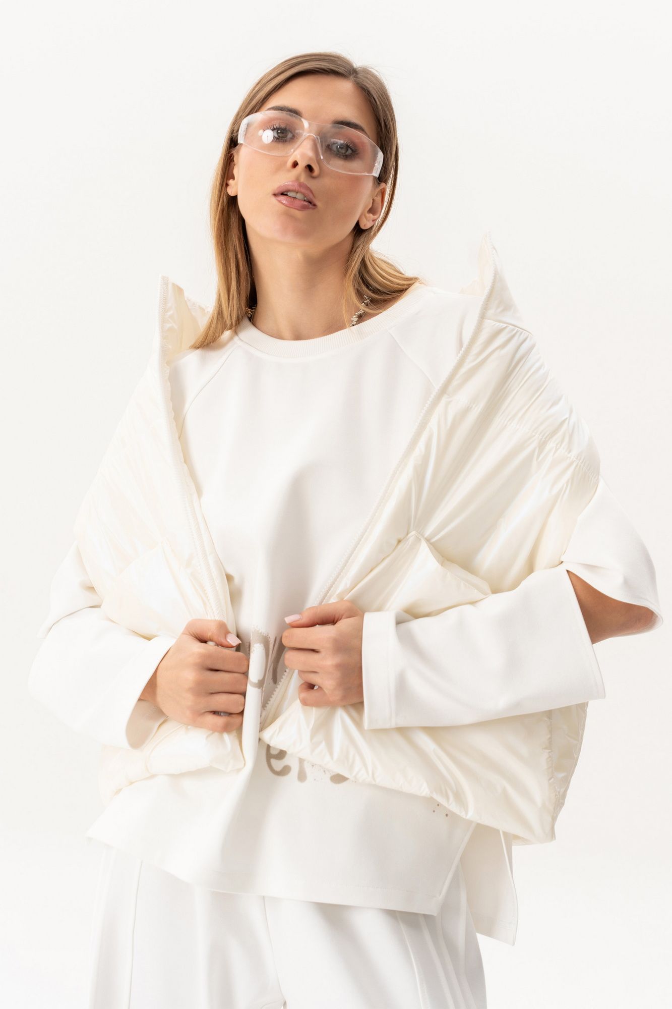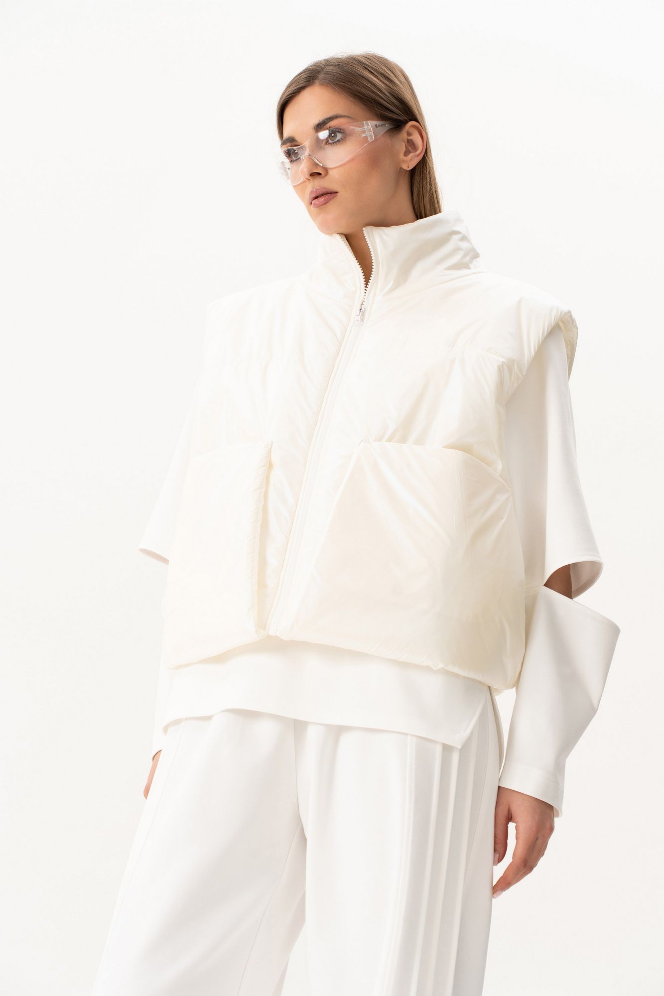 Комплект(жилет,костюм).Жилет женский на синтепоне на подкладке с центральной застёжкой на тесьту-молнию,воротником-стойкой,накладными-отложными карманами.Свитшот прямого силуэта актуального свободного кроя с округлым вырезом горловины,в боковых швах-разрезы,по переду-печать,рукав реглан с разрезами по локтевому сгибу.Брюки высокой посадки на поясе на резинке с декоративной вставкой с защипами, карманами по спинке. длина брюк по боковому шву с поясом -98 см,длина жакета-78см