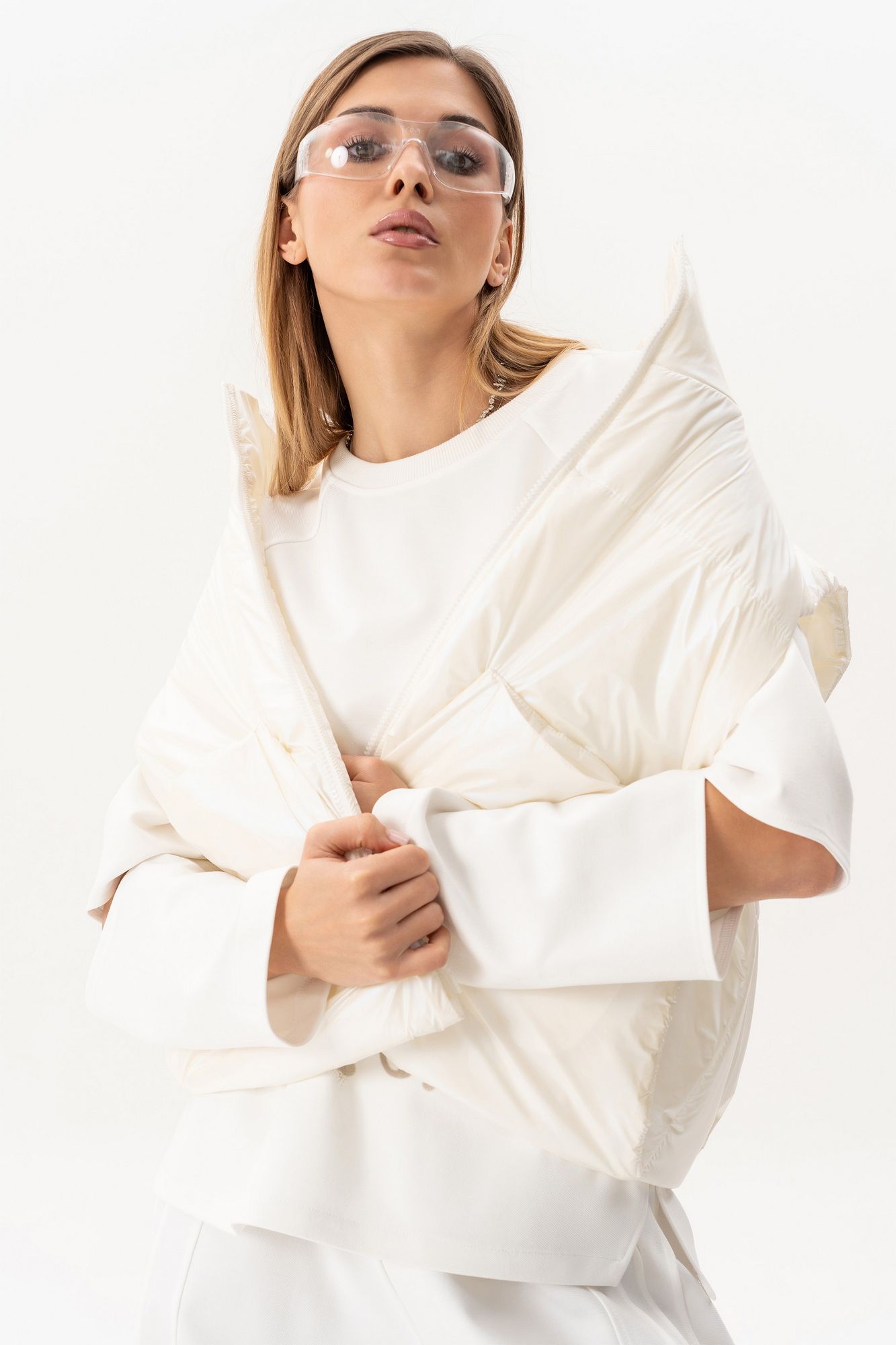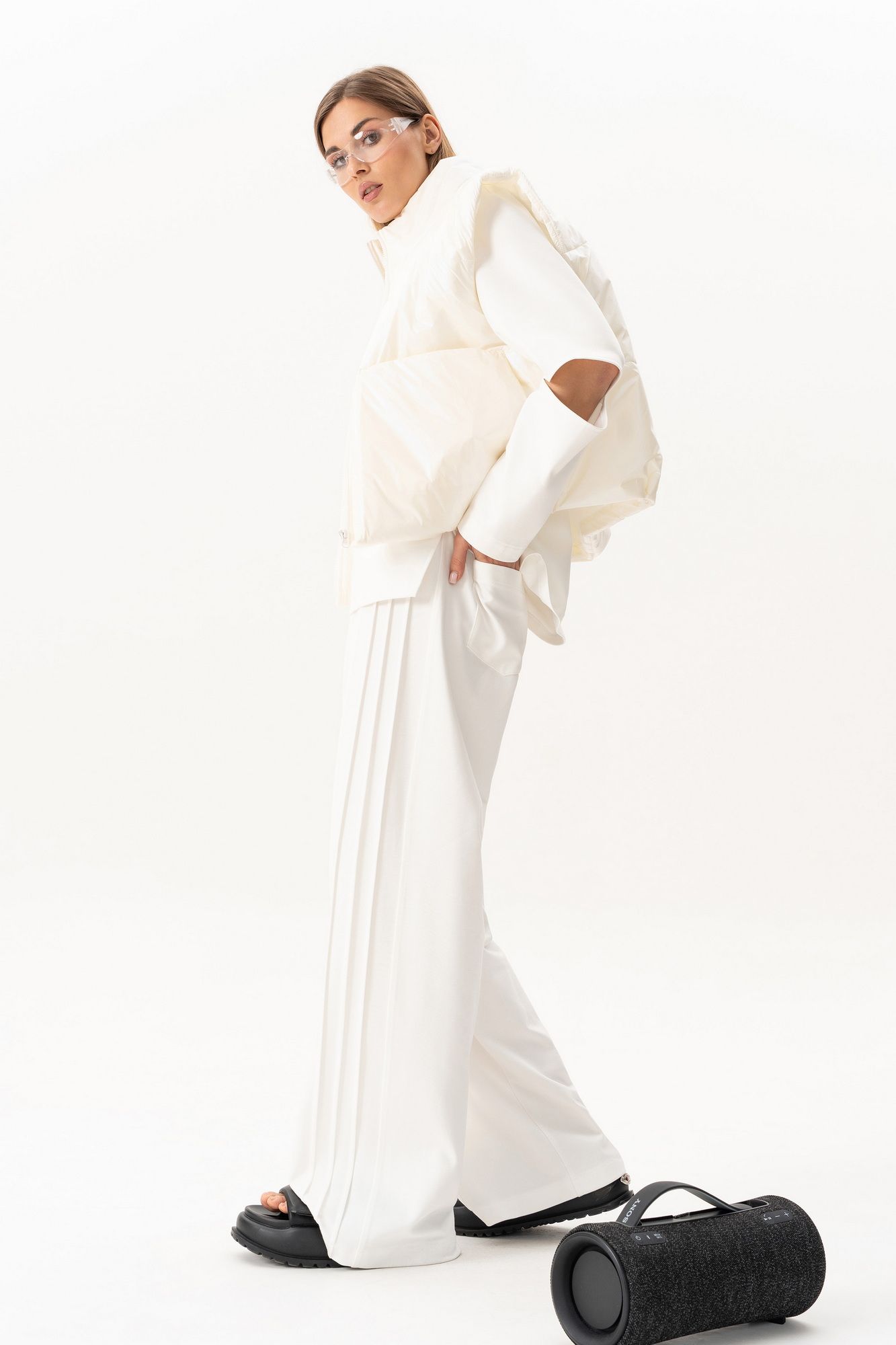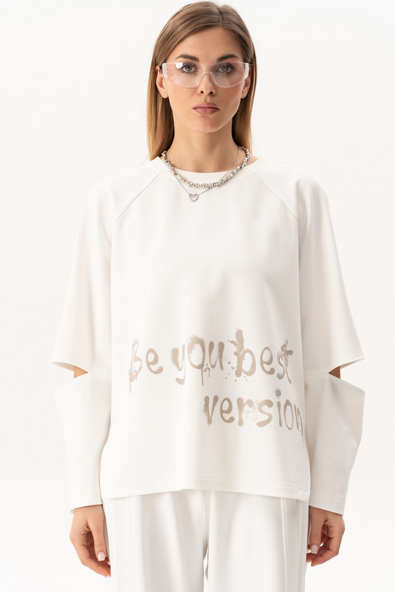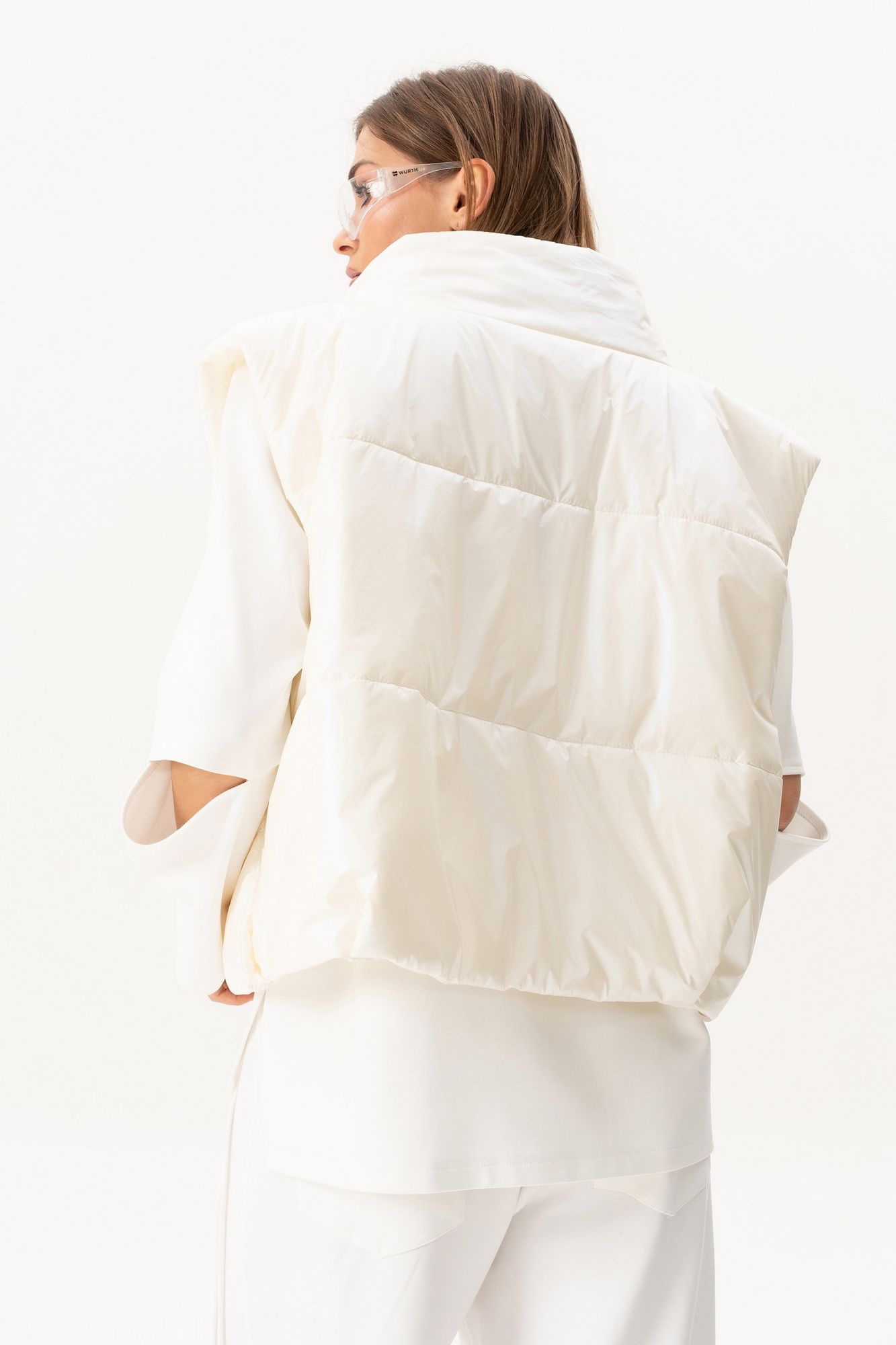 Комплект(жилет,костюм).Жилет женский на синтепоне на подкладке с центральной застёжкой на тесьту-молнию,воротником-стойкой,накладными-отложными карманами.Свитшот прямого силуэта актуального свободного кроя с округлым вырезом горловины,в боковых швах-разрезы,по переду-печать,рукав реглан с разрезами по локтевому сгибу.Брюки высокой посадки на поясе на резинке с декоративной вставкой с защипами, карманами по спинке. длина брюк по боковому шву с поясом -98 см,длина жакета-78см
