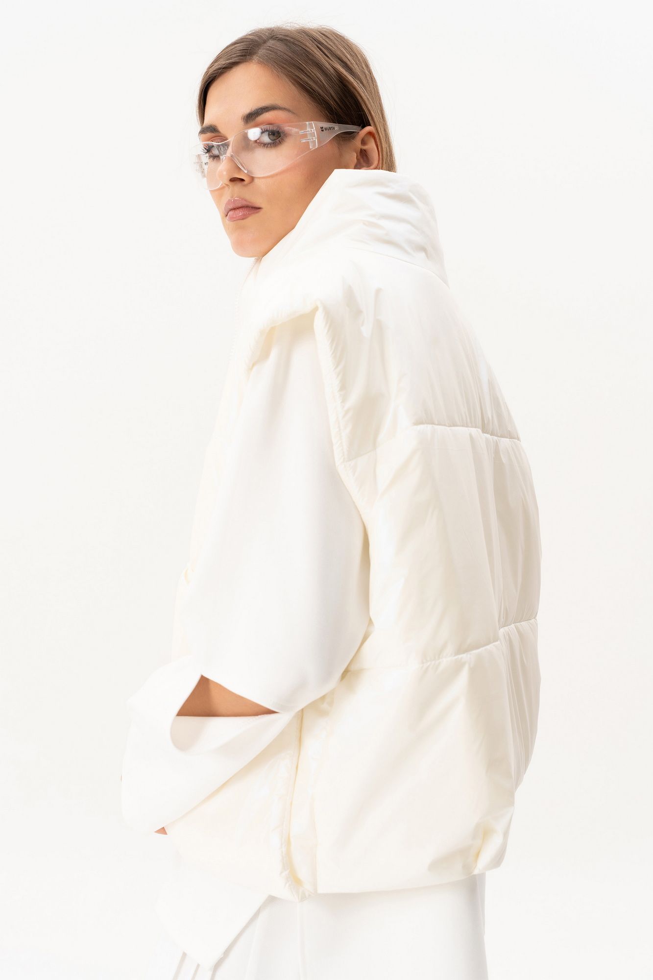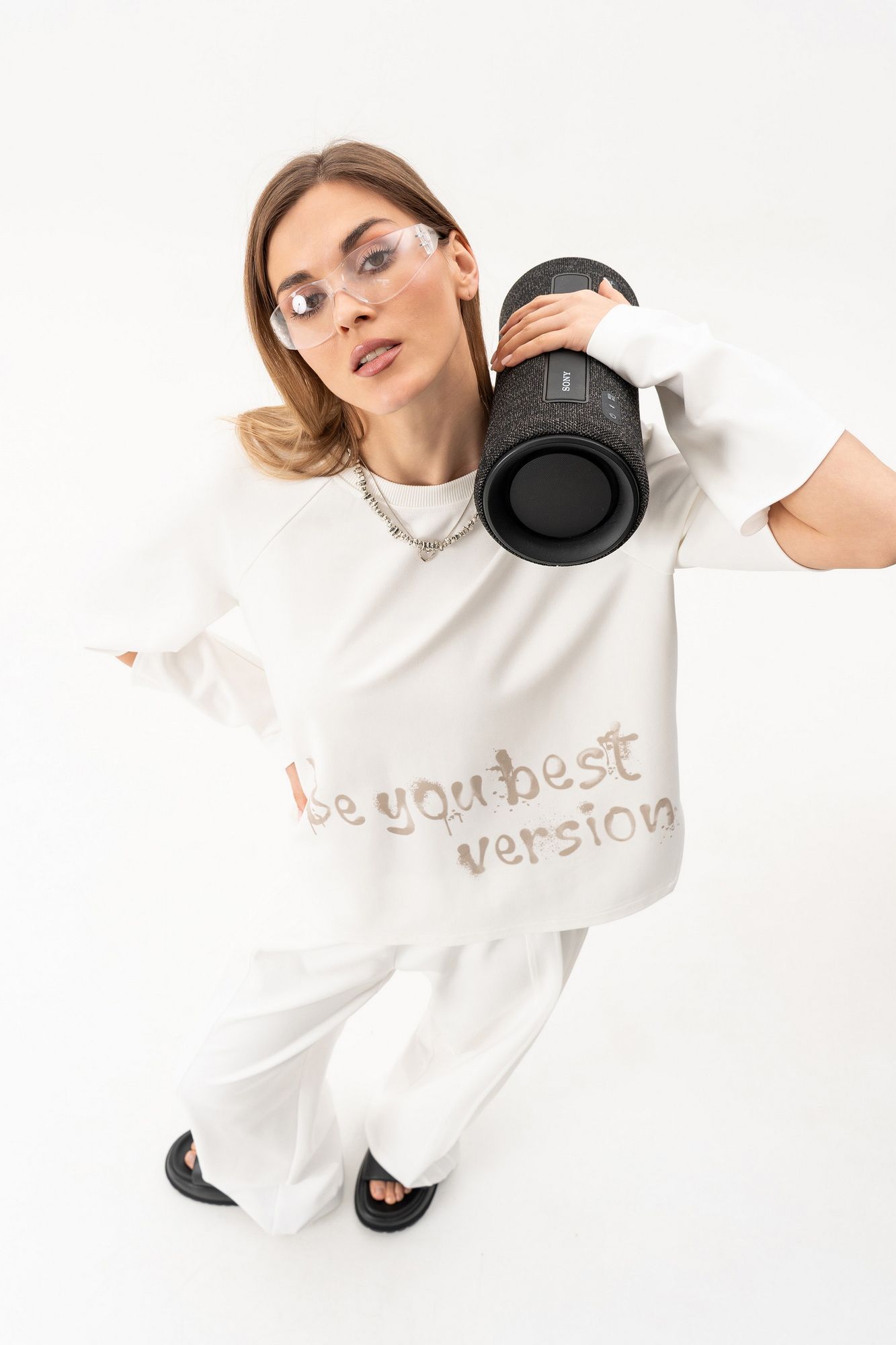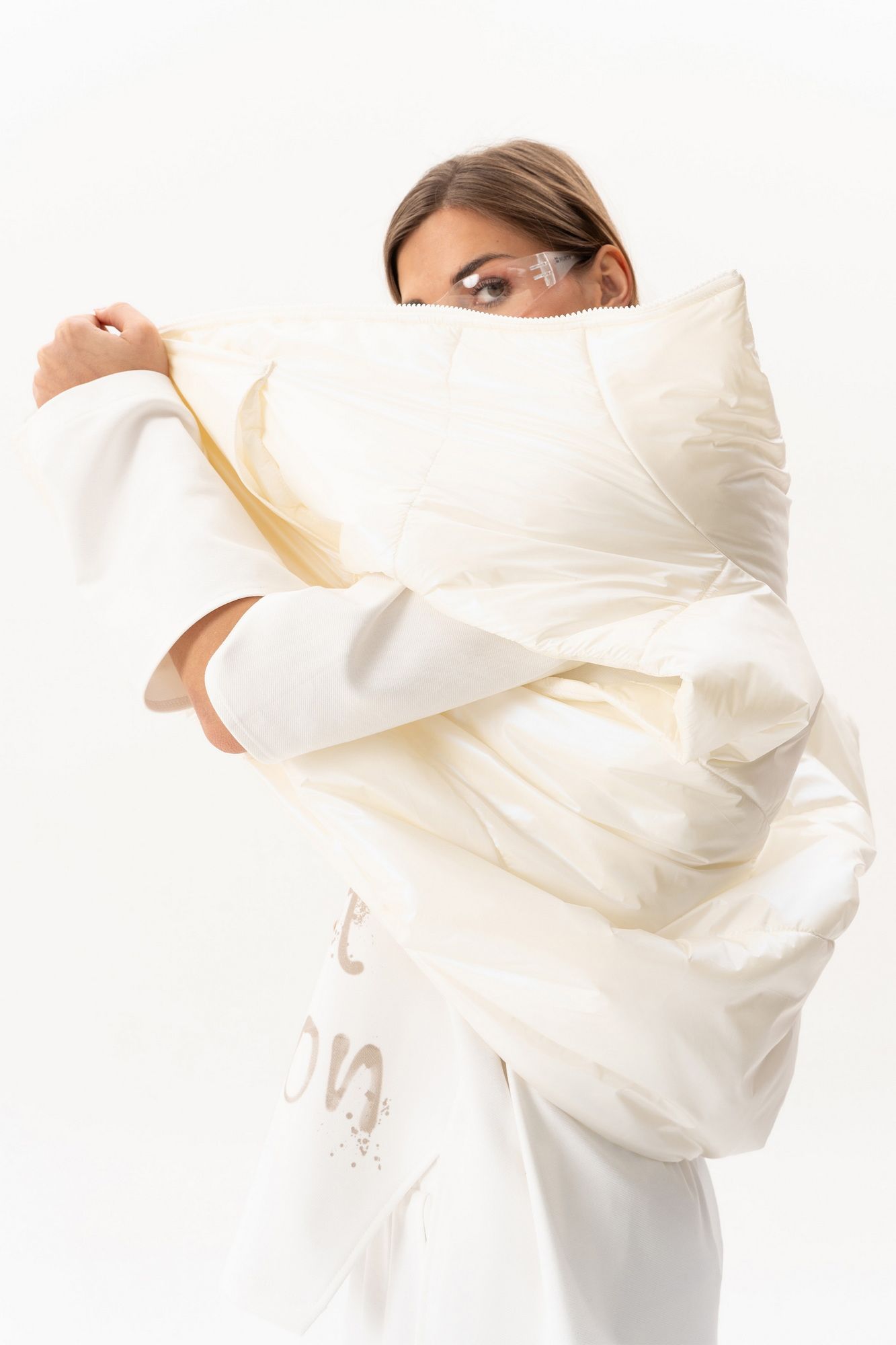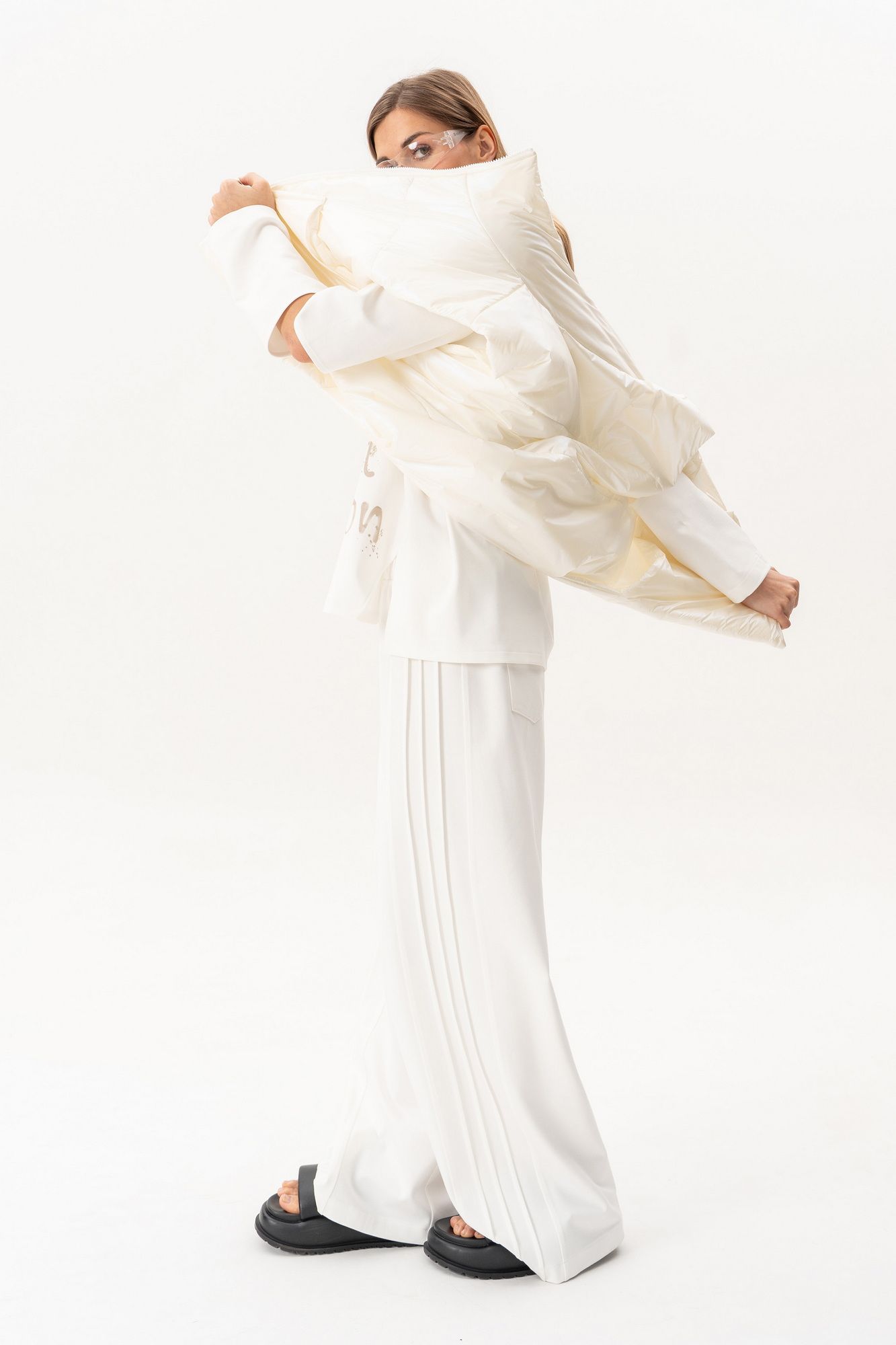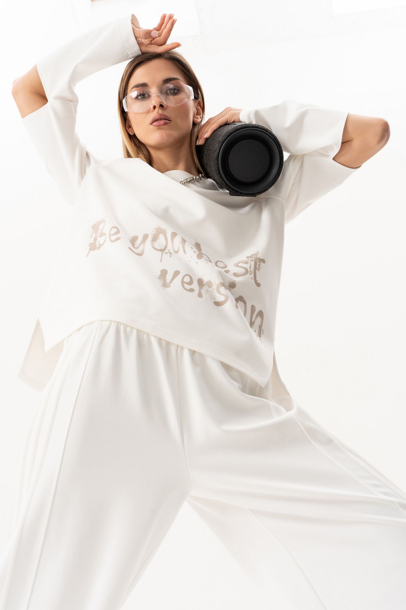 Комплект(жилет,костюм).Жилет женский на синтепоне на подкладке с центральной застёжкой на тесьту-молнию,воротником-стойкой,накладными-отложными карманами.Свитшот прямого силуэта актуального свободного кроя с округлым вырезом горловины,в боковых швах-разрезы,по переду-печать,рукав реглан с разрезами по локтевому сгибу.Брюки высокой посадки на поясе на резинке с декоративной вставкой с защипами, карманами по спинке. длина брюк по боковому шву с поясом -98 см,длина жакета-78см