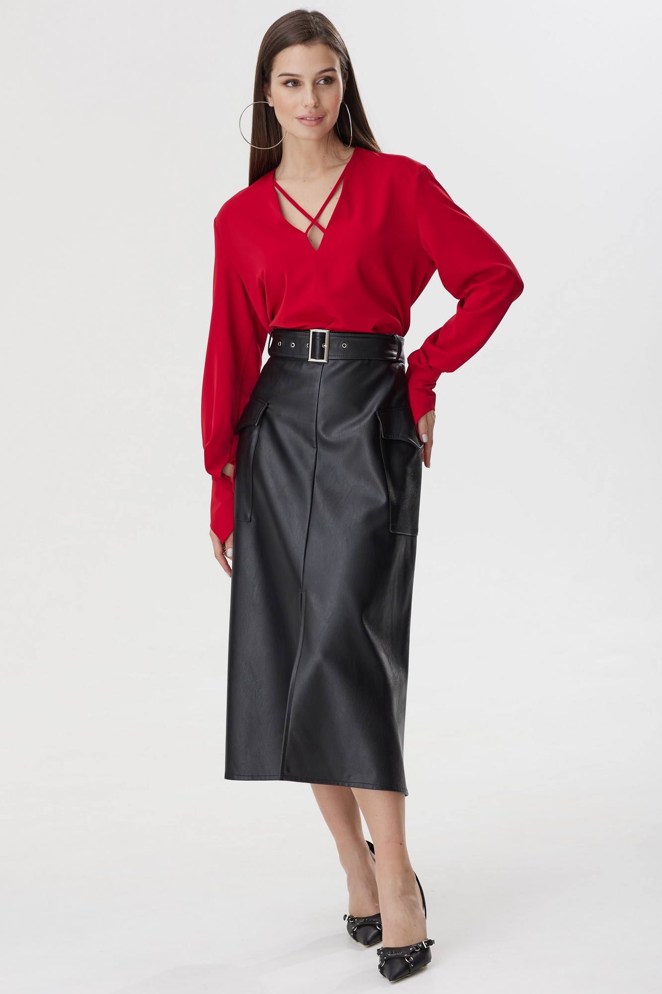 Юбка из эко-кожи на хлопковой основе, расклешенная книзу, на притачном поясе со шлевками для ремня, без подкладки. Переднее полотнище со средним швом, понизу с разрезом. Заднее полотнище с потайной застежкой на молнию в среднем шве. В области бедер обработаны накладные карманы с клапаном. В комплект входит съемный ремень из основной ткани. Длина юбки: 83 см
