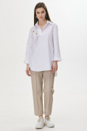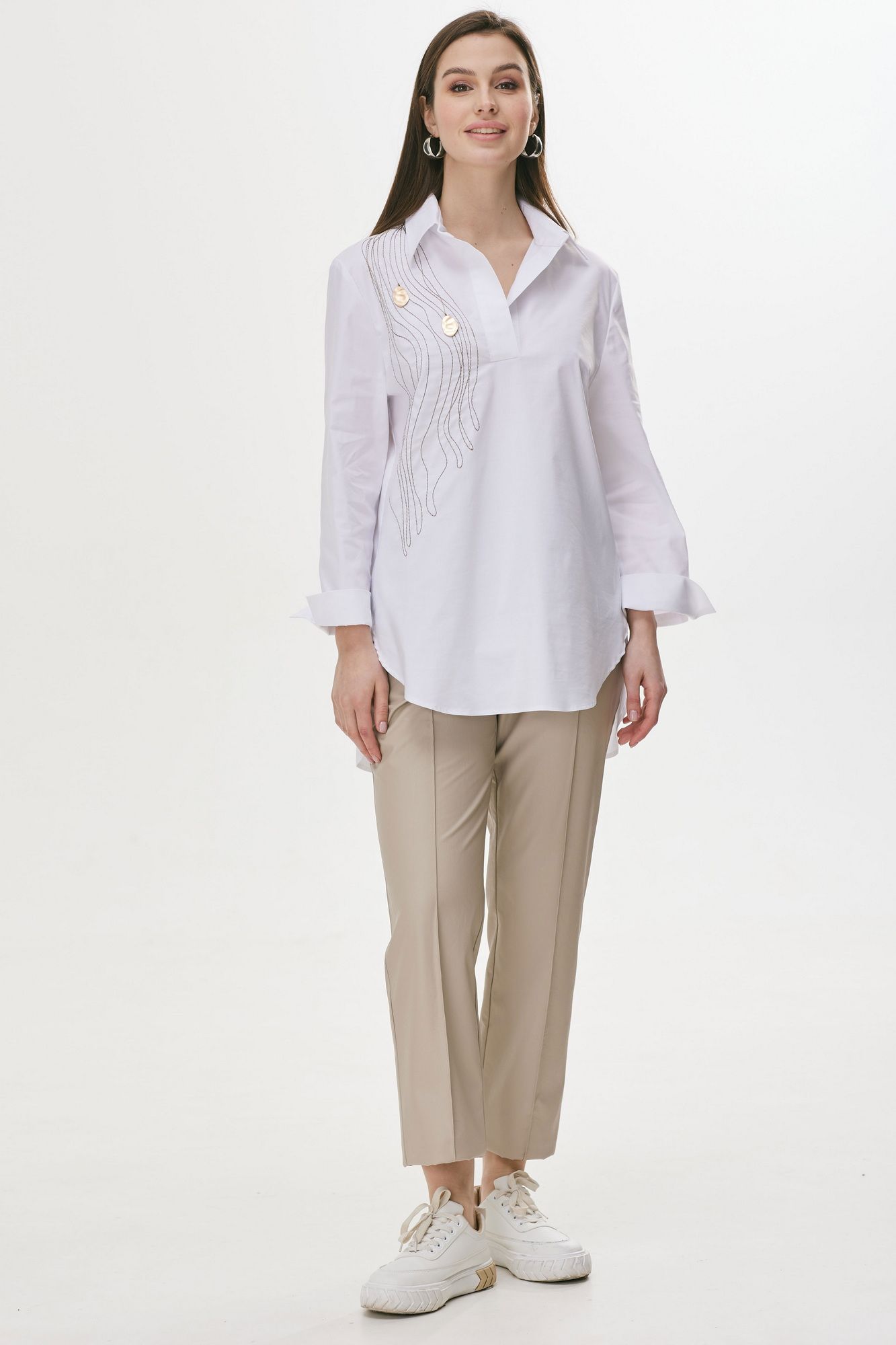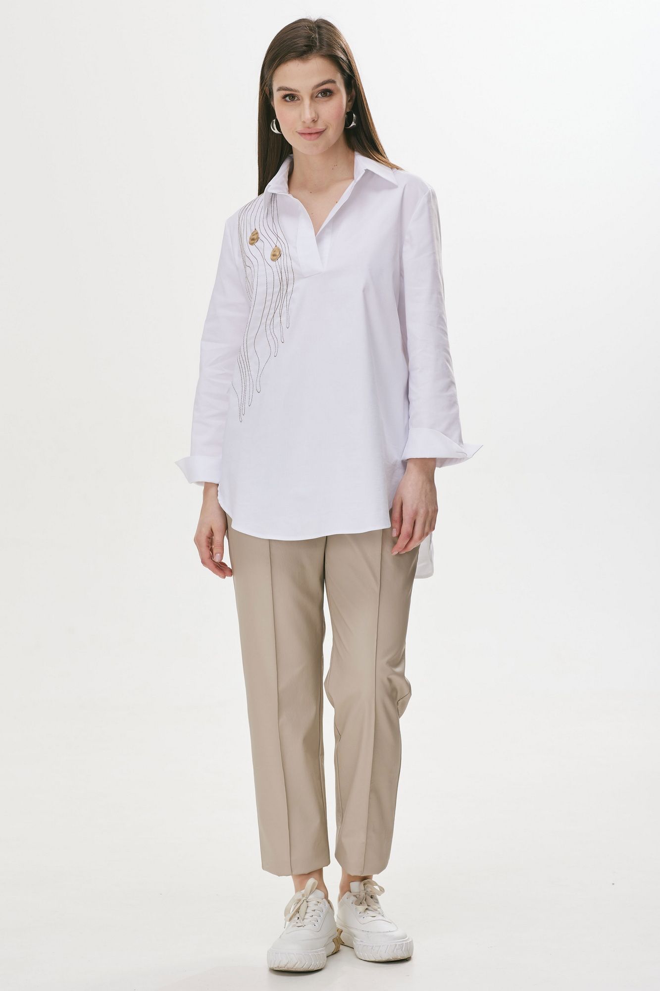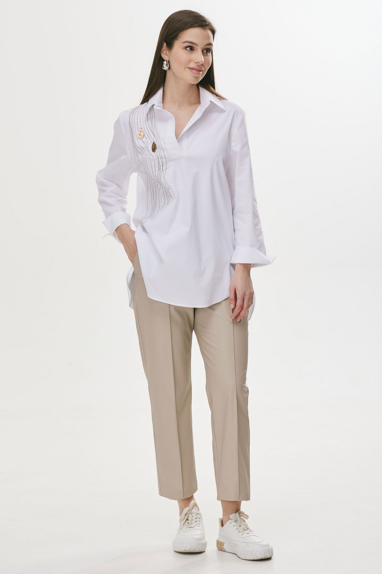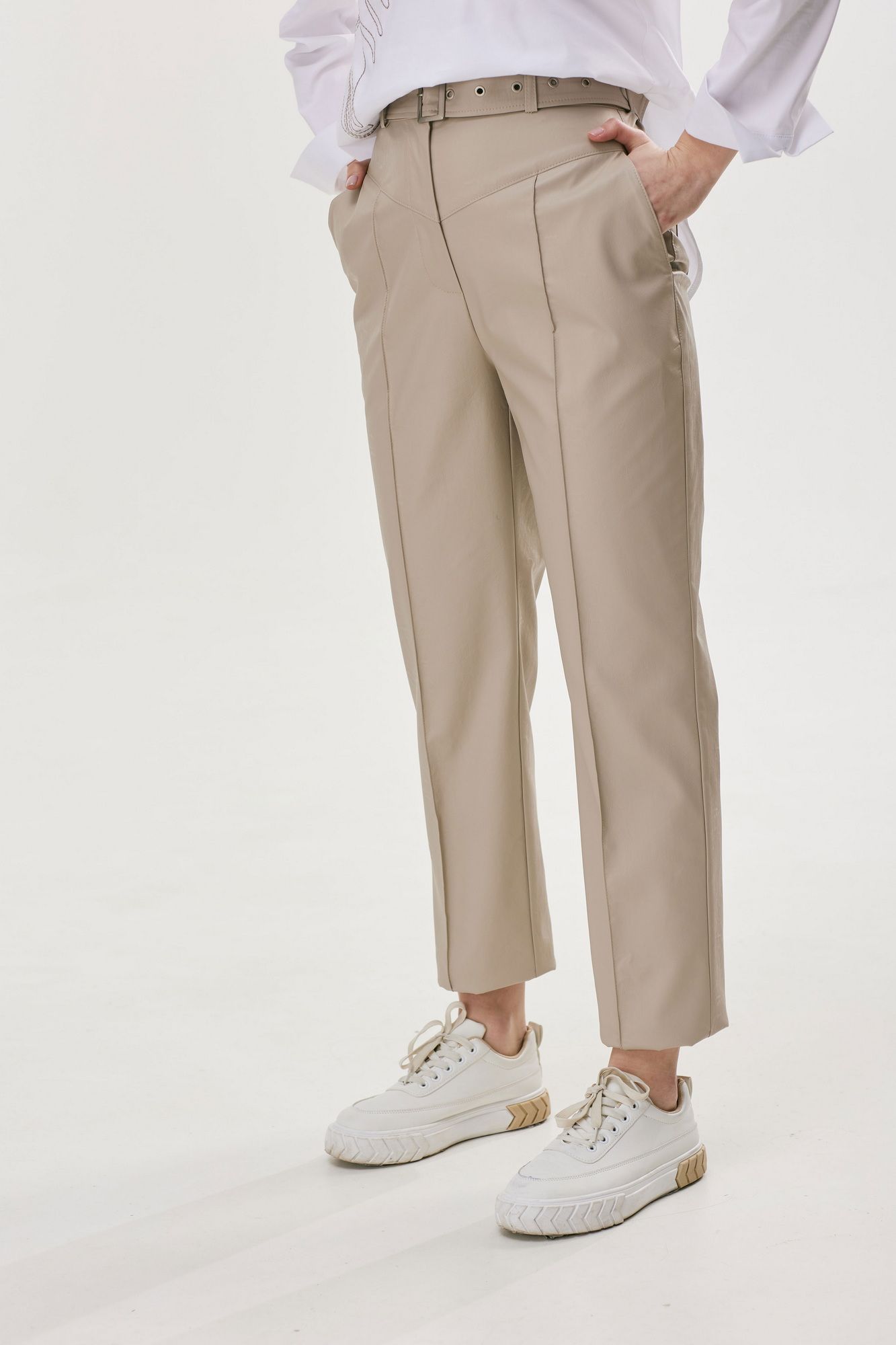 Классические брюки зауженные книзу из экокожи. По верху брюк притачной пояс и шлевки для ремня. Перед и спинка с отрезной кокеткой. На передних половинках брюк наклонные карманы и защипы, на задних – вытачки и накладные карманы. В среднем шве застежка на молнию и пуговицу. В брюки на поясе по спинке вставлена эластичная тесьма (резинка). В комплект входит съемный пояс. Обращаем ваше внимание, что фурнитура может незначительно отличаться от фото. Длина брюк: 99 см + 4.5 см пояс