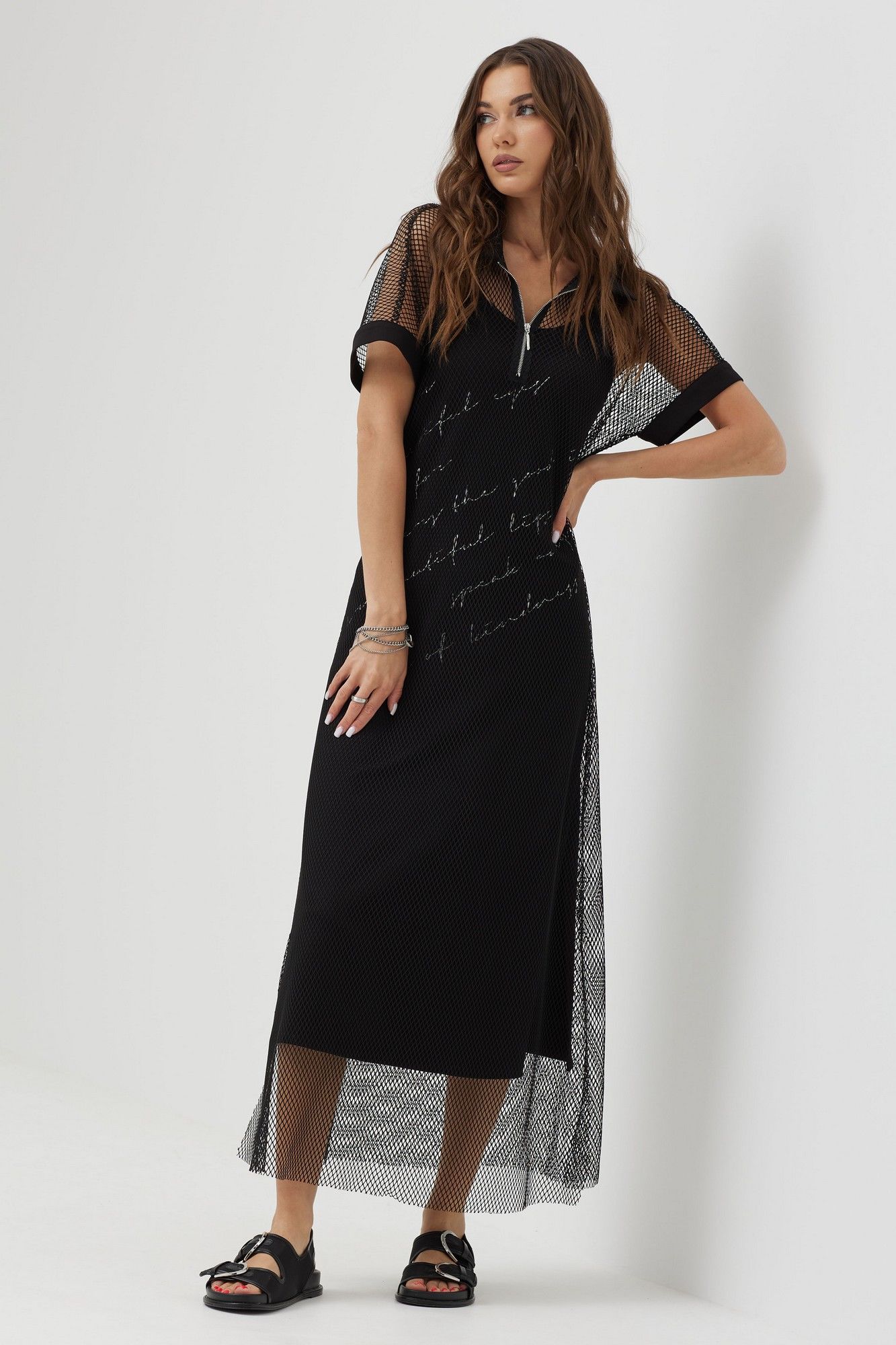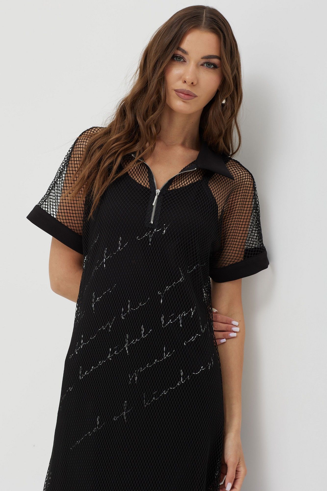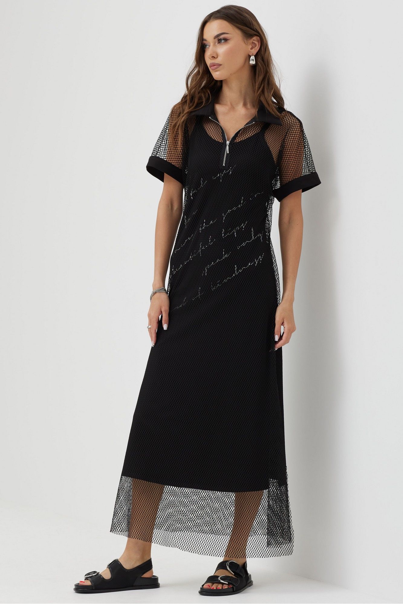 Платье силуэта трапеция из трикотажной сетки, комбинированной однотонным трикотажем. Воротник стояче-отложной с застежкой на молнию по центру. Рукав цельнокроеный, по низу притачная манжета. По низу в боковых швах длинные разрезы. В комплект входит нижнее платье на бретелях полуприлегающего силуэта с дизайнерской печатью. Длина верхнего платья: 137см Длина нижнего изделия : с бретелью 122см Длина рукава от горловины: (44-48р – 29см); (50-54р – 32см)