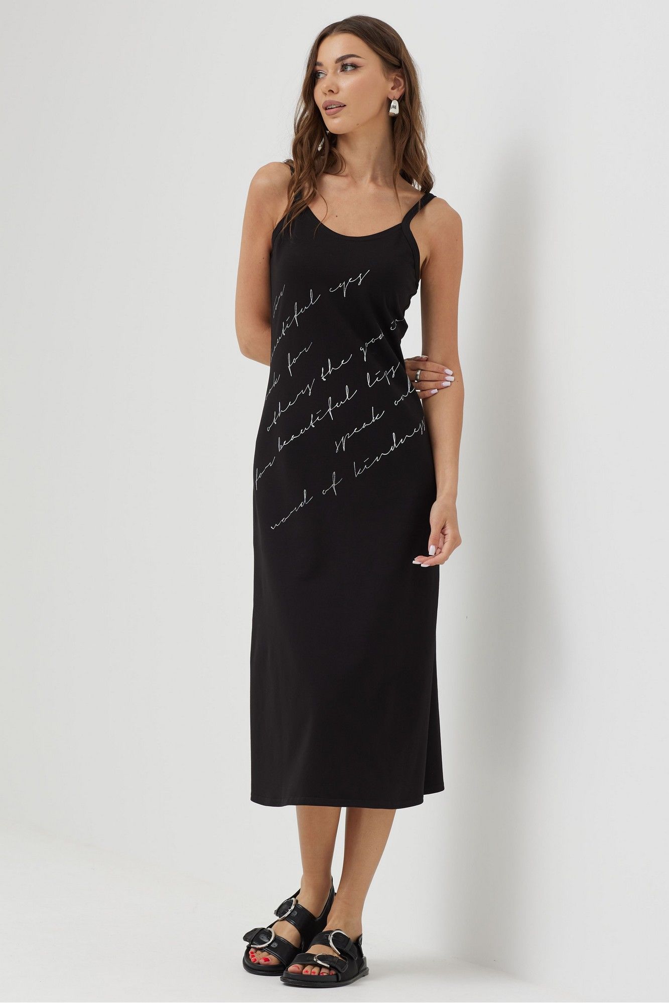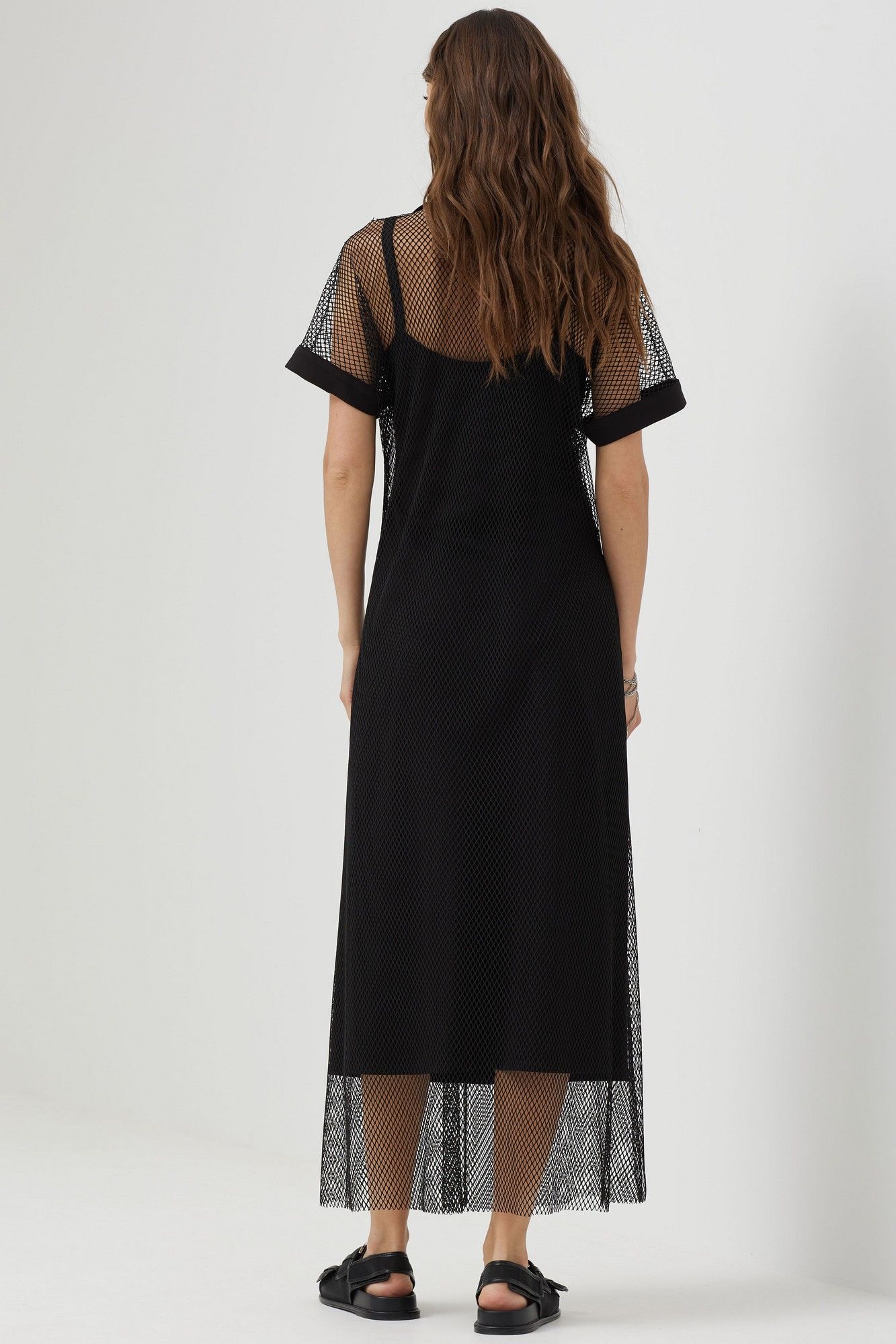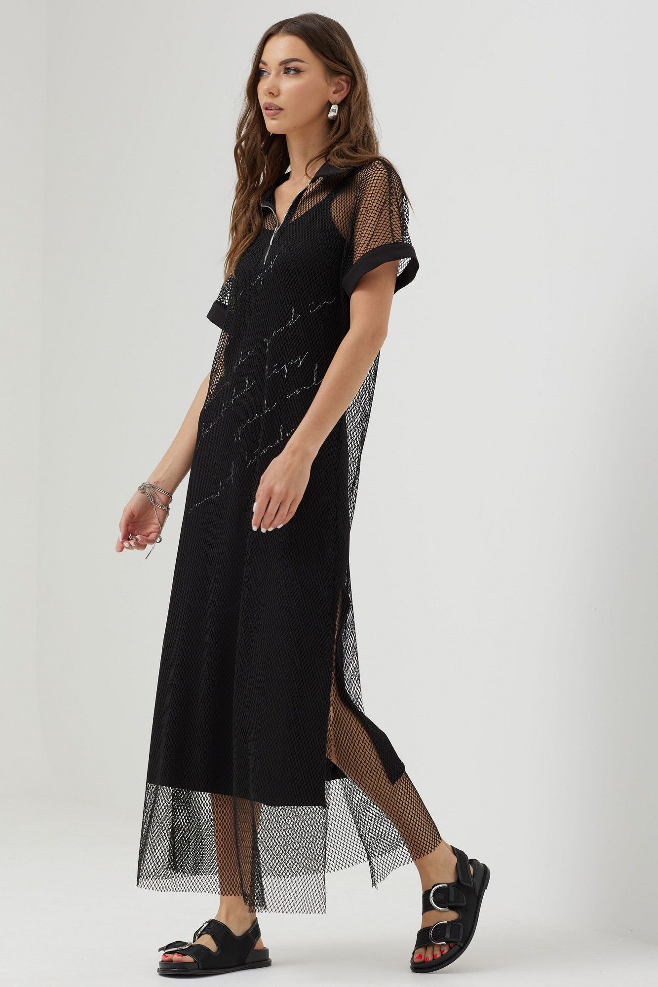 Платье силуэта трапеция из трикотажной сетки, комбинированной однотонным трикотажем. Воротник стояче-отложной с застежкой на молнию по центру. Рукав цельнокроеный, по низу притачная манжета. По низу в боковых швах длинные разрезы. В комплект входит нижнее платье на бретелях полуприлегающего силуэта с дизайнерской печатью. Длина верхнего платья: 137см Длина нижнего изделия : с бретелью 122см Длина рукава от горловины: (44-48р – 29см); (50-54р – 32см)