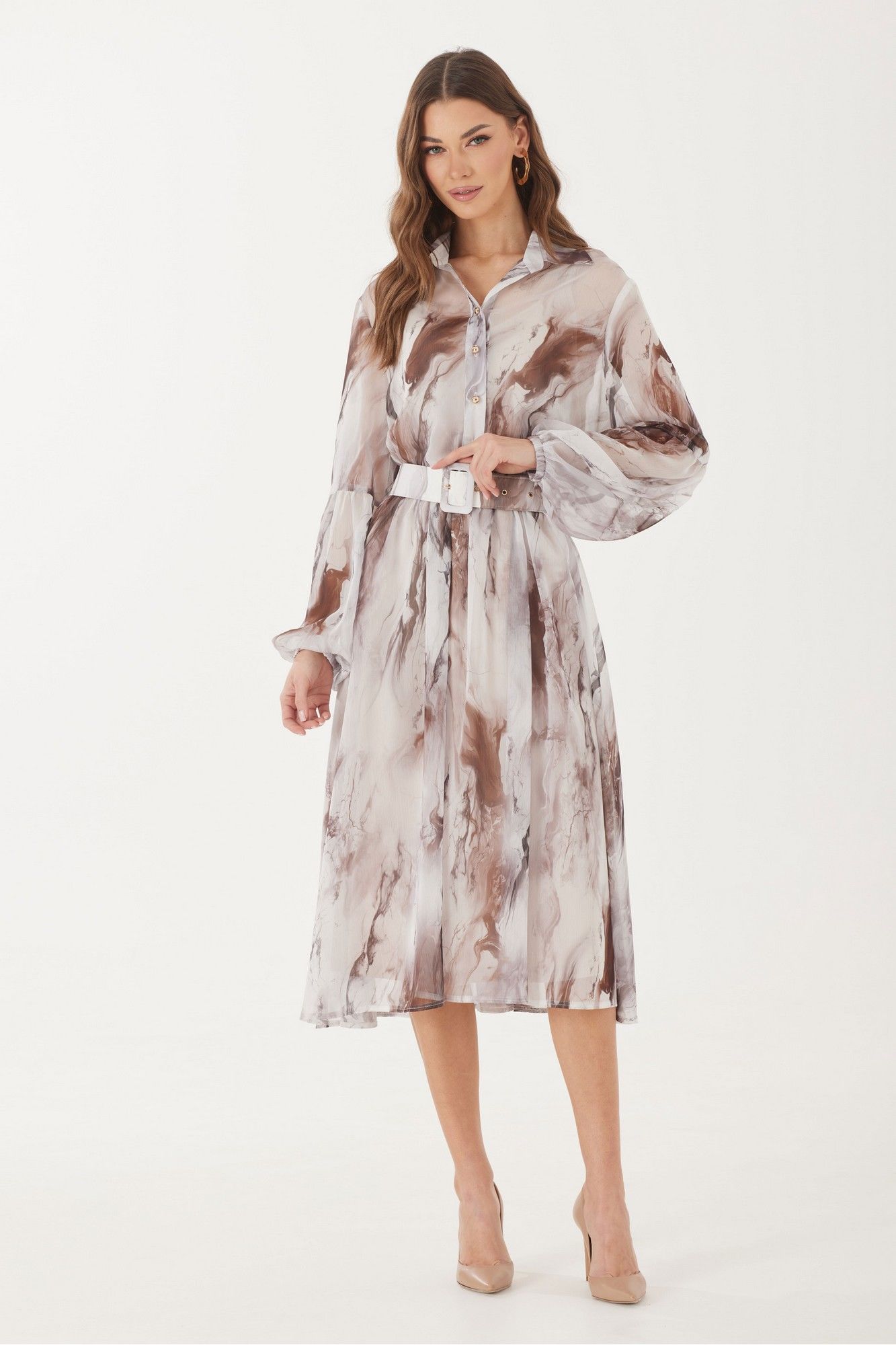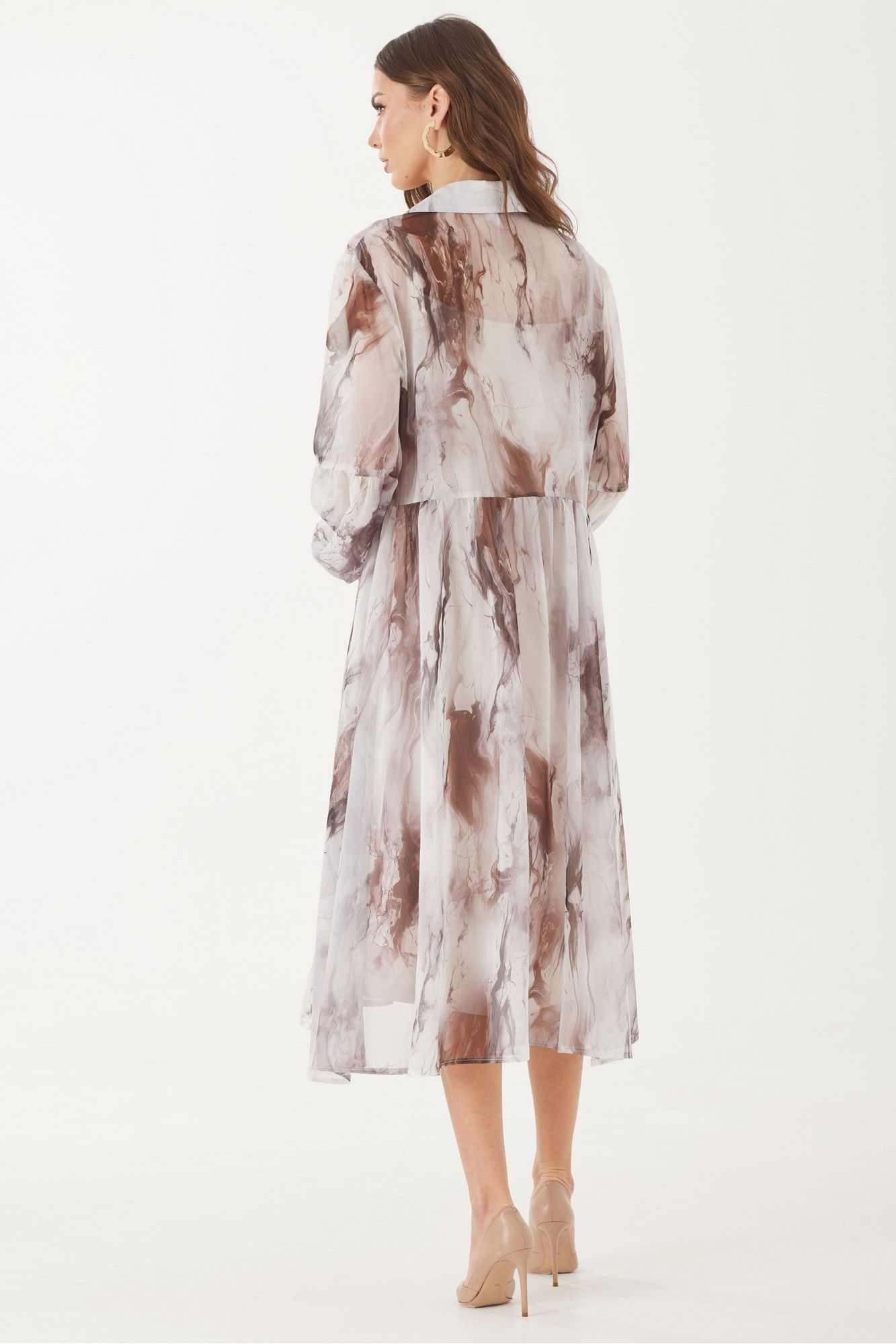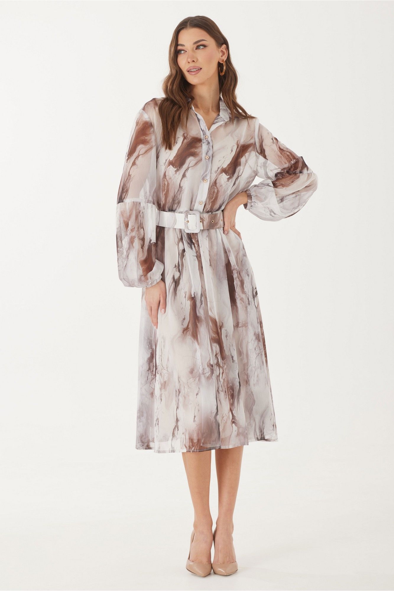 Платье прямого силуэта из шифоновой ткани. Воротник на стойке рубашечного типа с застежкой по центру на петли и пуговицы. Рукав втачной, чуть выше локтя подрез со сборкой. По низу рукав на резинке. Платье отрезное на линии талии, со сборкой по низу. В комплект входит нижнее платье на бретельках из штапеля. В комплект входит съемный пояс. Обращаем ваше внимание, что фурнитура может незначительно отличаться от фото. Длина платья: 116см Длина рукава: 63см Длина нижнего платья: 44-48р -98см +бретель 99см