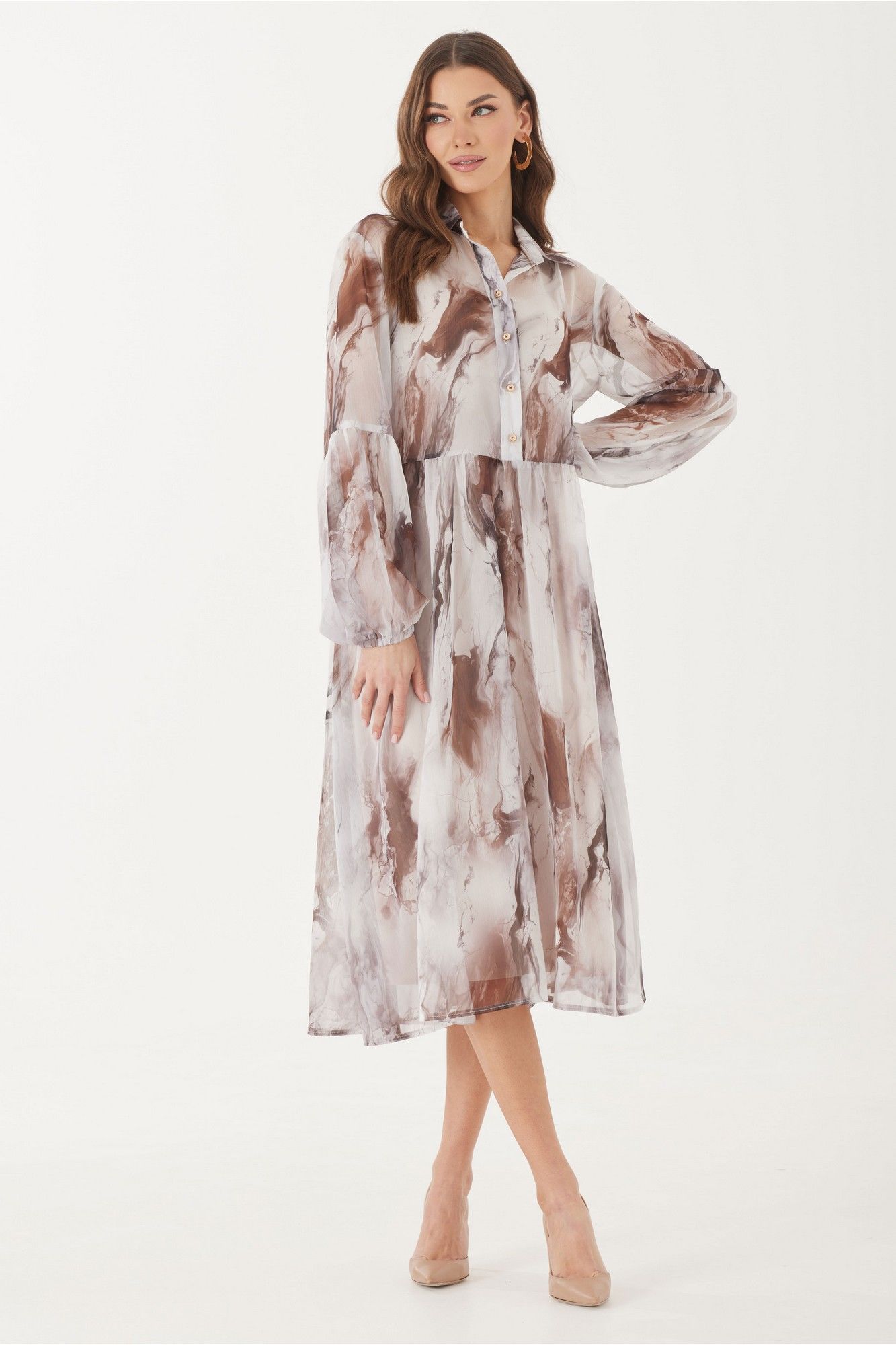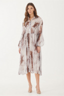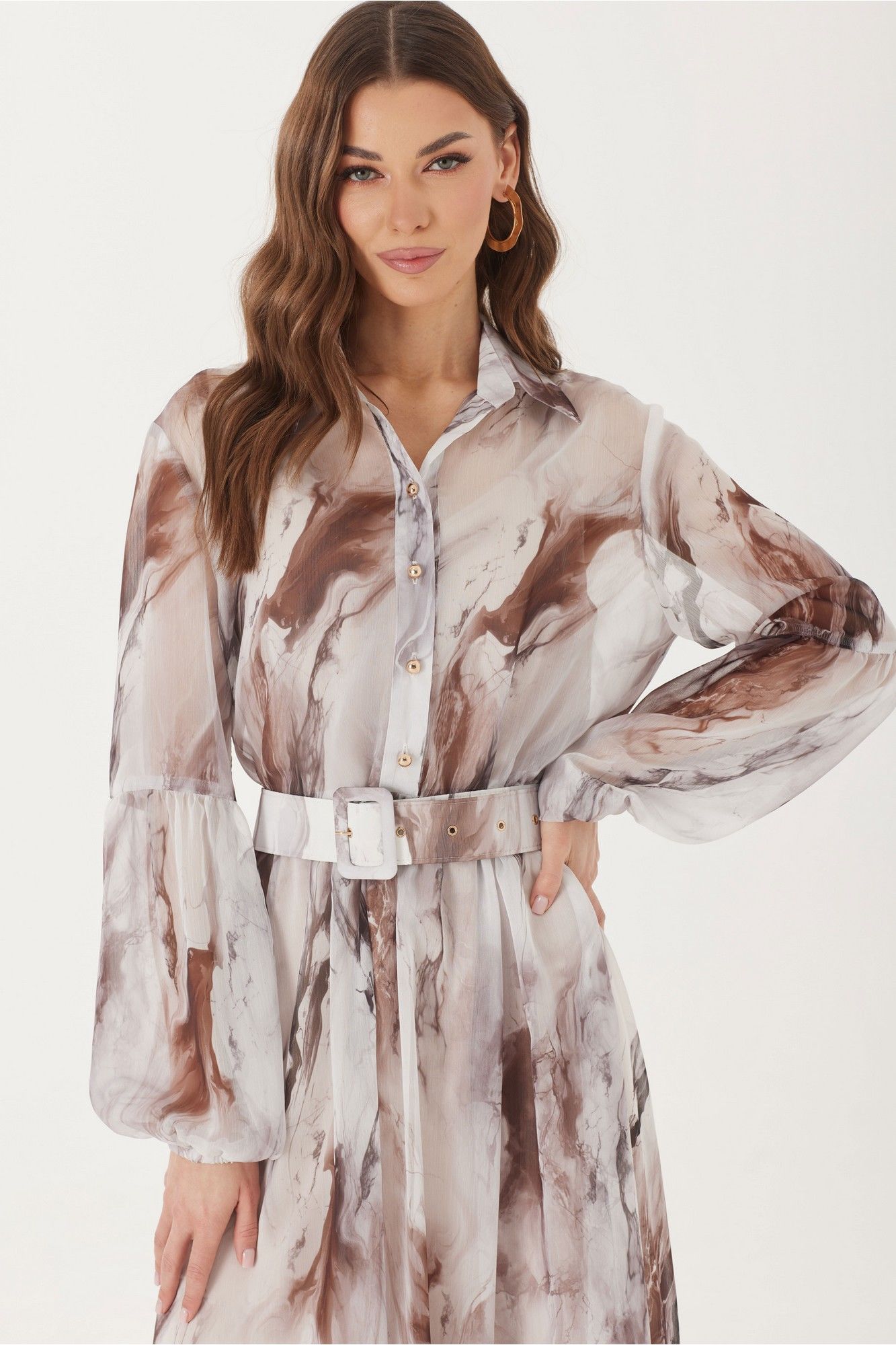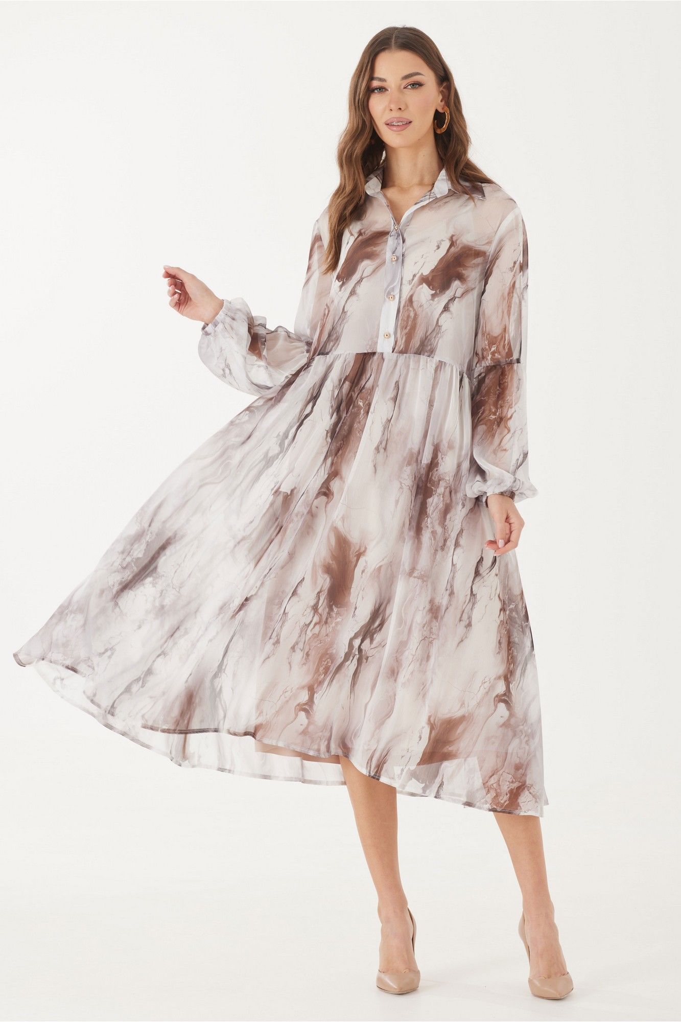 Платье прямого силуэта из шифоновой ткани. Воротник на стойке рубашечного типа с застежкой по центру на петли и пуговицы. Рукав втачной, чуть выше локтя подрез со сборкой. По низу рукав на резинке. Платье отрезное на линии талии, со сборкой по низу. В комплект входит нижнее платье на бретельках из штапеля. В комплект входит съемный пояс. Обращаем ваше внимание, что фурнитура может незначительно отличаться от фото. Длина платья: 116см Длина рукава: 63см Длина нижнего платья: 44-48р -98см +бретель 99см