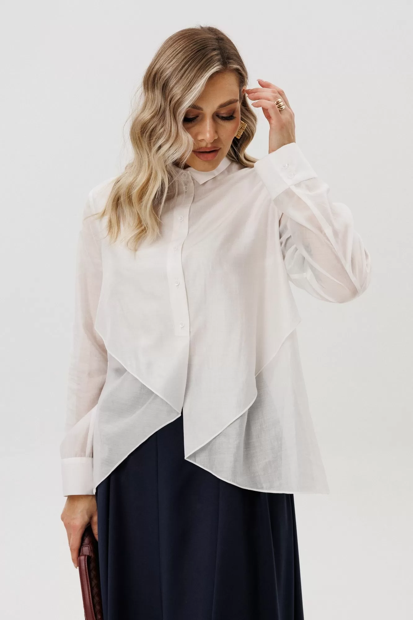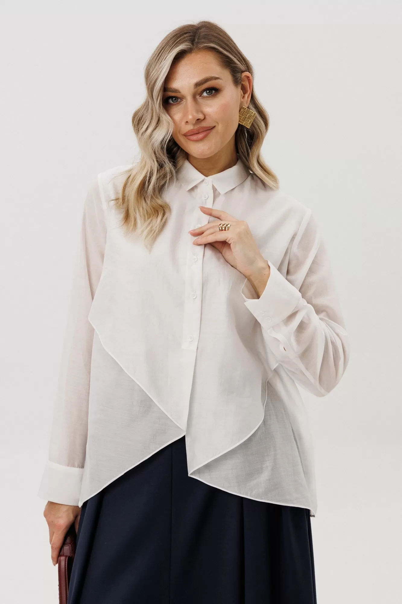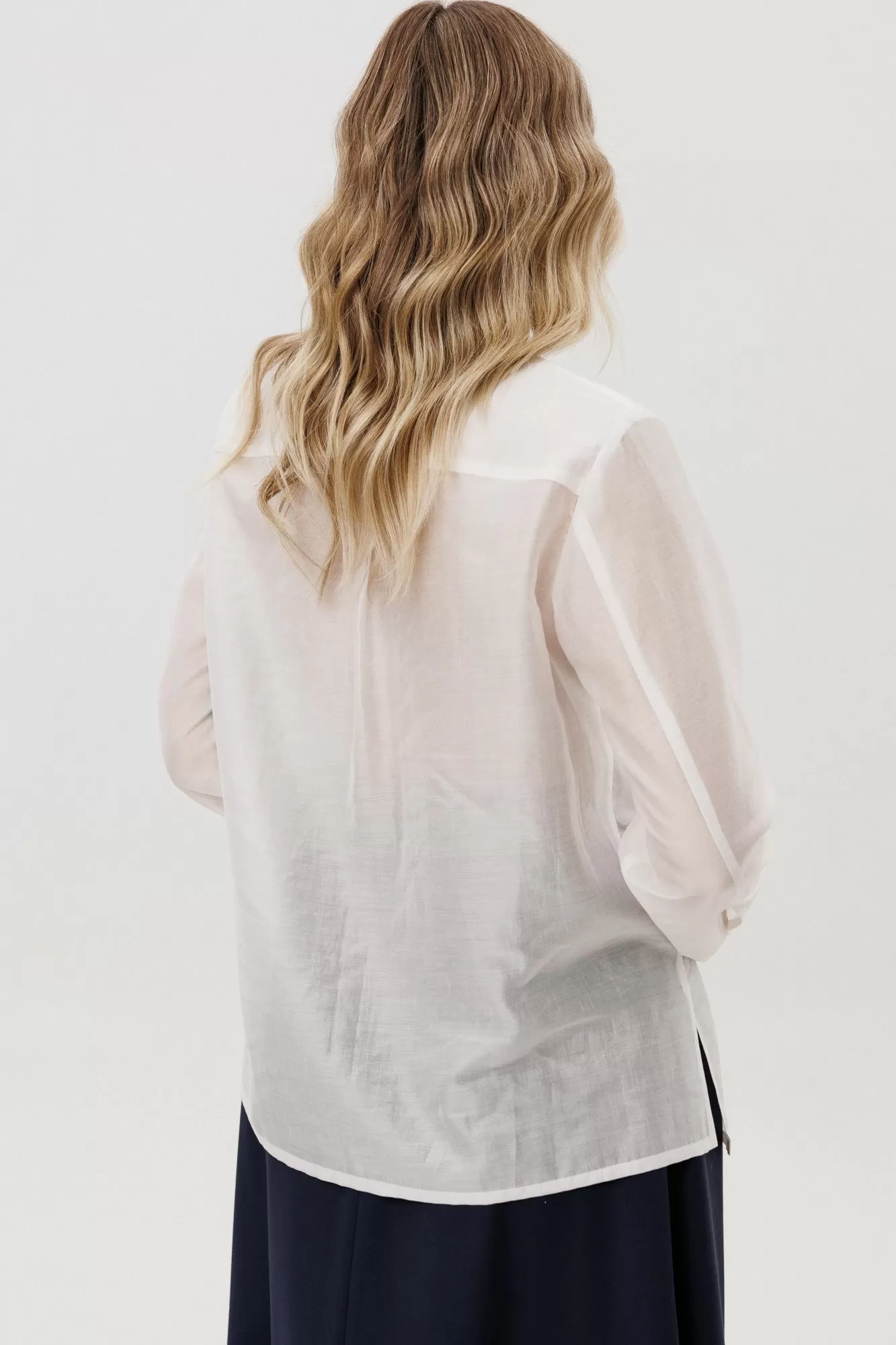 Рубашка прямого силуэта с воротнико на стойке и втачным рукавом с манжетами. Полочка двойная с ассиметричной линией низа.