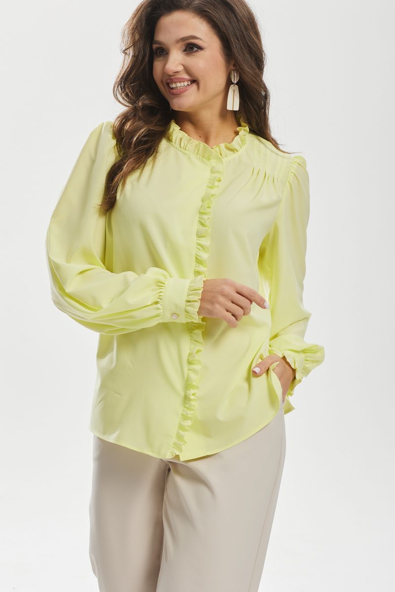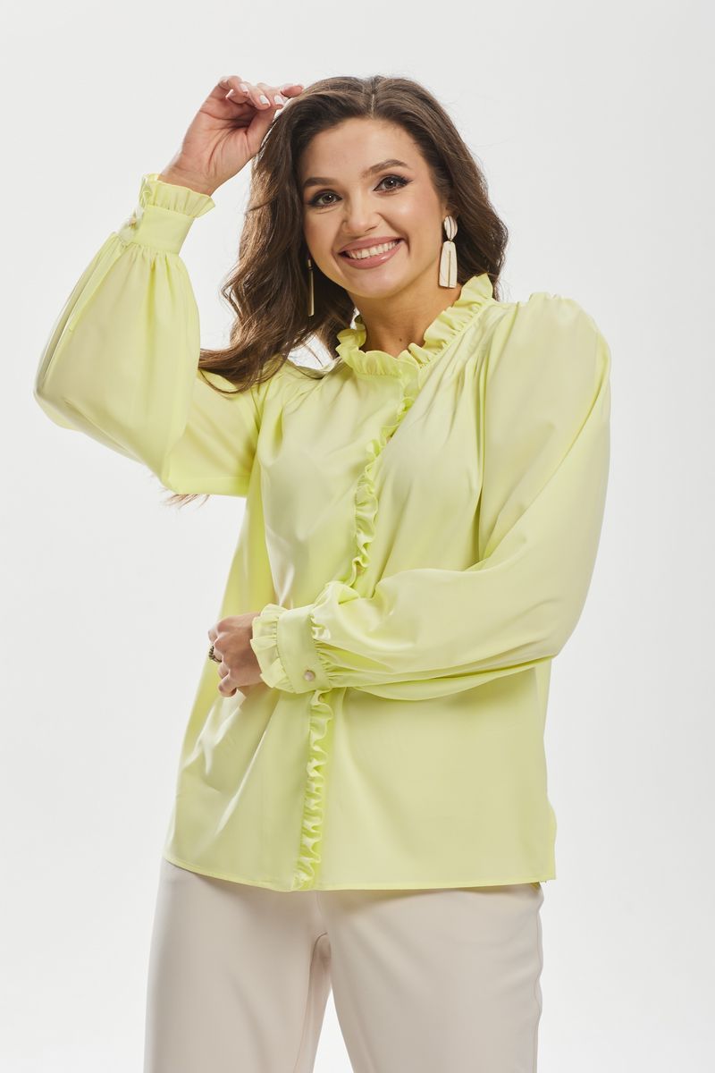 Блузка из тонкой струящейся ткани. Горловина и край борта отделаны рюшей. По верхней части полочки из плеча сформирована драпировка за счет застроченных складок. Застежка на воздушные петли и пуговицы. (спрятана под рюшей). Рукав асширенный к низу со сборкой по окату и низу рукава. Манжет с рюшей. По низу боковых швов разрезы.