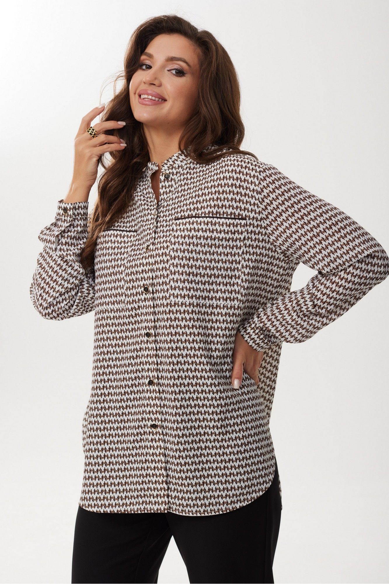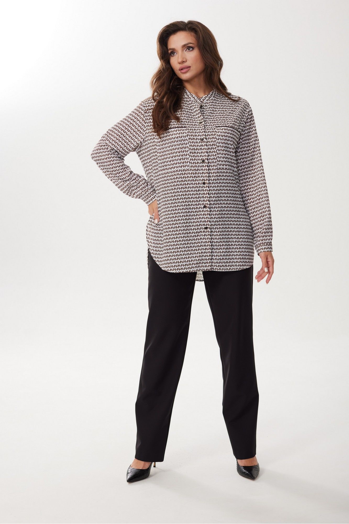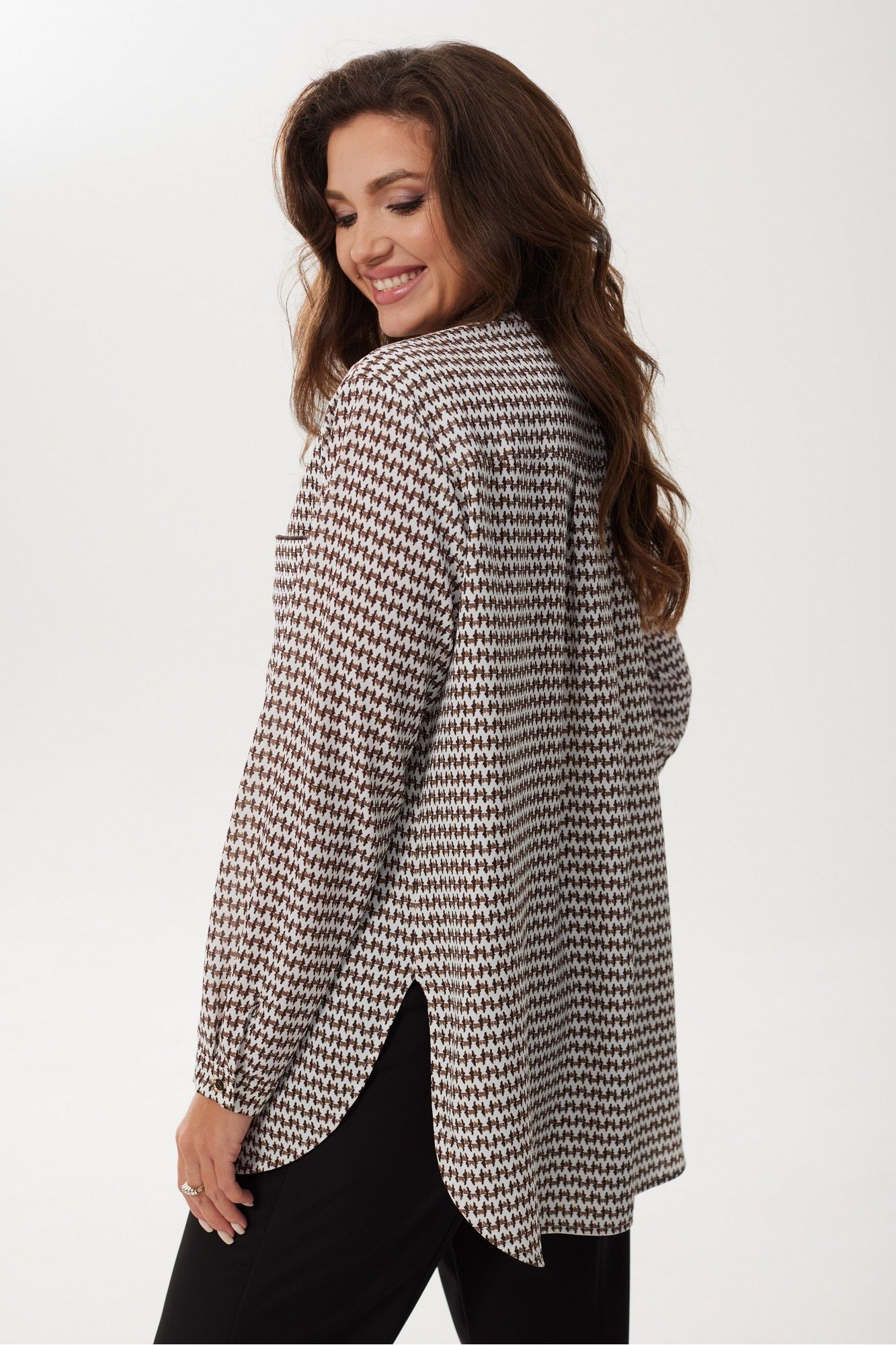 Блуза из легкой ткани (не просвечивается). Длинный рубашечный рукав со складкой, на манжете и застежкой на одну пуговицу. По спинке кокетка с двумя выходящими складками. По переду накладные карманы с отделкой по верхнему краю. Воротник рубашечный с отрезной стойкой. Низ разноуровневый закругленный.