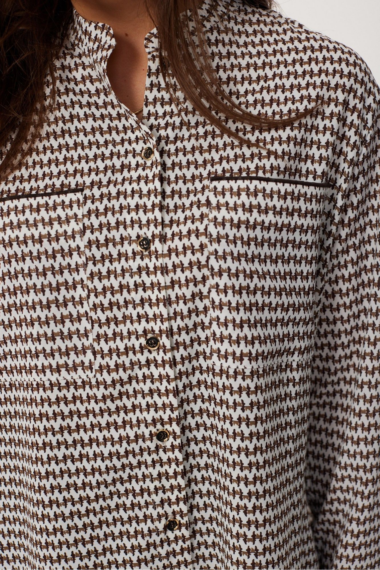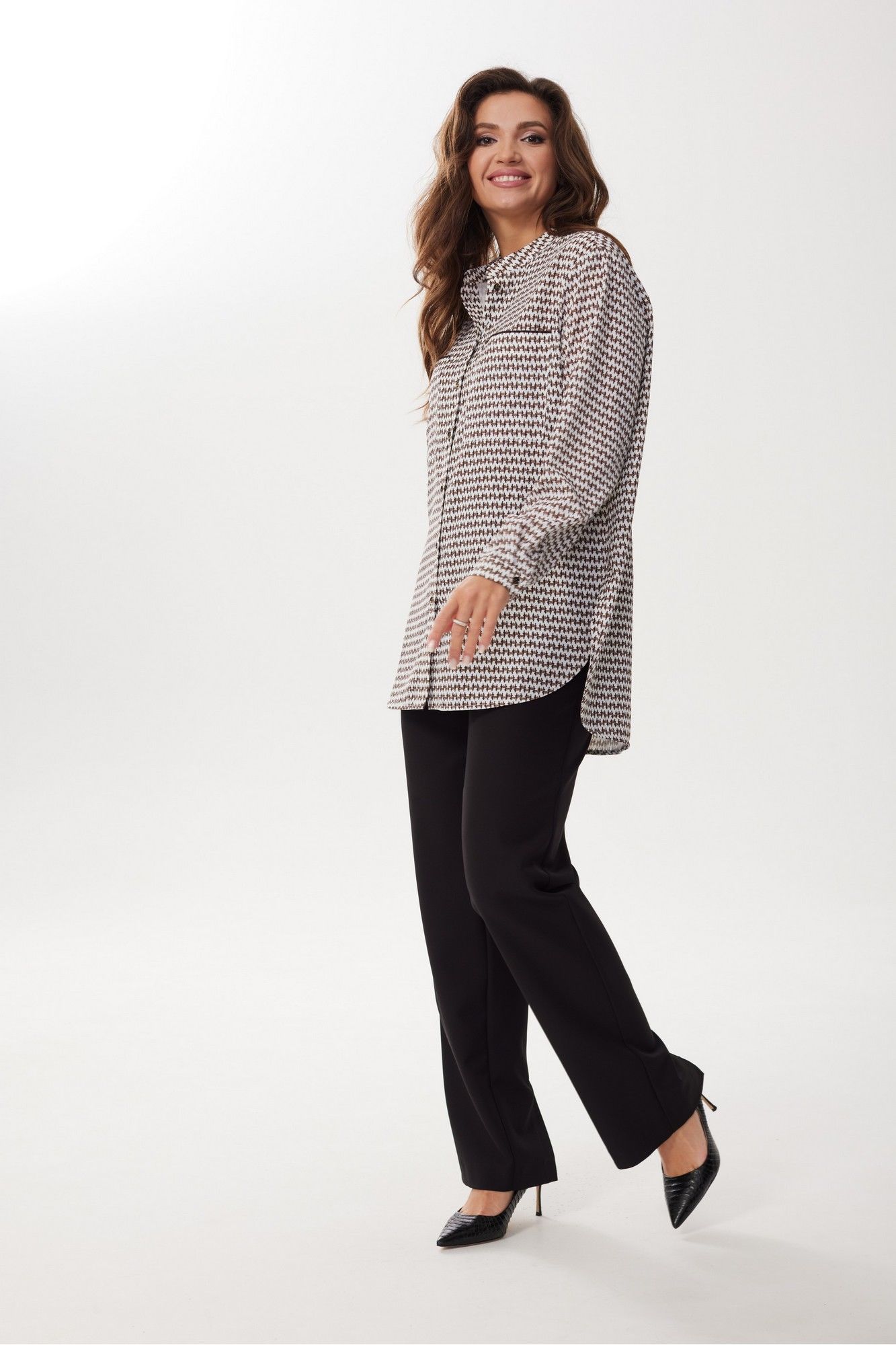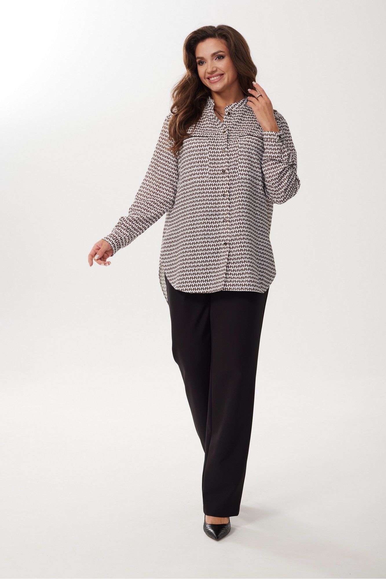 Блуза из легкой ткани (не просвечивается). Длинный рубашечный рукав со складкой, на манжете и застежкой на одну пуговицу. По спинке кокетка с двумя выходящими складками. По переду накладные карманы с отделкой по верхнему краю. Воротник рубашечный с отрезной стойкой. Низ разноуровневый закругленный.