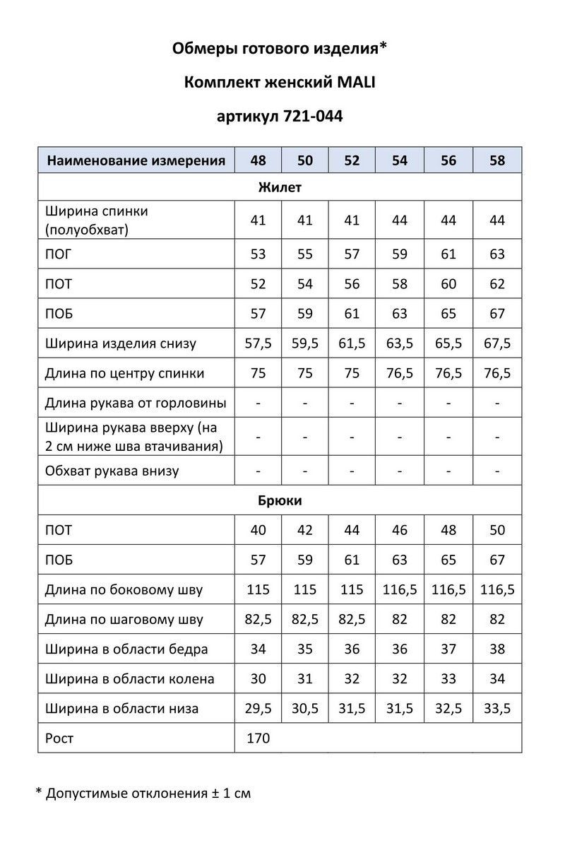 Костюм льняной 2-х предметный от MALI, состоящий из жилета и брюк. Жилет прямого силуэта без подклажки, на центральной двубортной застежке на петли и пуговицы. Перед с талиевыми вытачками и прорезными карманами "в рамку" с клапанами. Спинка со средним швом, внизу которого шлица. Воротник стояче-отложной с лацканами. Жилет удлиненный, в комплекте идет съемный пояс из основной ткани. Брюки прямые, расширенные к низу, на прямом поясе с резинкой по кругу. Перед с наклонными карманами у боковых швов.