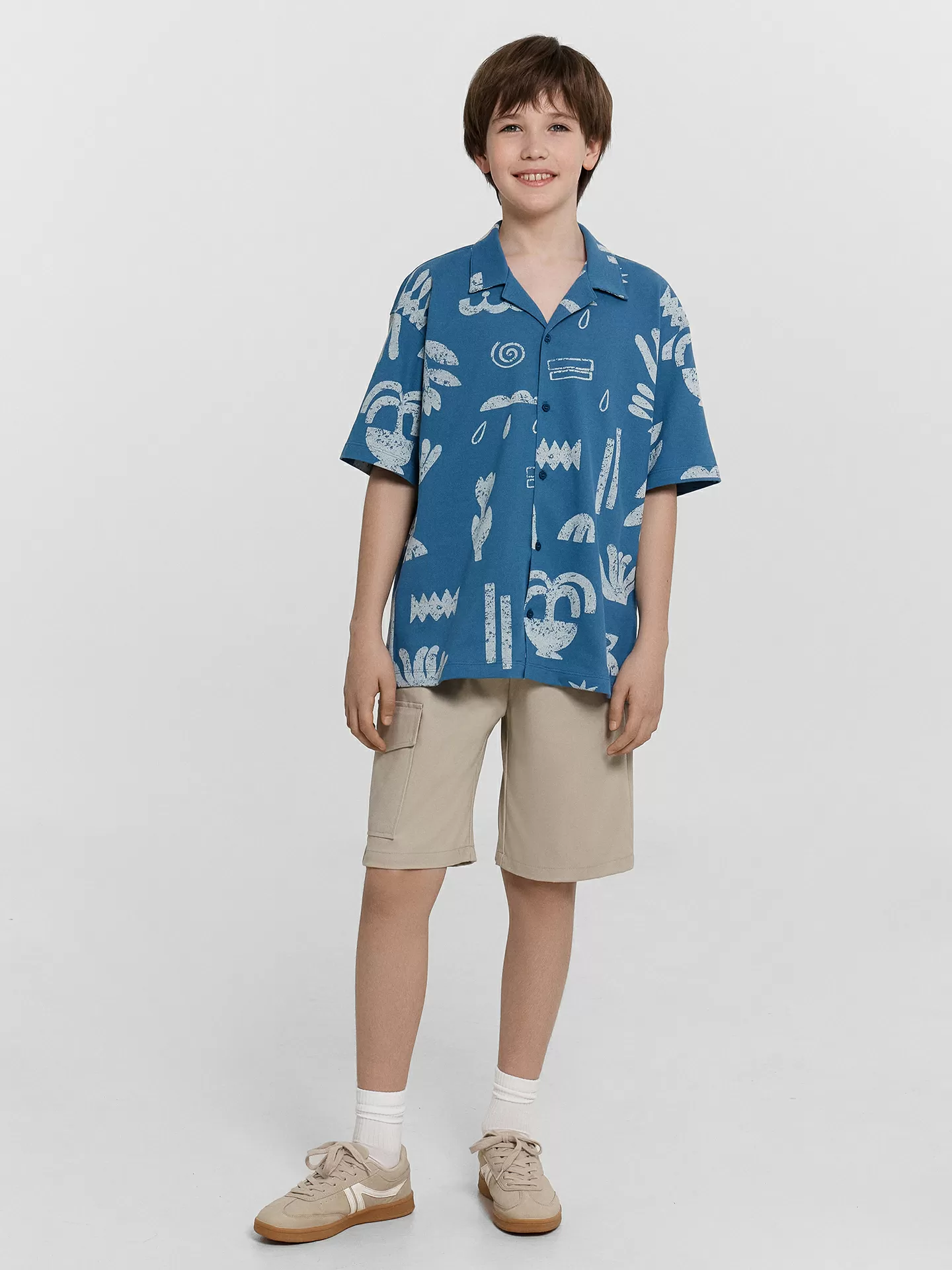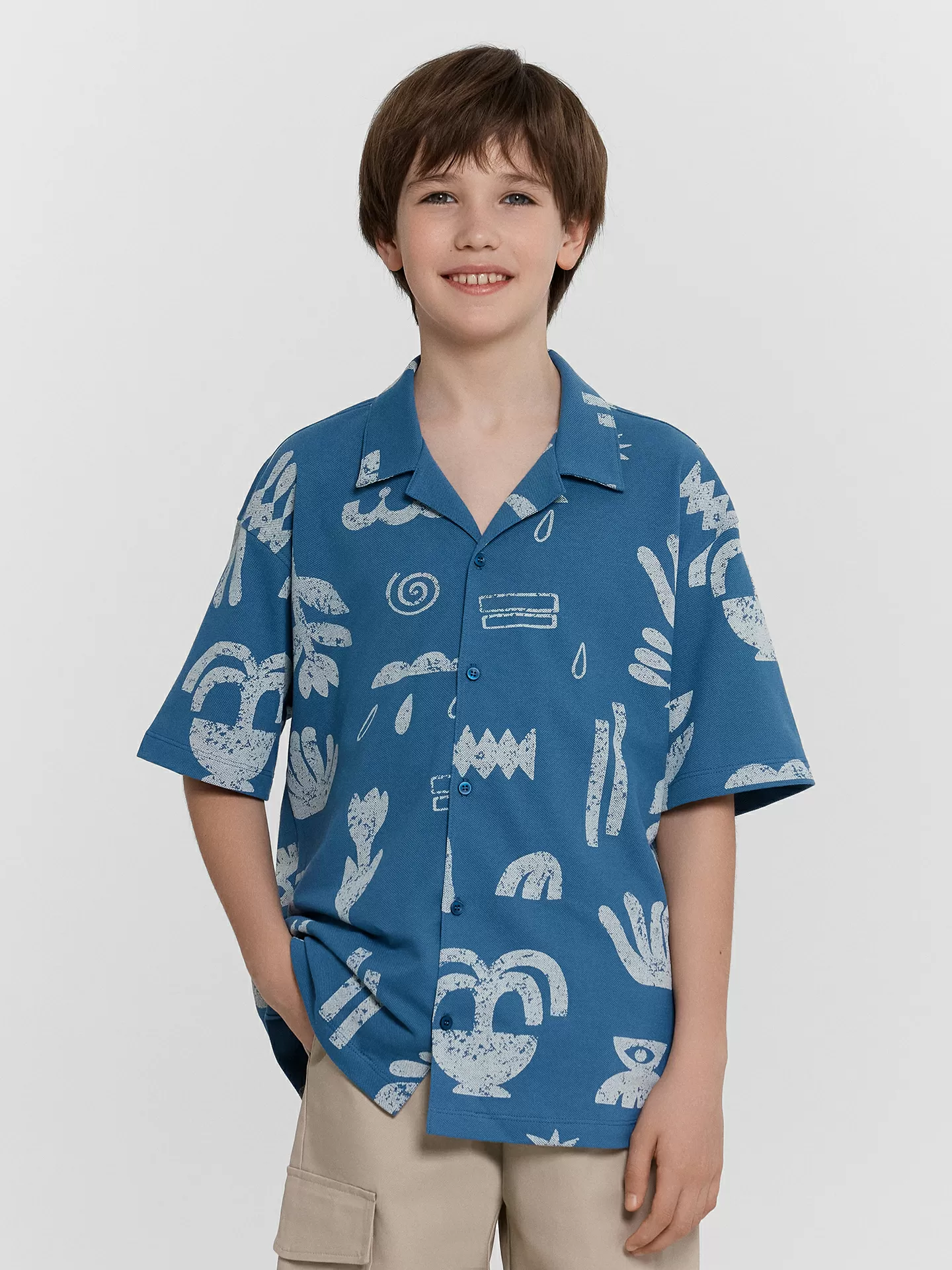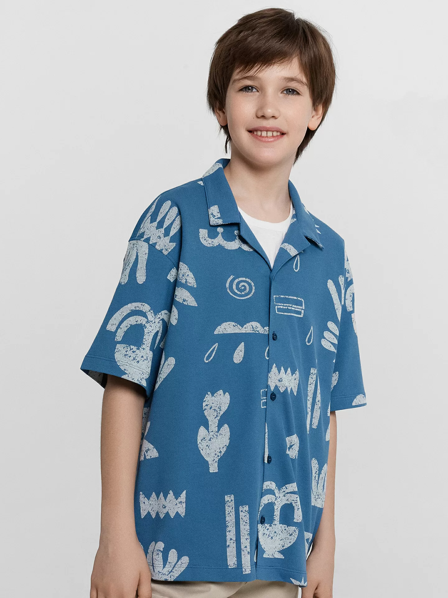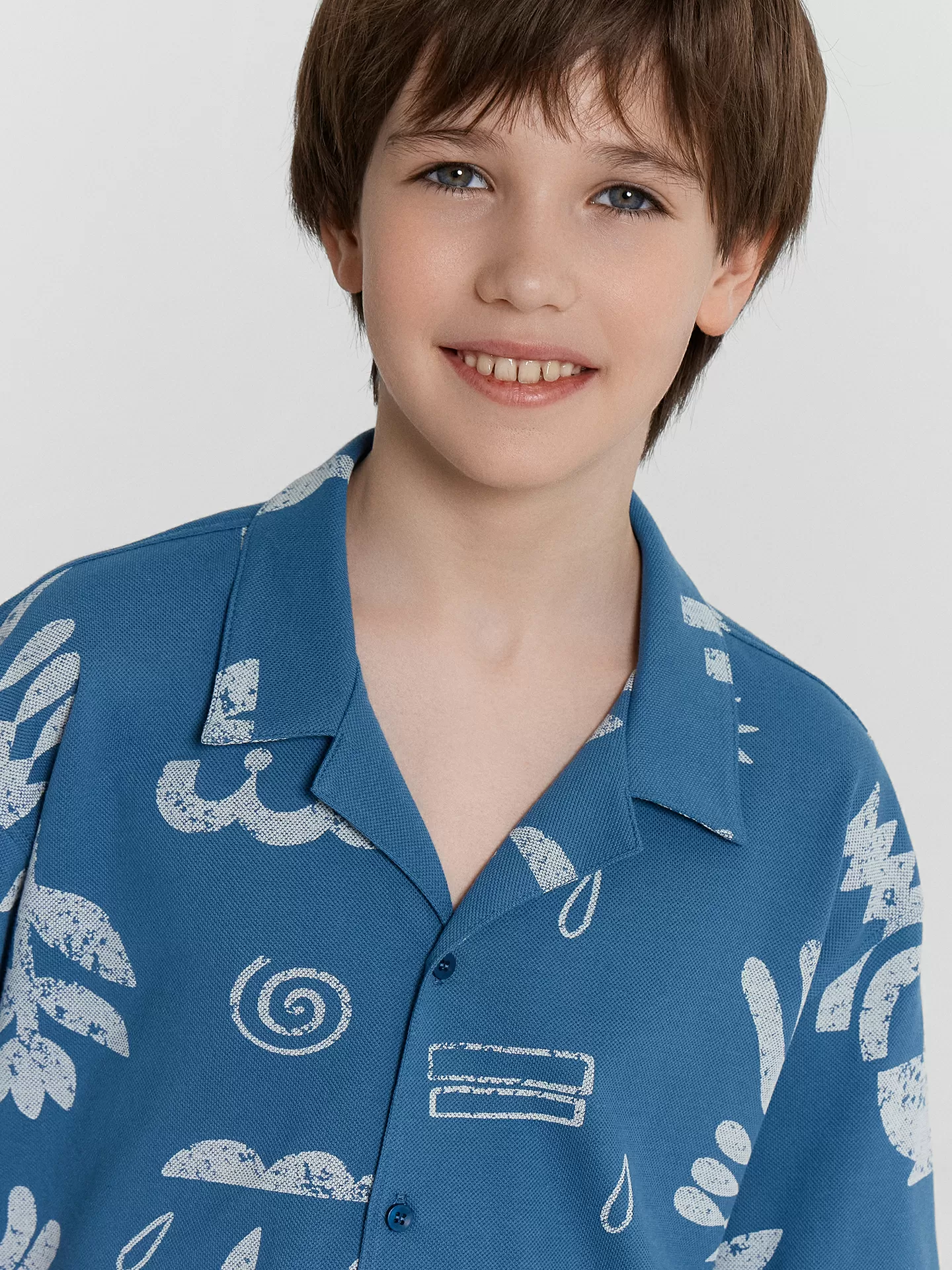 Сорочка верхняя для мальчиков прямого силуэта с воротником. По переду обработана застежка на пуговицы и петли. Диаметр пуговицы 1 см, 4 прокола. Рукава короткие, втачные, слегка спущены. На спине кокетка. Нижние срезы изделия и рукавов обработаны швом в подгибку.