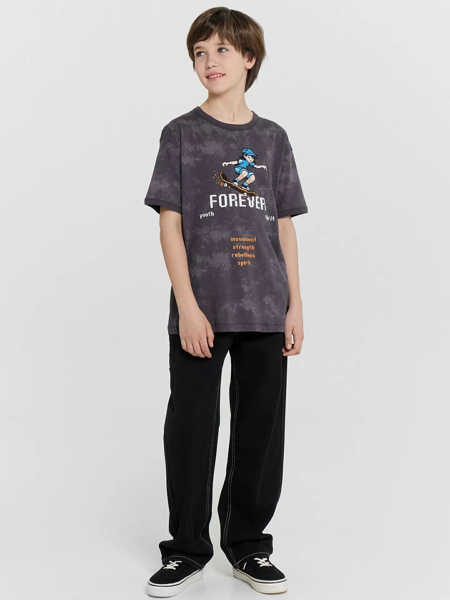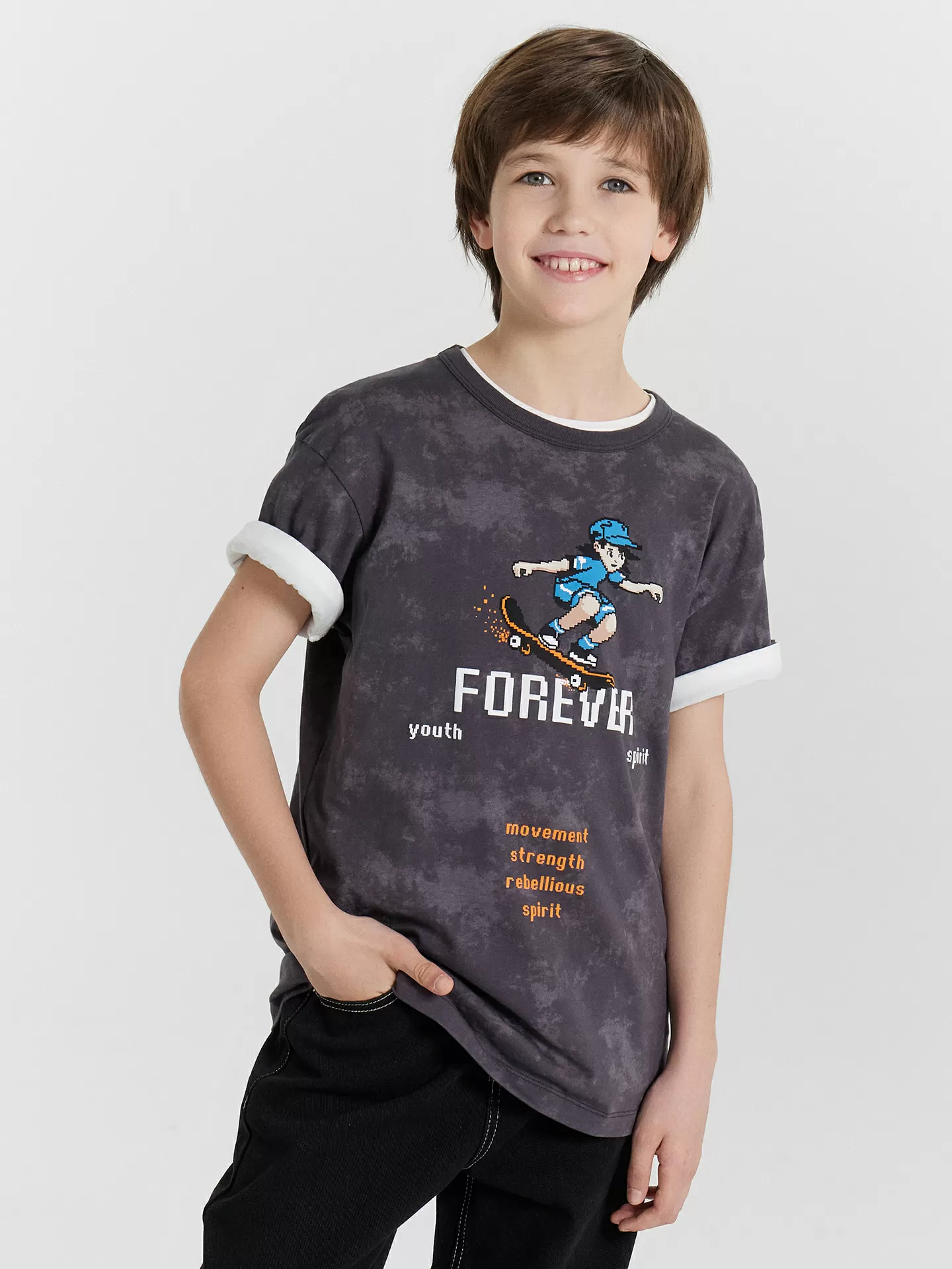 Джемпер для мальчиков свободного силуэта. Рукава втачные короткие. Горловина круглой формы. Горловина и низы рукава окантованы рибаной. Низ футболки обработан швом вподгибку на 2-ух игольной плоскошовной машине.