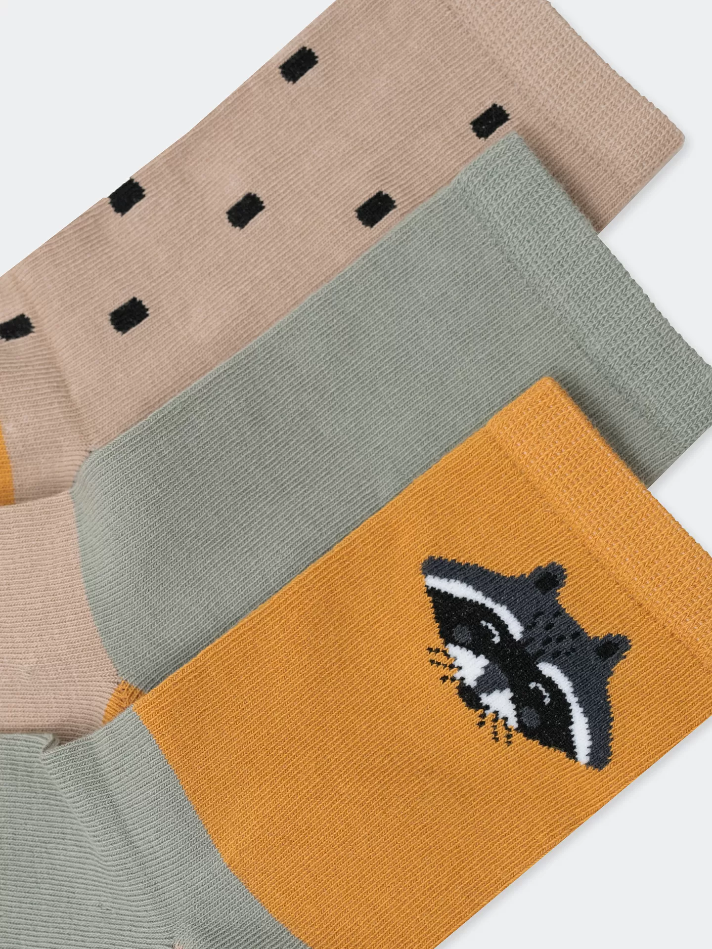 рис.2071 Мультипак из гладких детских носков с рисунком в виде енота и черточек.