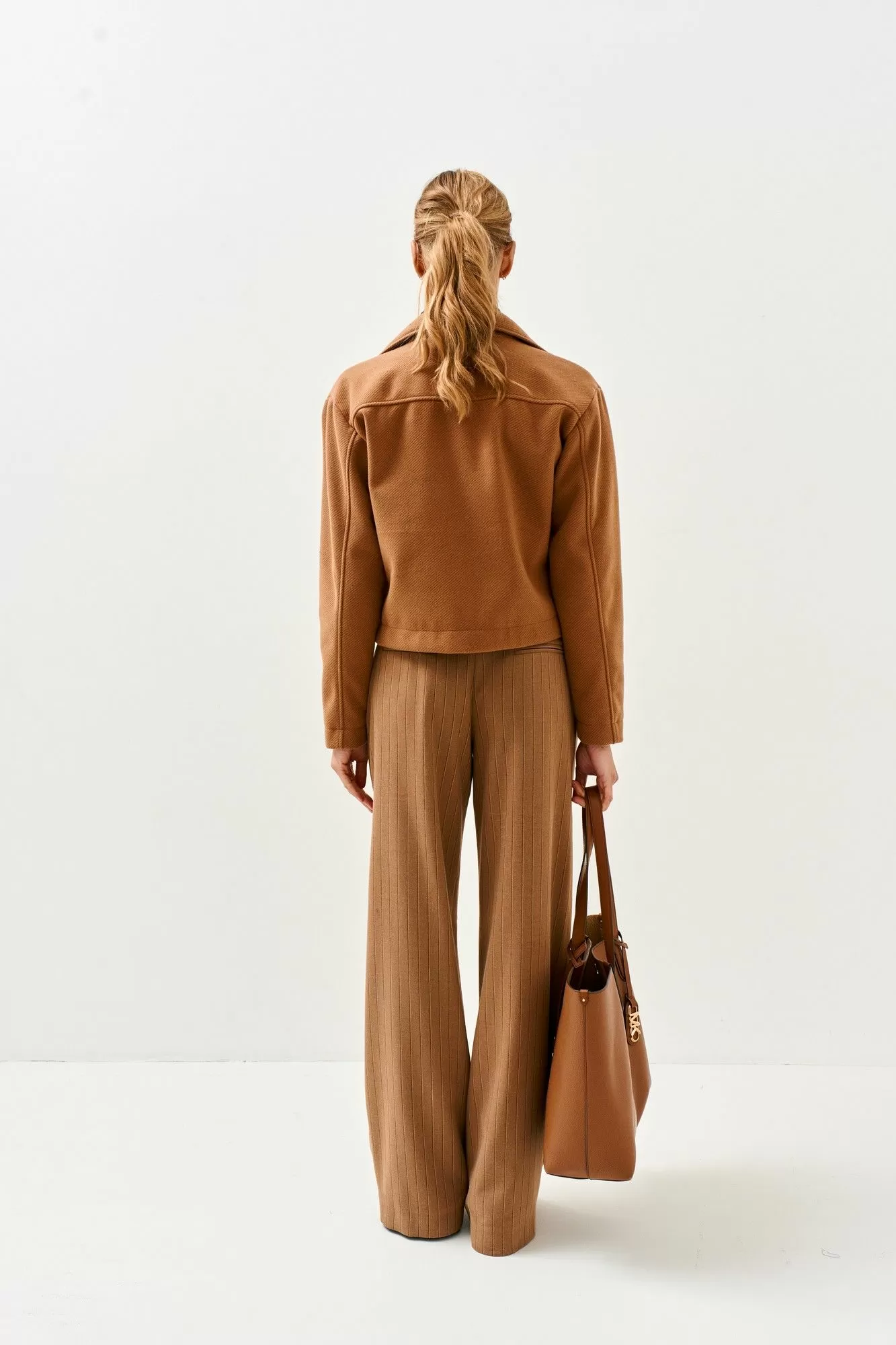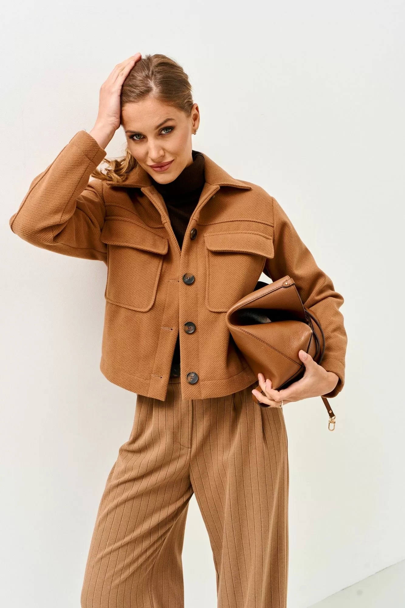 Жакет женский на подкладке с центральной бортовой застежкой на петли, пуговицы. Воротник стояче отложной. Рукав втачной двухшовный. Детали переда и спинки с кокетками. На деталях переда обработаны накладные карманы с клапанами.