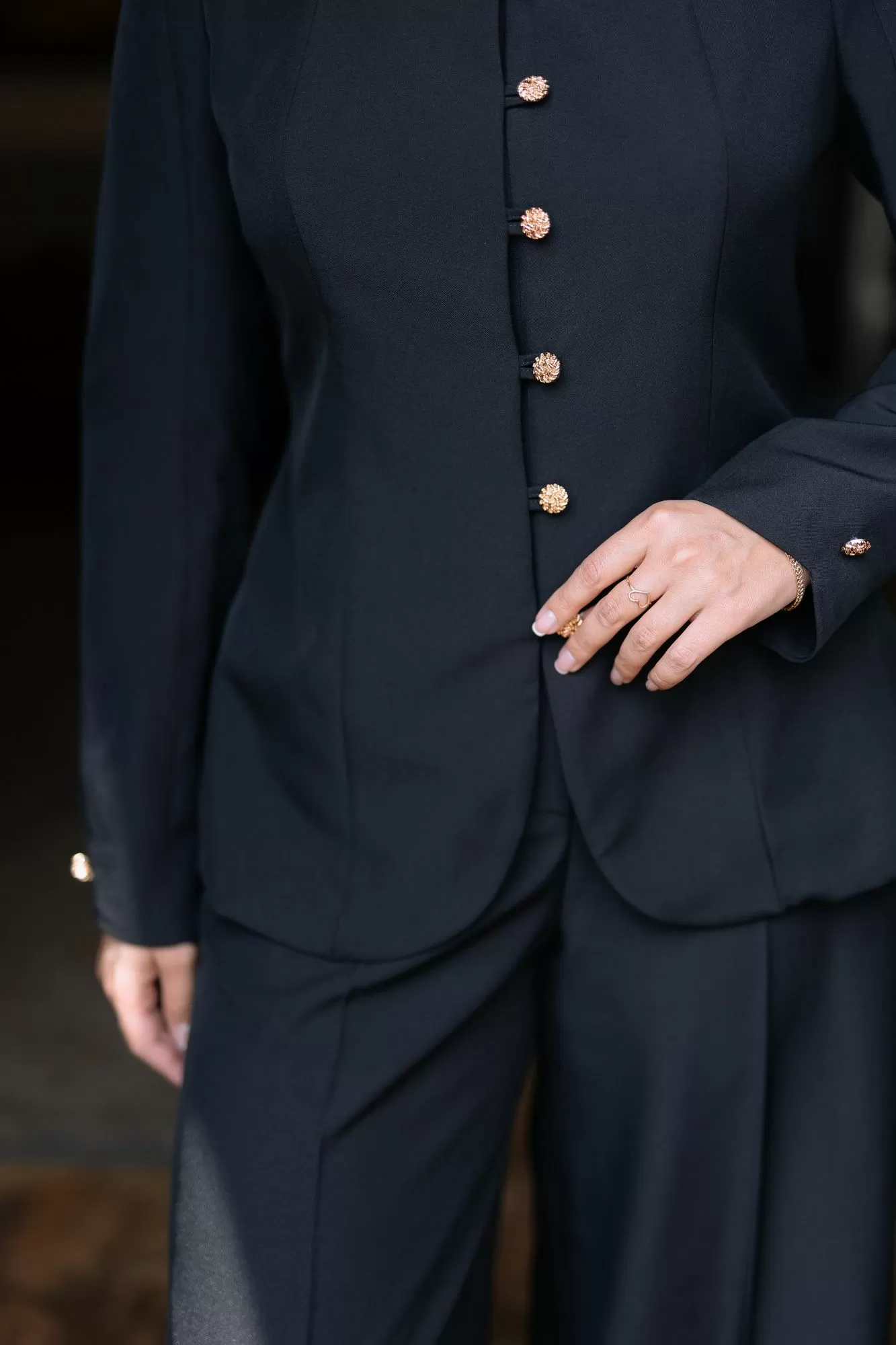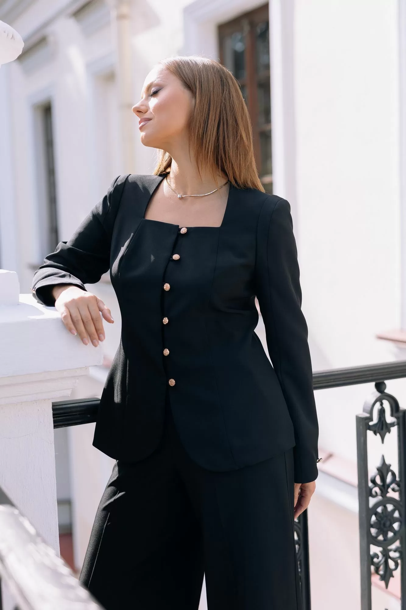 Супер удобный костюм для работы или школы! С первого взгляда восхищает своим уникальным дизайном: квадратный вырез, застежка на золотые пуговицы создают потрясающий модный воздушный образ!