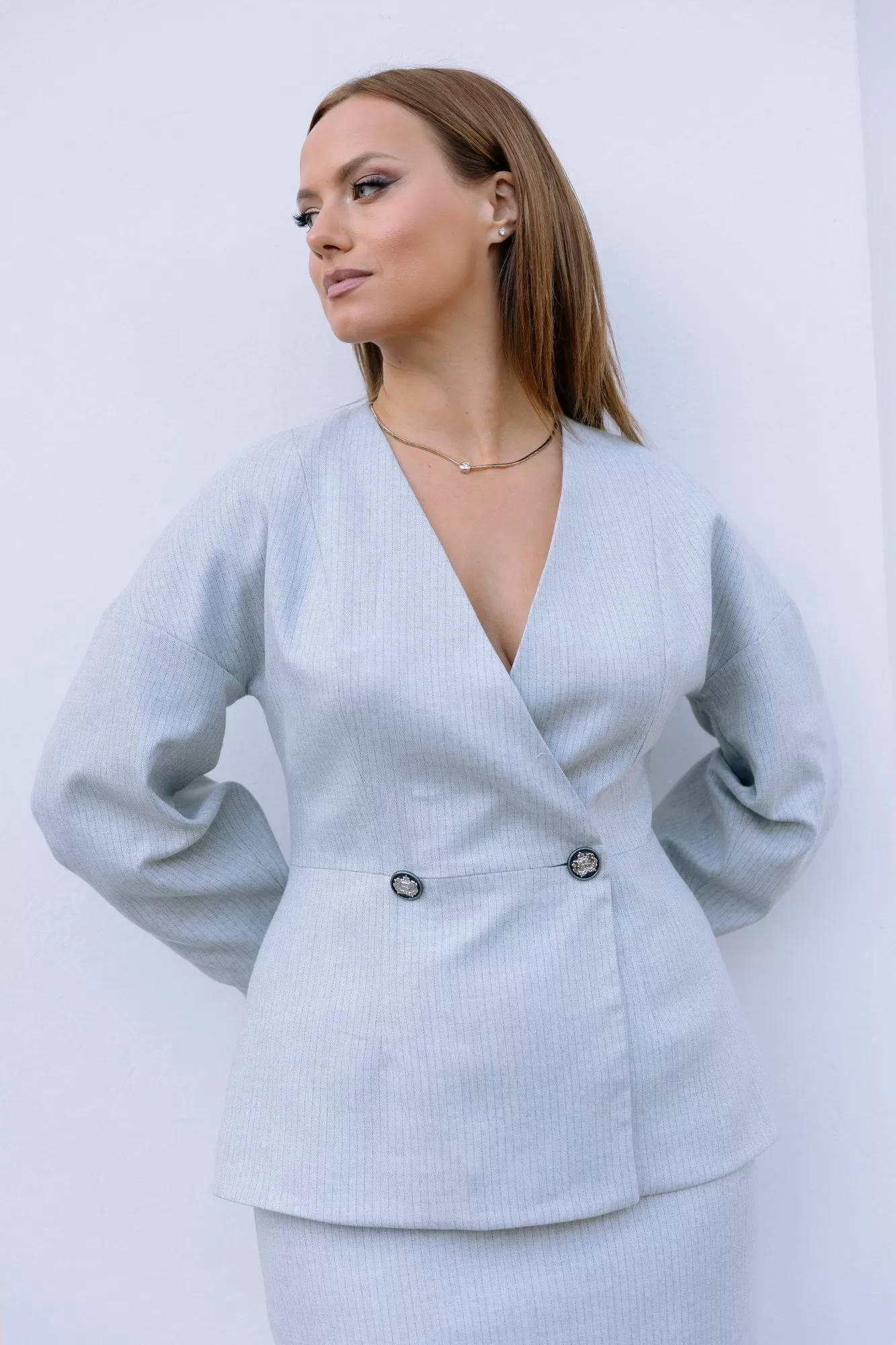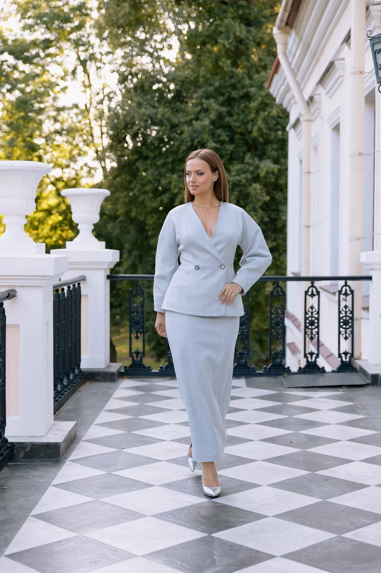 Жакет на запах. Застежка на пуговицы. На подкладке. Очень интересный крой. Рукав 3/4, длина от шеи 71-73 см. Юбка длиной миди, на притачном поясе. Задняя половинка с талиевыми вытачками, со средним швом, заканчивающийся разрезом. Пояс с застежкой петлю и пуговицу. Длина юбки по боковому 100 см