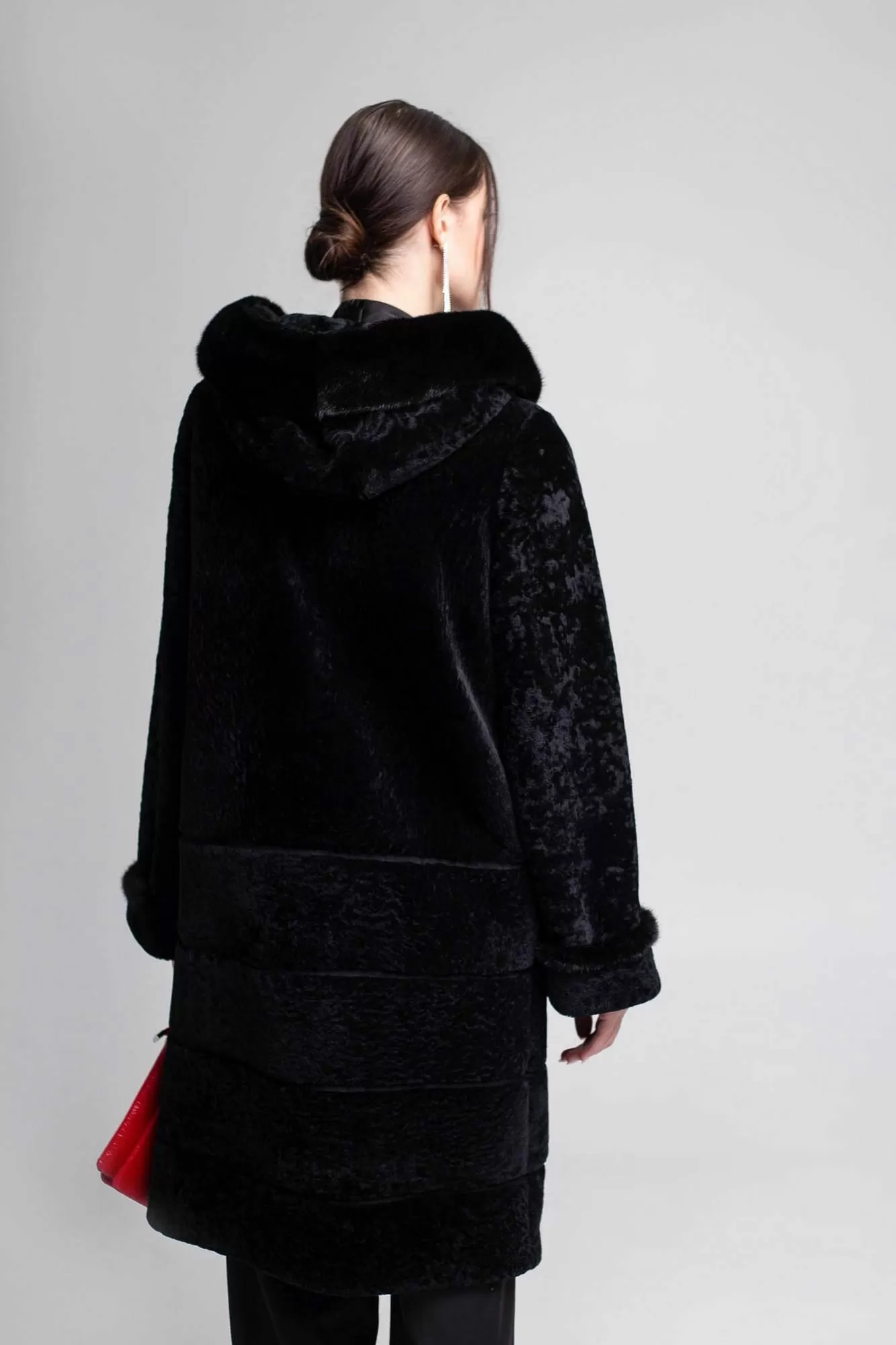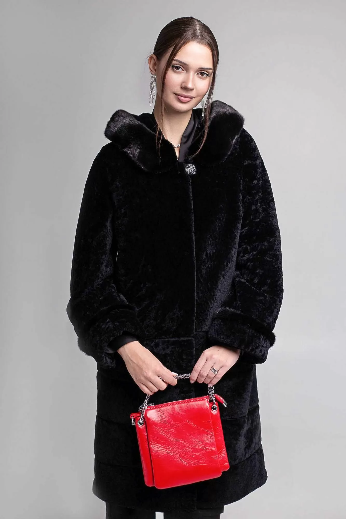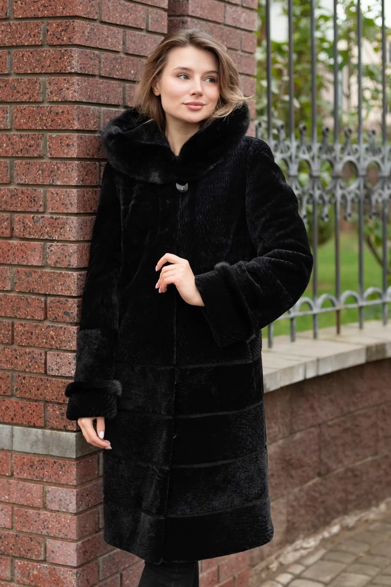 Пальто Линия 19 из овчины (астраган) прямого силуэта. Длина изделия 100 см. Полочки и спинка до бедра цельные, ниже - росшив с замшей. Полуреглан рукав. Норковый кант на манжетах рукавов. Классический глубокий капюшон выступает отличной заменой шапке. Капюшон оторочен норкой. Классическая модель с застежкой на крючки и прорезными карманами.
