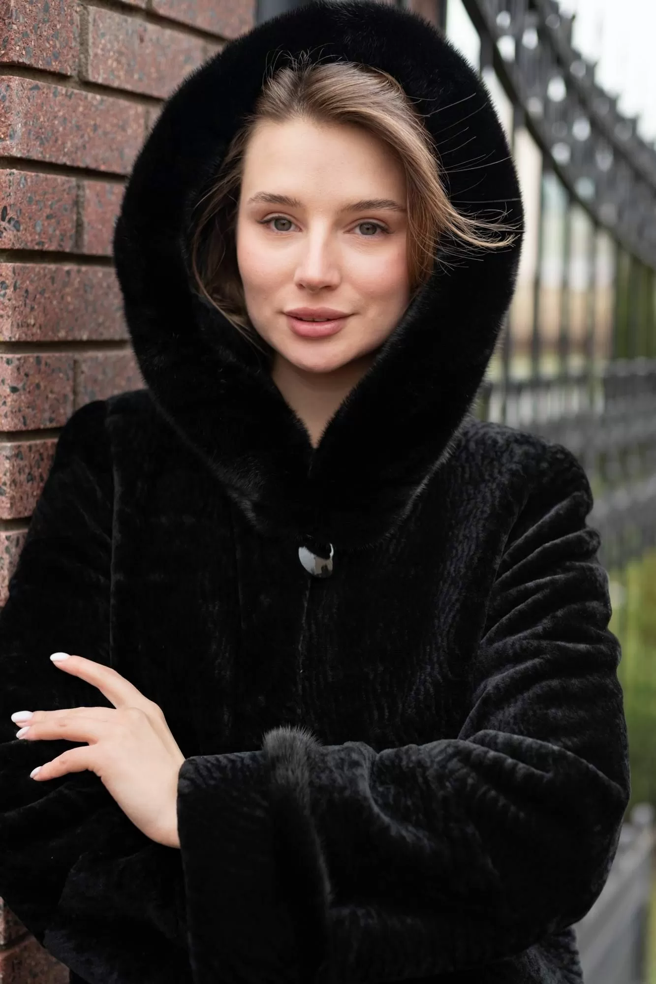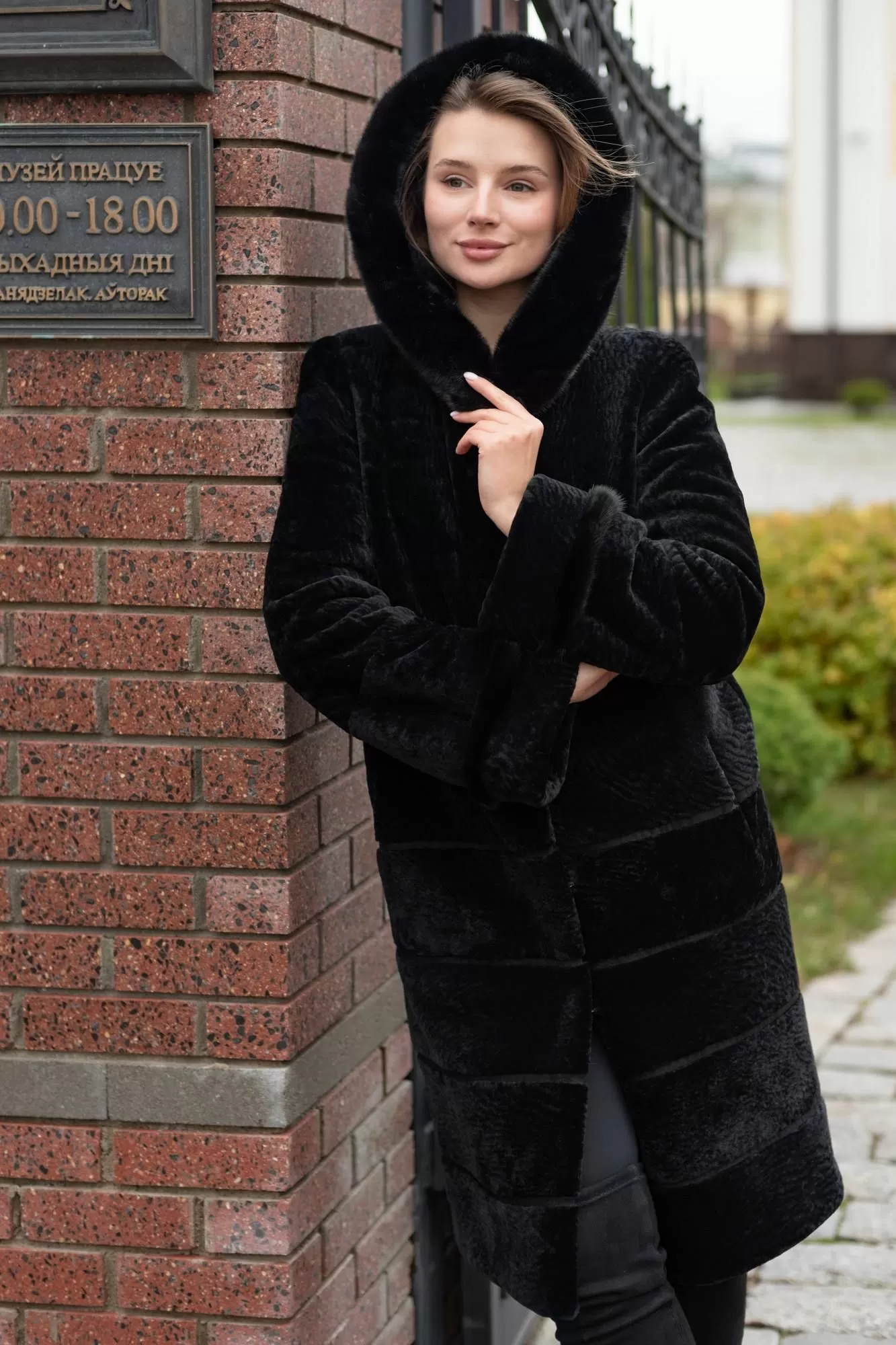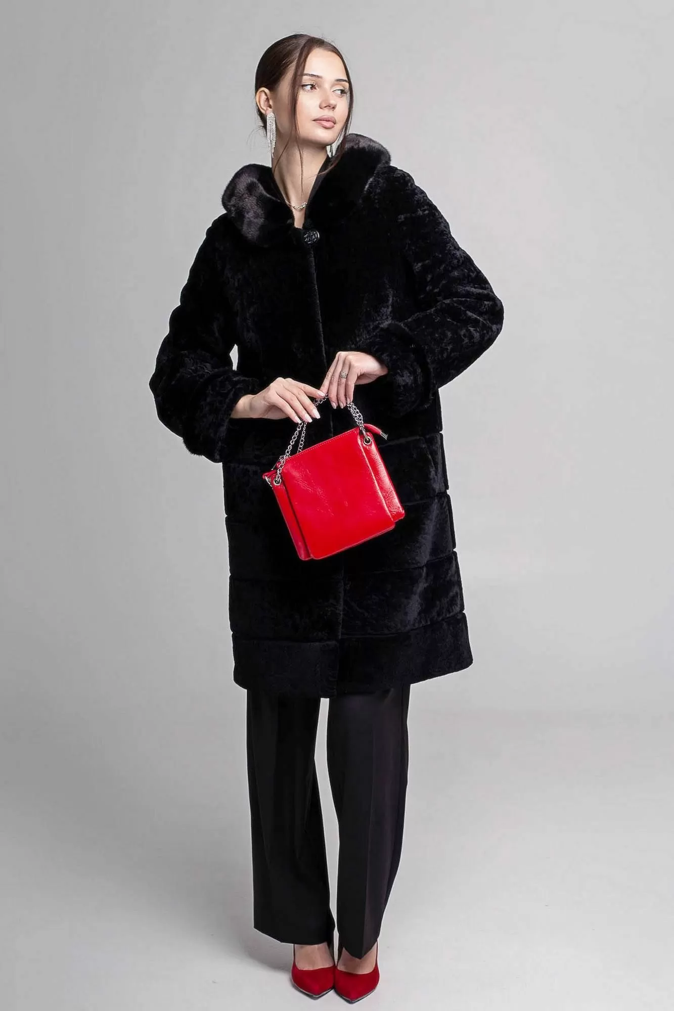 Пальто Линия 19 из овчины (астраган) прямого силуэта. Длина изделия 100 см. Полочки и спинка до бедра цельные, ниже - росшив с замшей. Полуреглан рукав. Норковый кант на манжетах рукавов. Классический глубокий капюшон выступает отличной заменой шапке. Капюшон оторочен норкой. Классическая модель с застежкой на крючки и прорезными карманами.