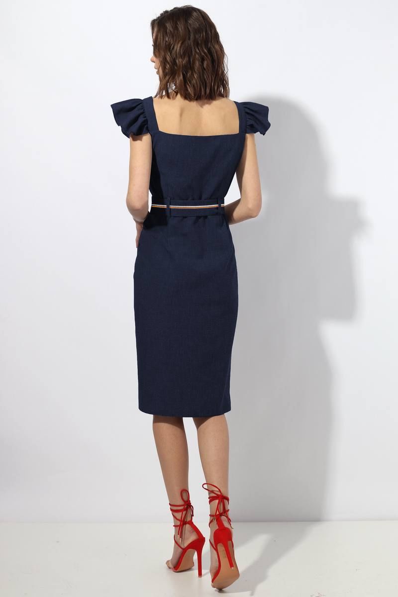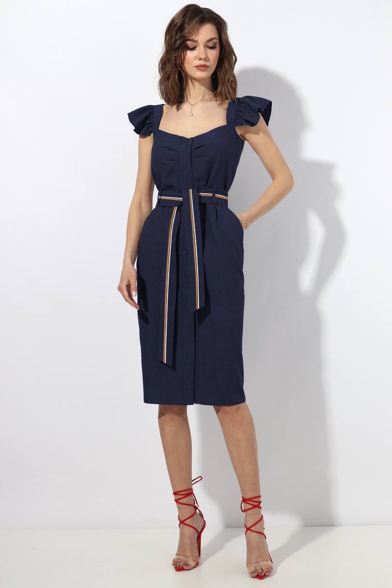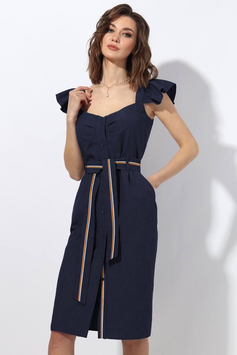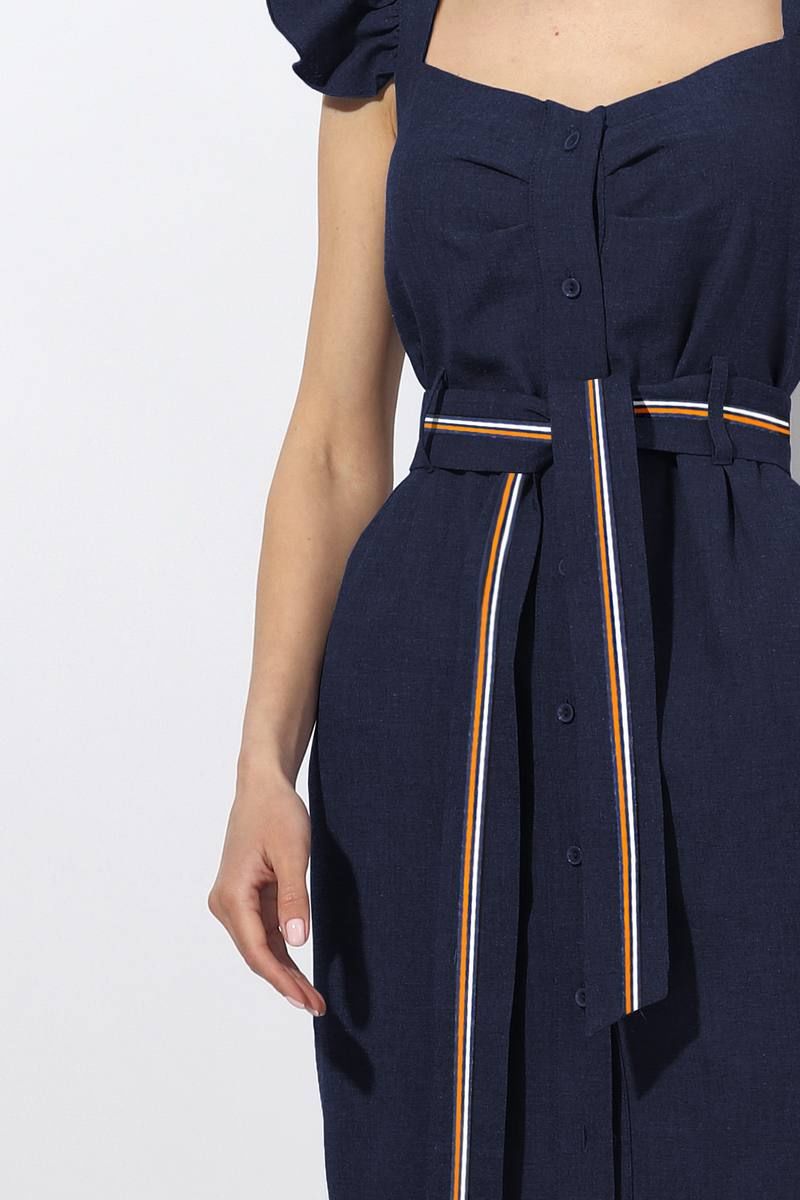 Платье женское прилегающего силуэта отрезное по линии талии. По центру полочки планка с застёжкой на петли пуговицы. В боковых швах карман с отрезным бочком. По линии плеча бретель с "крылышком" (собранным на сборку). По линии талии завязывающийся пояс. По поясу и по нижей планке в застежке настрочена отделочная тесьма. Длина изделия по спинке 102 см (с бретелью ), 89 см ( без бретели). Ширина "крылышка" с бретелью 11 см. Цвет: темно-синий.