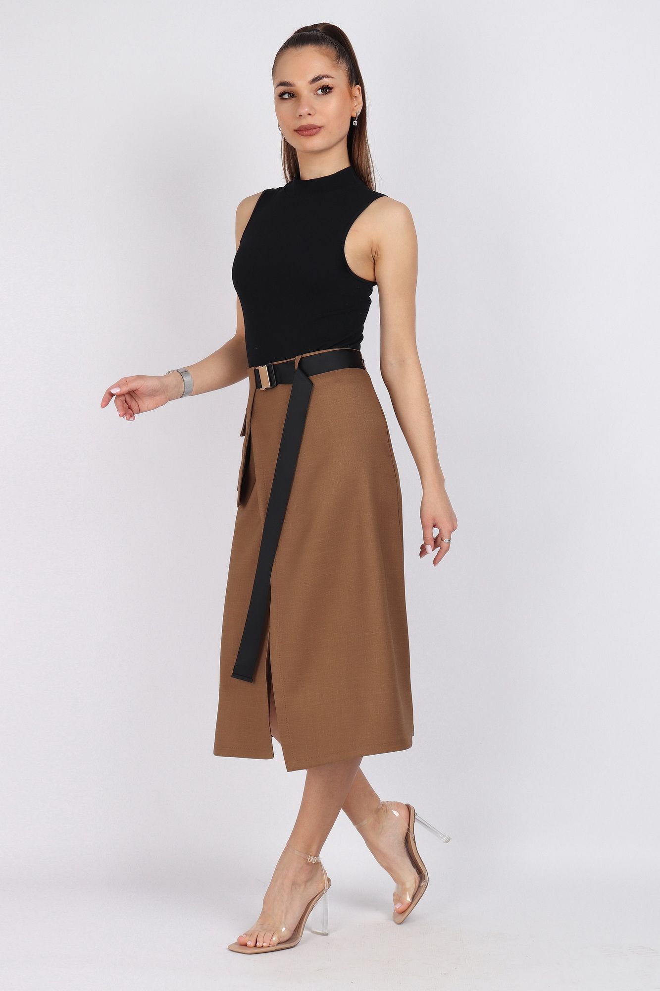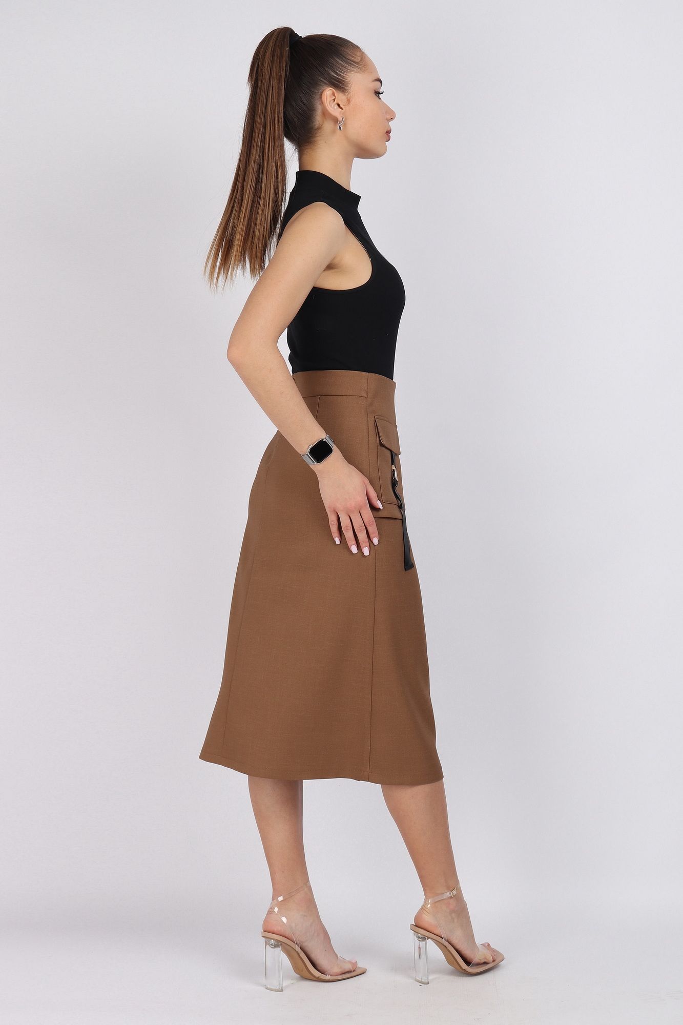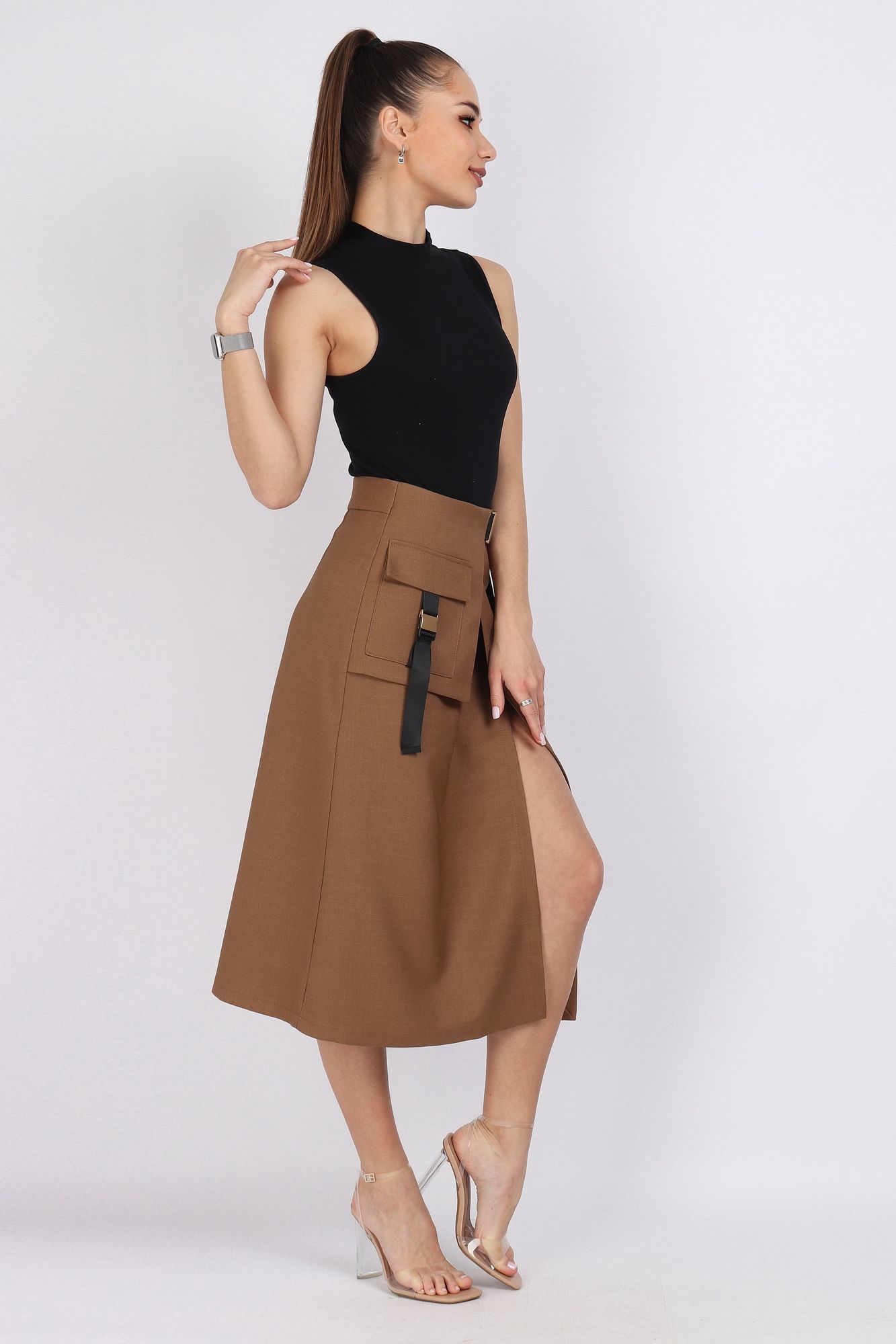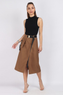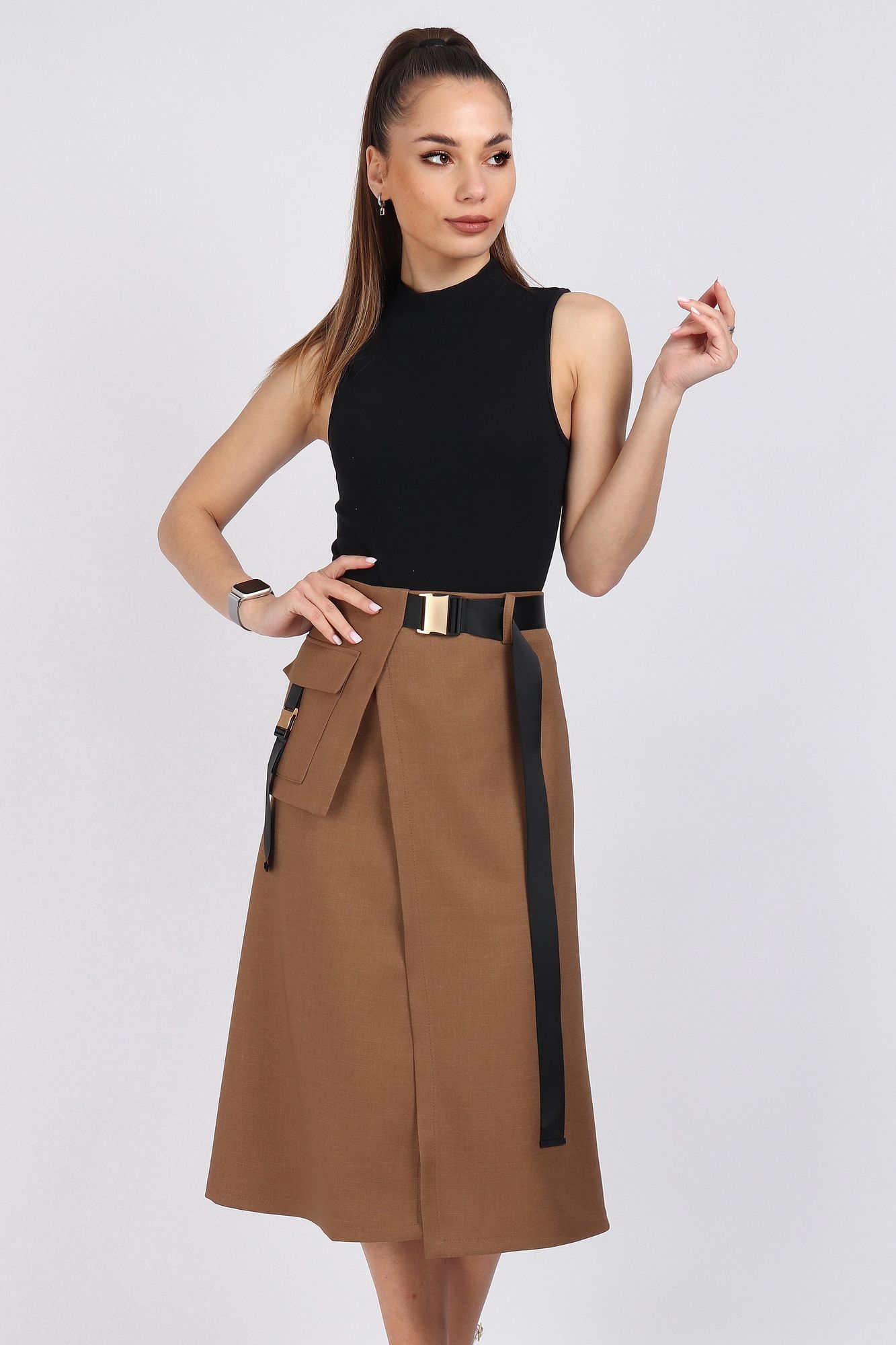 Юбка женская А-силуэта на запах. С правой стороны декоративные элементы функционального накладного кармана. Верхний срез юбки обработан обтачкой. На талии и на кармане декоративные функциональные пряжки. На конце тесьмы декоративные зажимы. По спинке застёжка на потайную тесьму молния. Юбка без подкладки. Длина изделия 76 см. Подойдет на рост 164-170 см. Цвет основной ткани: светло-коричневый.