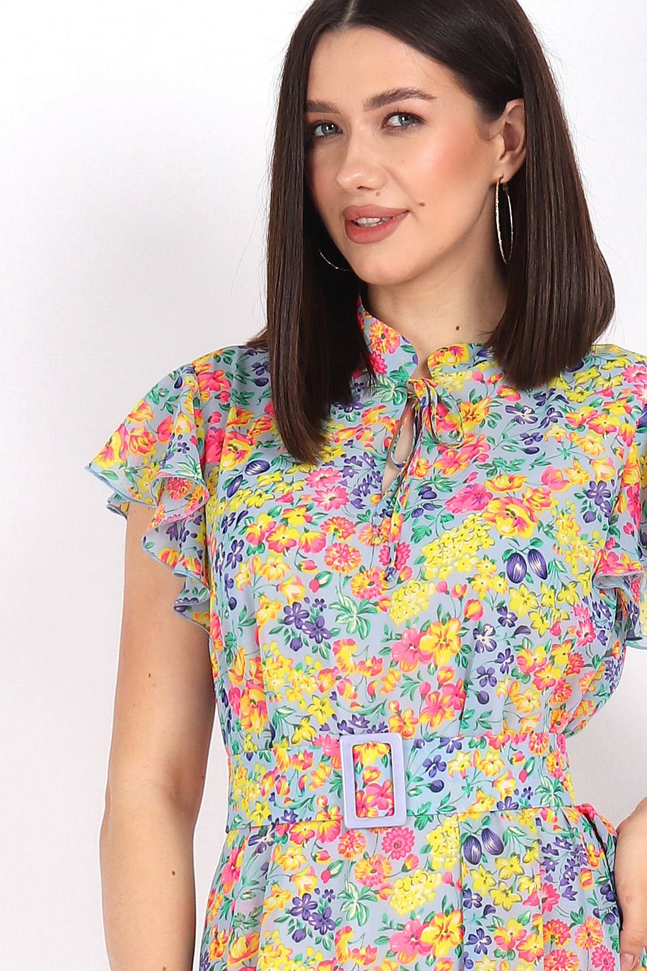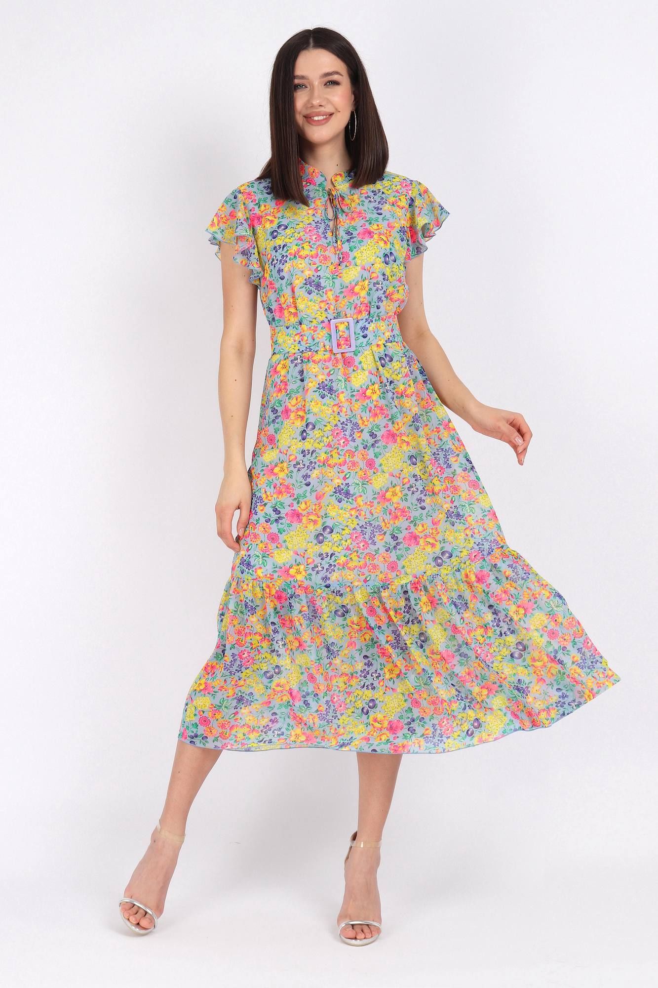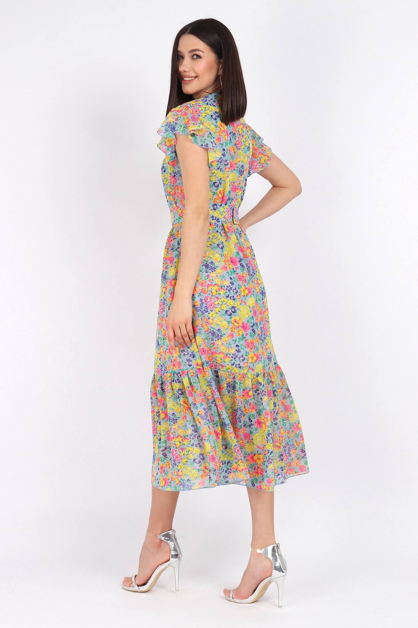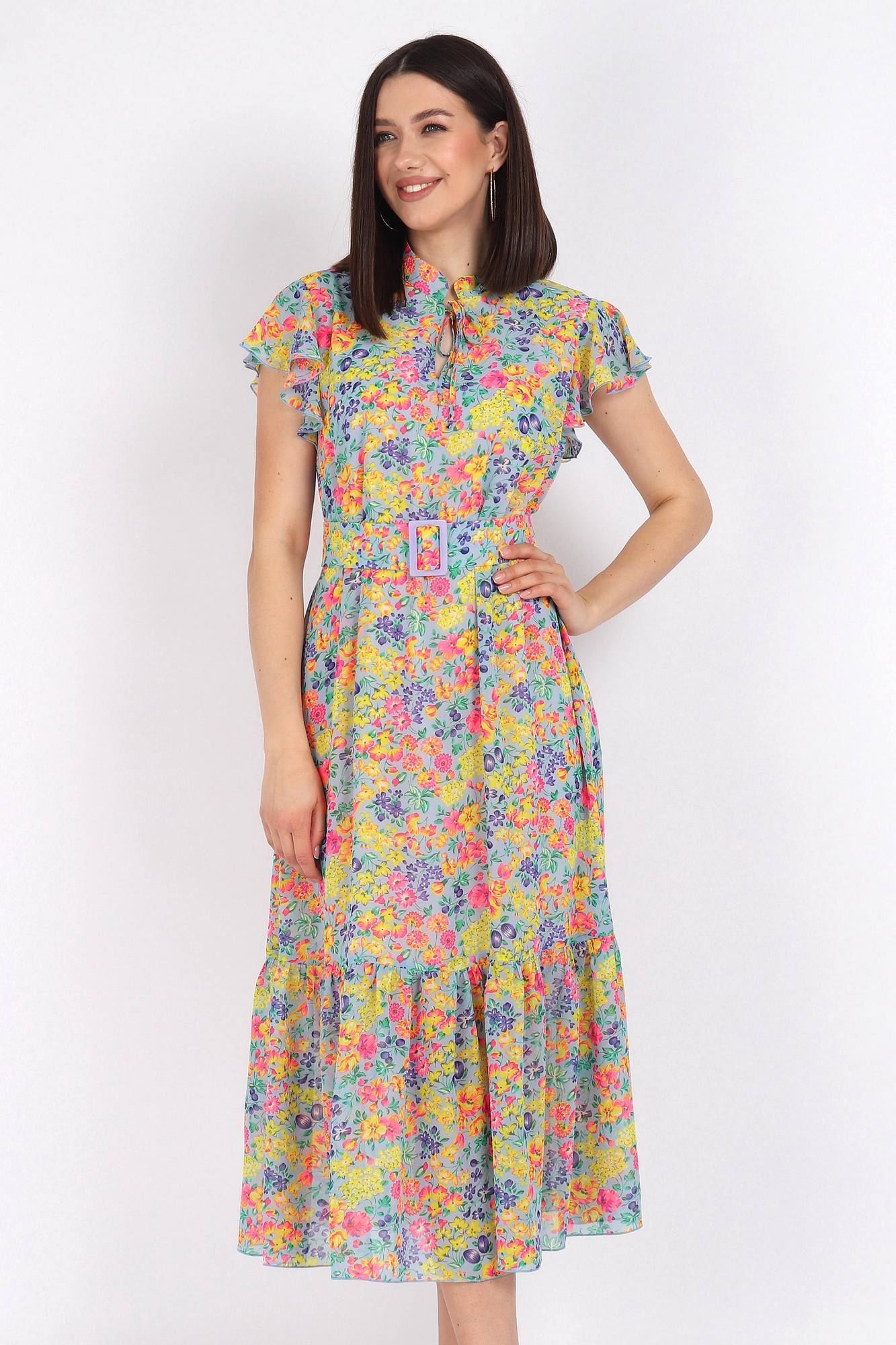 Платье женское прямого силуэта с отрезным воланом по низу. По горловине воротник стойка с завязками. На концах завязок декоративные наконечники. Рукав-крылышко. По линии талии пояс из основной ткани с пряжкой. Платье на трикотажной подкладке. Длина изделия 125 см, длина плечевого шва с крылышком от начала горловины 25 см. Подойдет на рост 164-170 см.