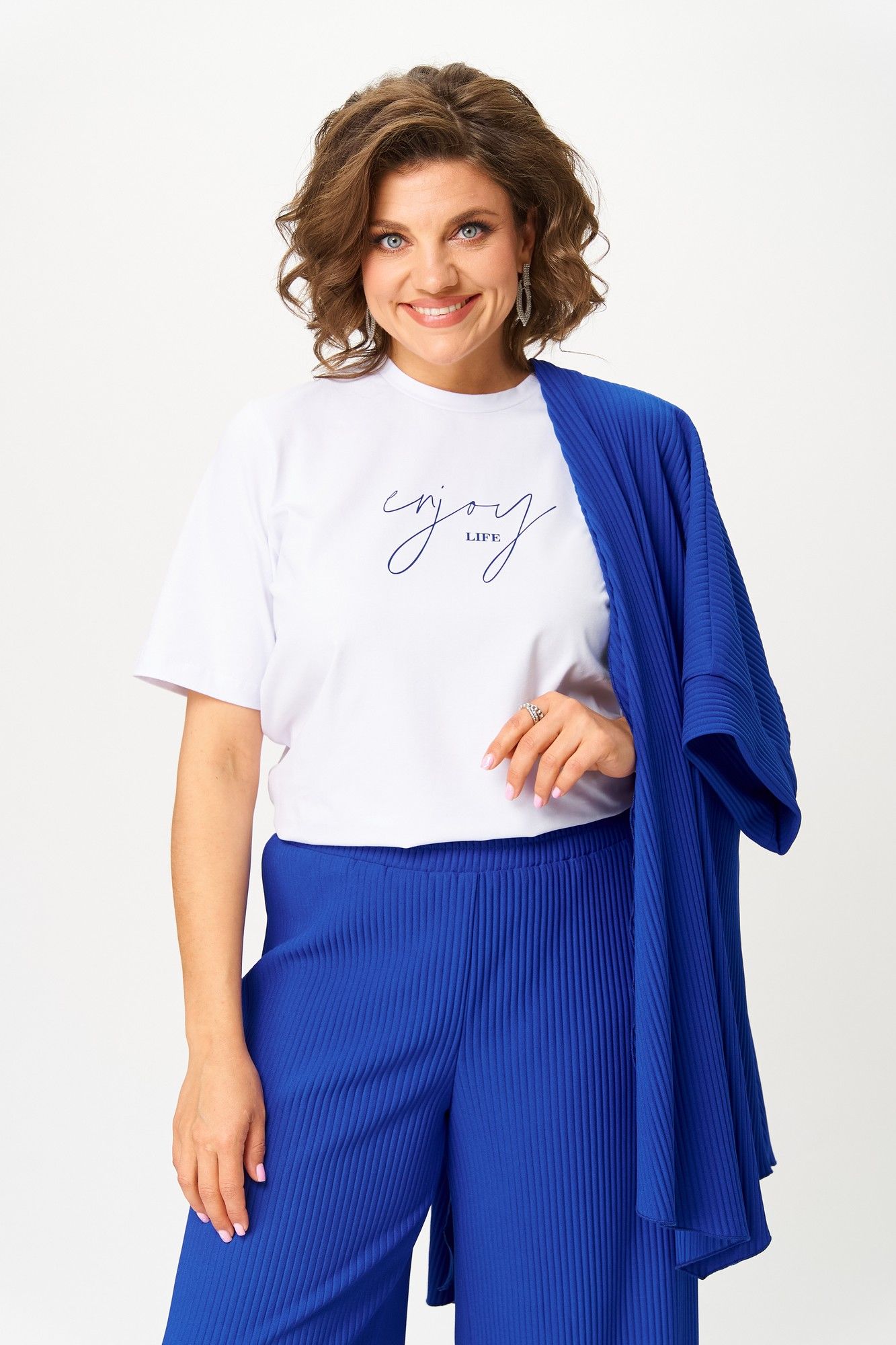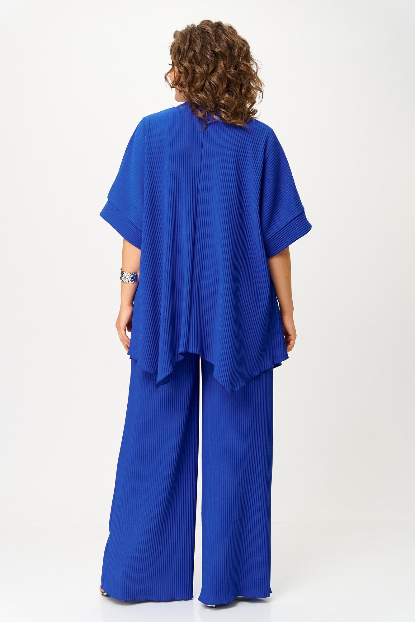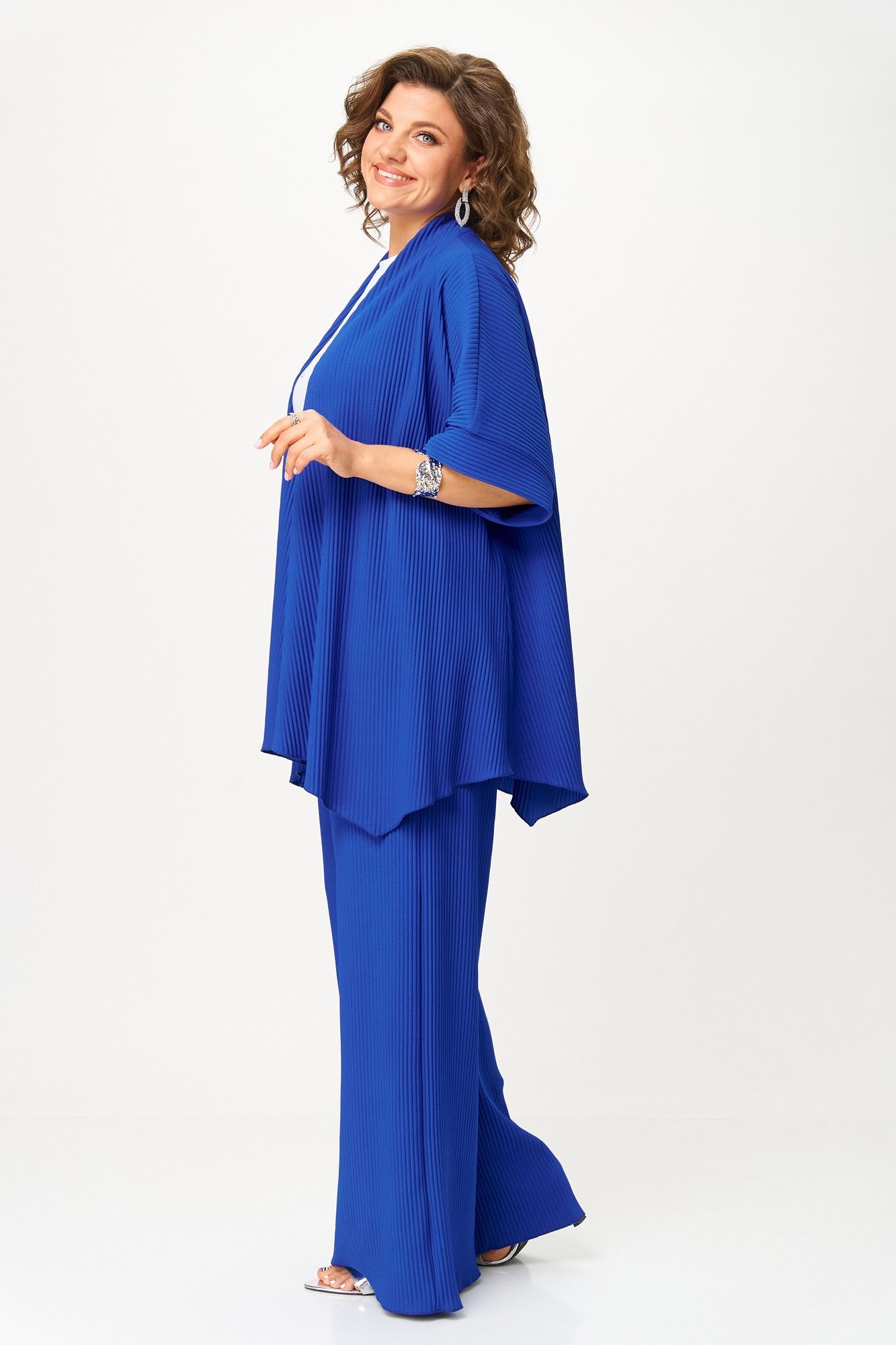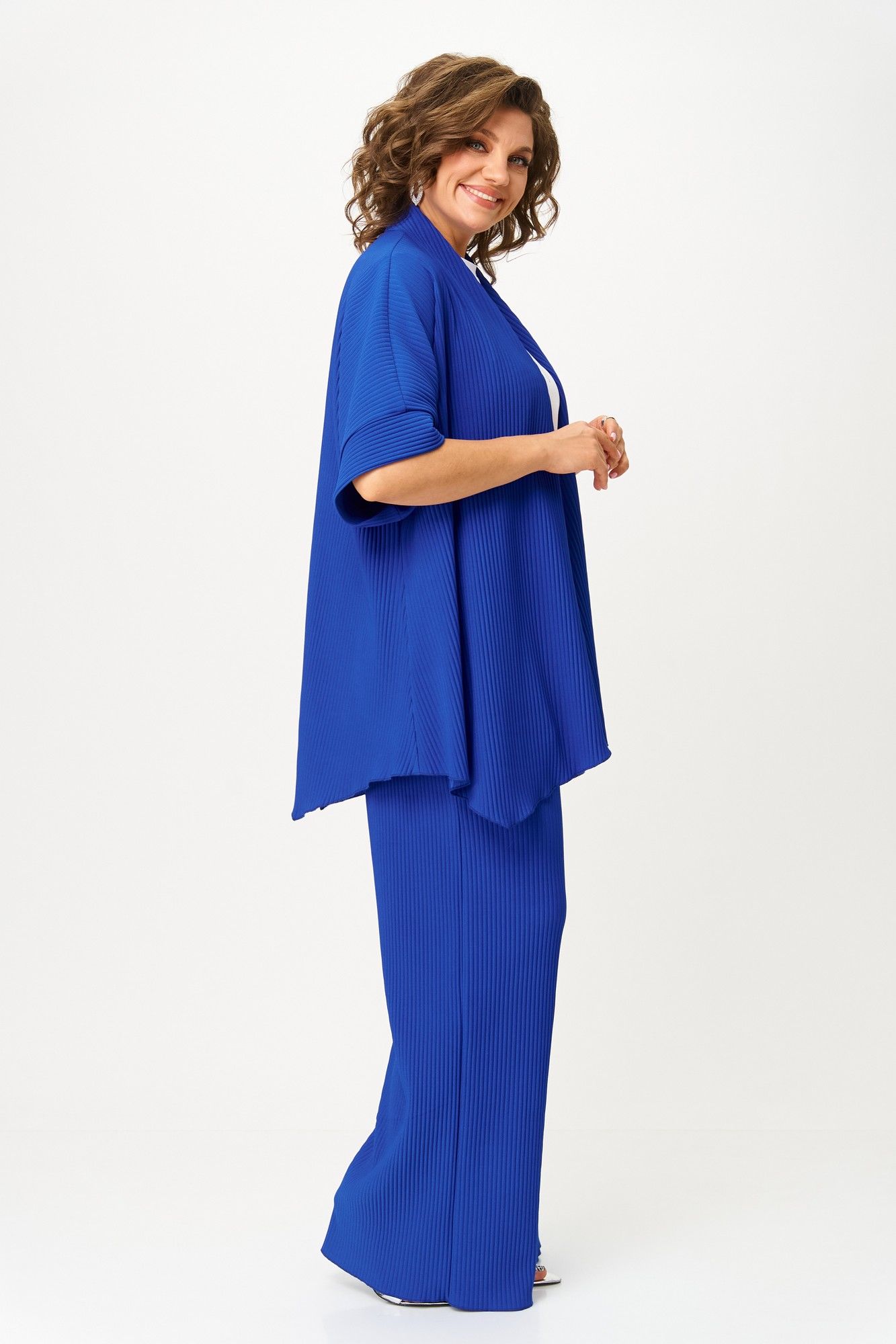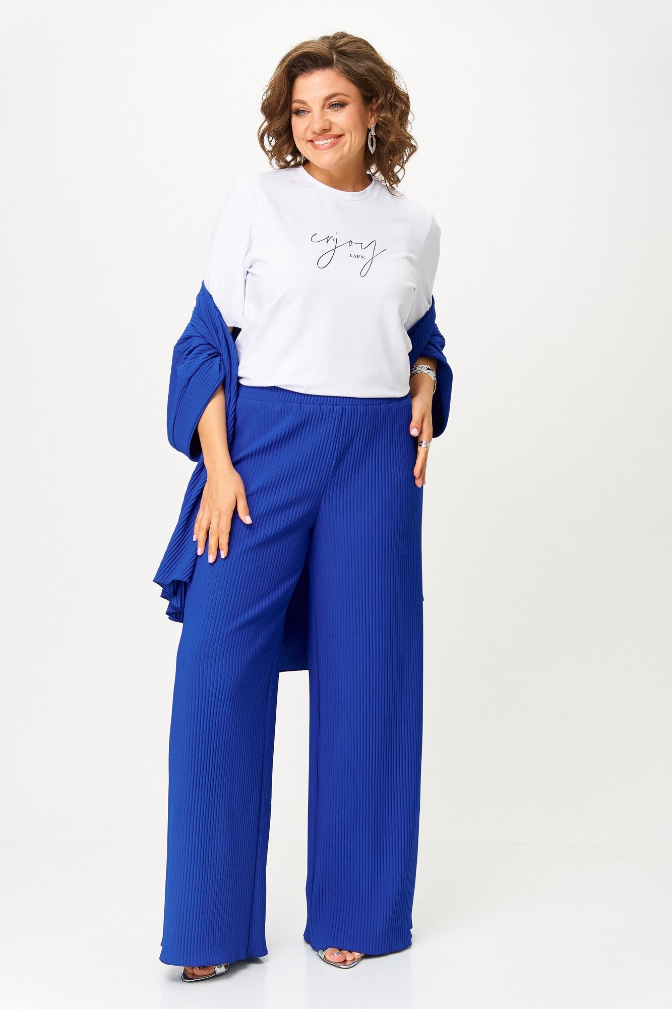 Элегантный женский костюм-тройка — идеальный выбор для повседневных и нарядных образов. В его состав входит стильный кардиган из плиссированного однотонного трикотажа с распашной застежкой, коротким цельнокроеным рукавом с притачной манжетой и фигурным низом, а также длинные брюки-палаццо на эластичном поясе с резинкой — комфортные и модные. В комплект входит классическая белая футболка с коротким рукавом и принтом, которая отлично дополняет образ. Этот наряд подчеркнет вашу индивидуальность и создаст гармоничный стиль для любого случая. Длина брюк по боковому шву 112 см +/- 1-2 см, длина брюк по шаговому шву 82 см +/- 1-2 см, длина кардигана по спинке 74 см +/- 1-2 см